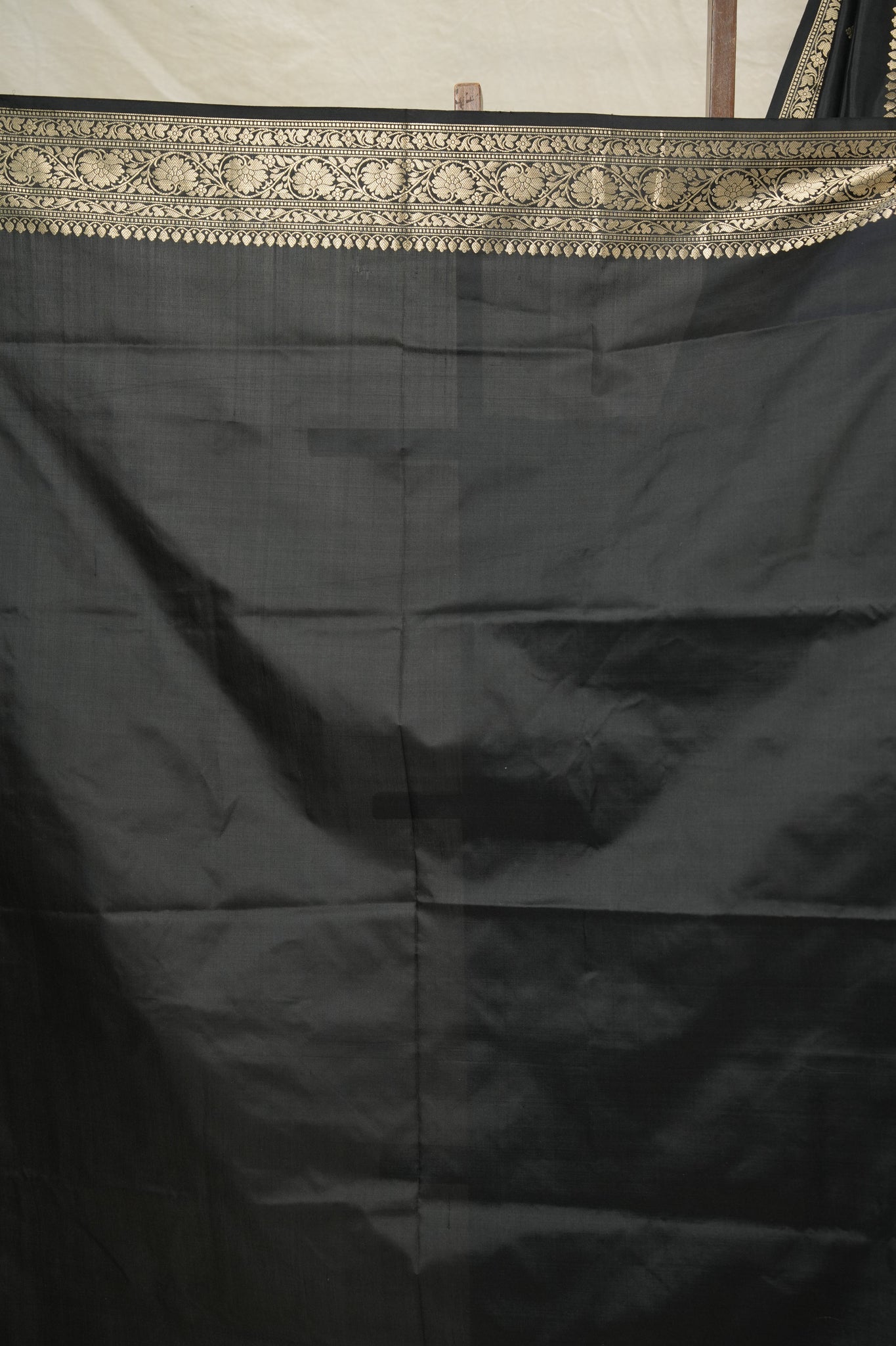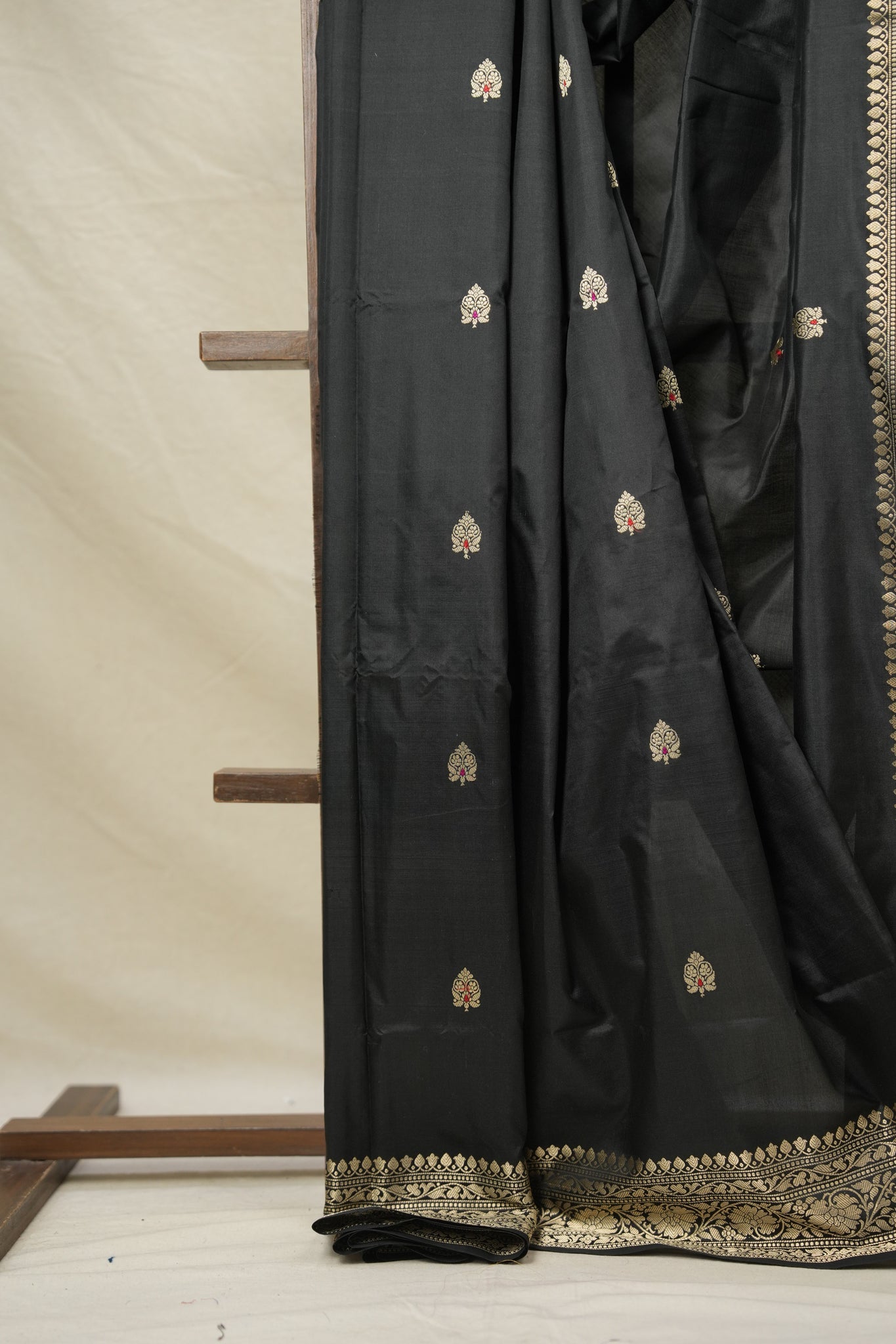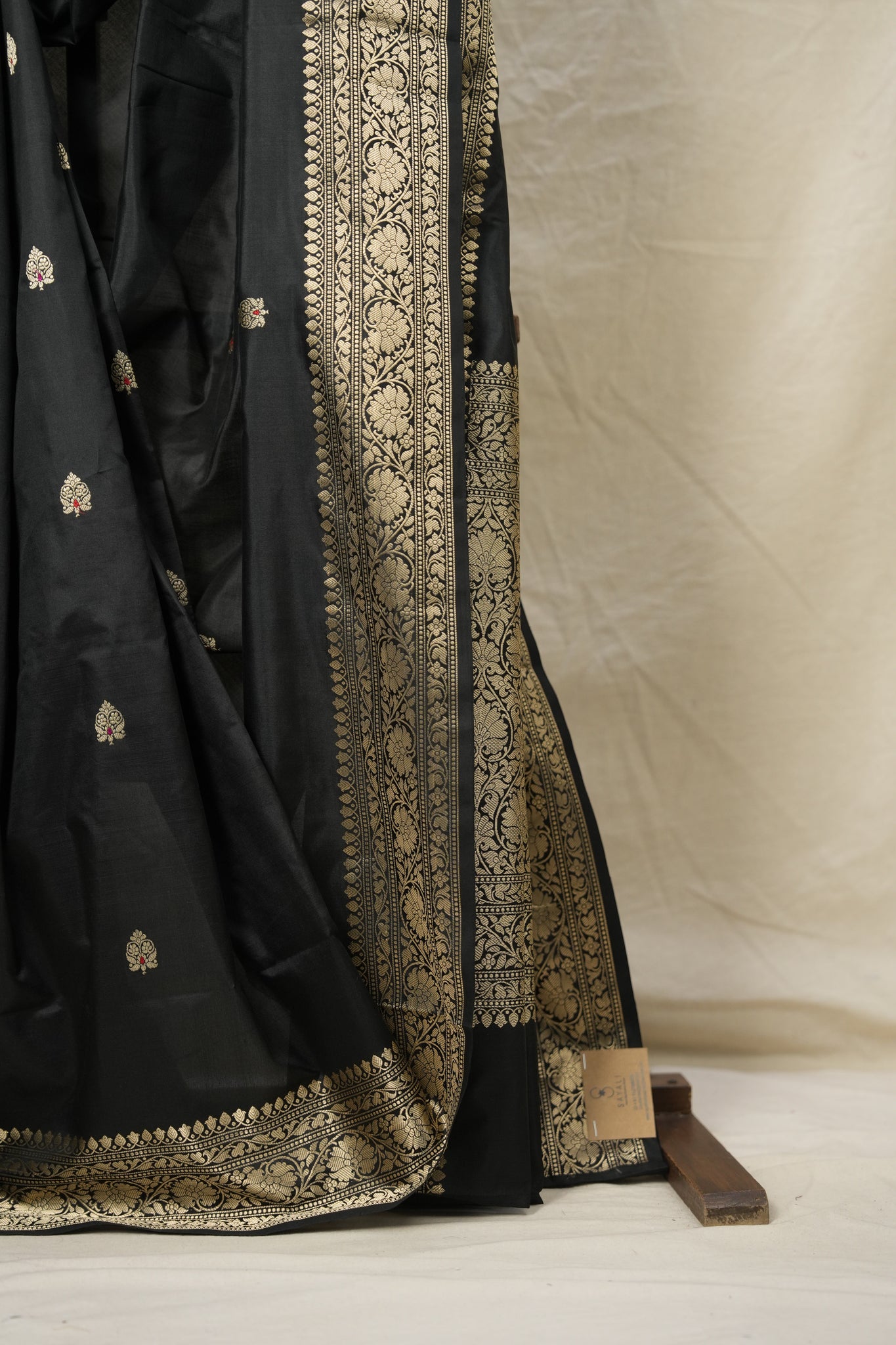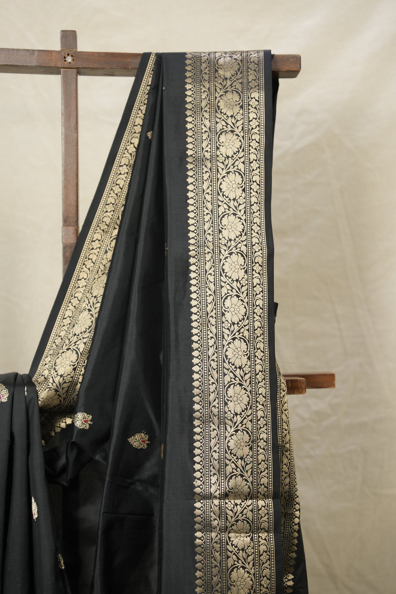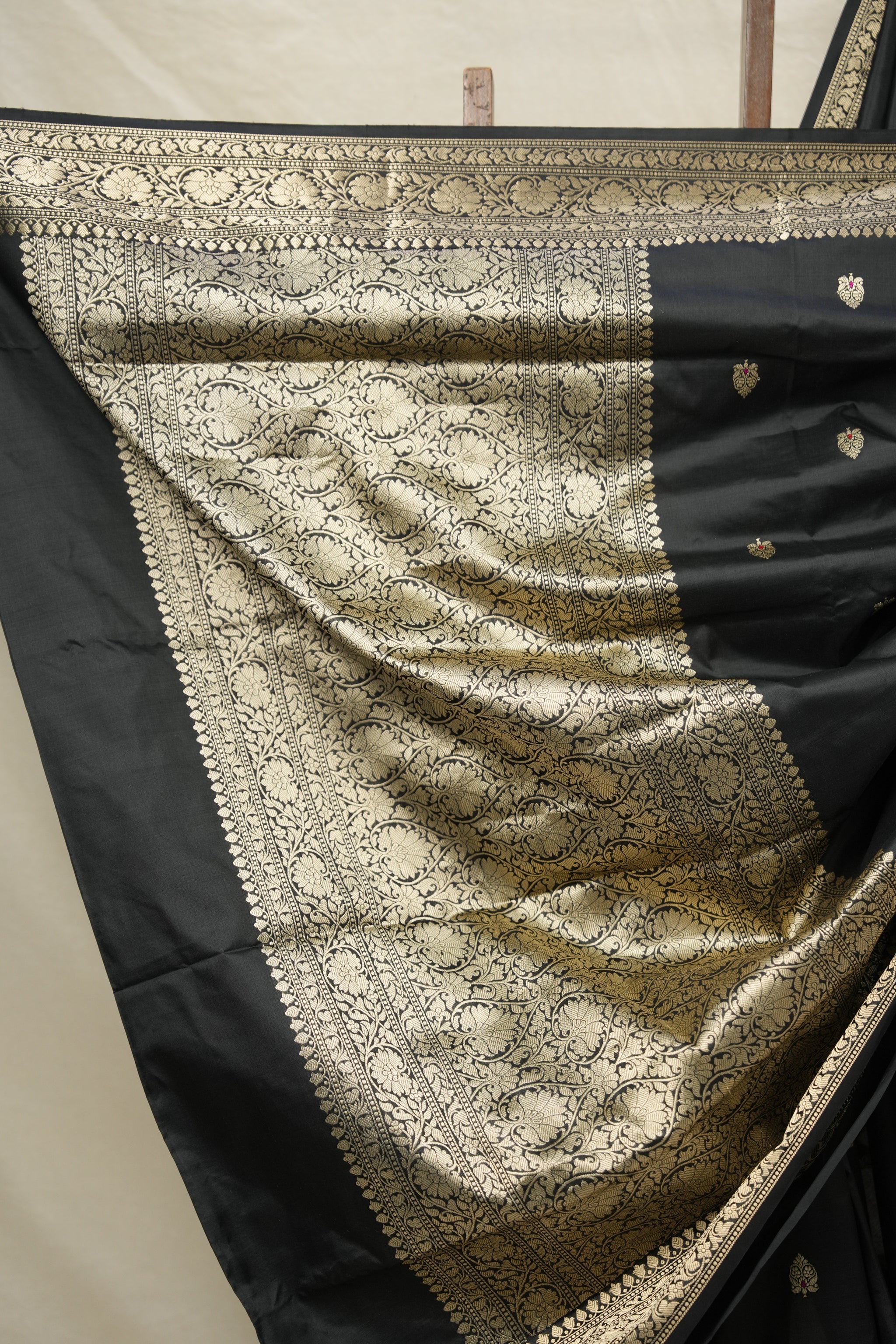 Work - This is a banarasi silk saree in a black base, featuring zari butti design across the body and a rich zari border and floral pallu with intricate traditional designs.