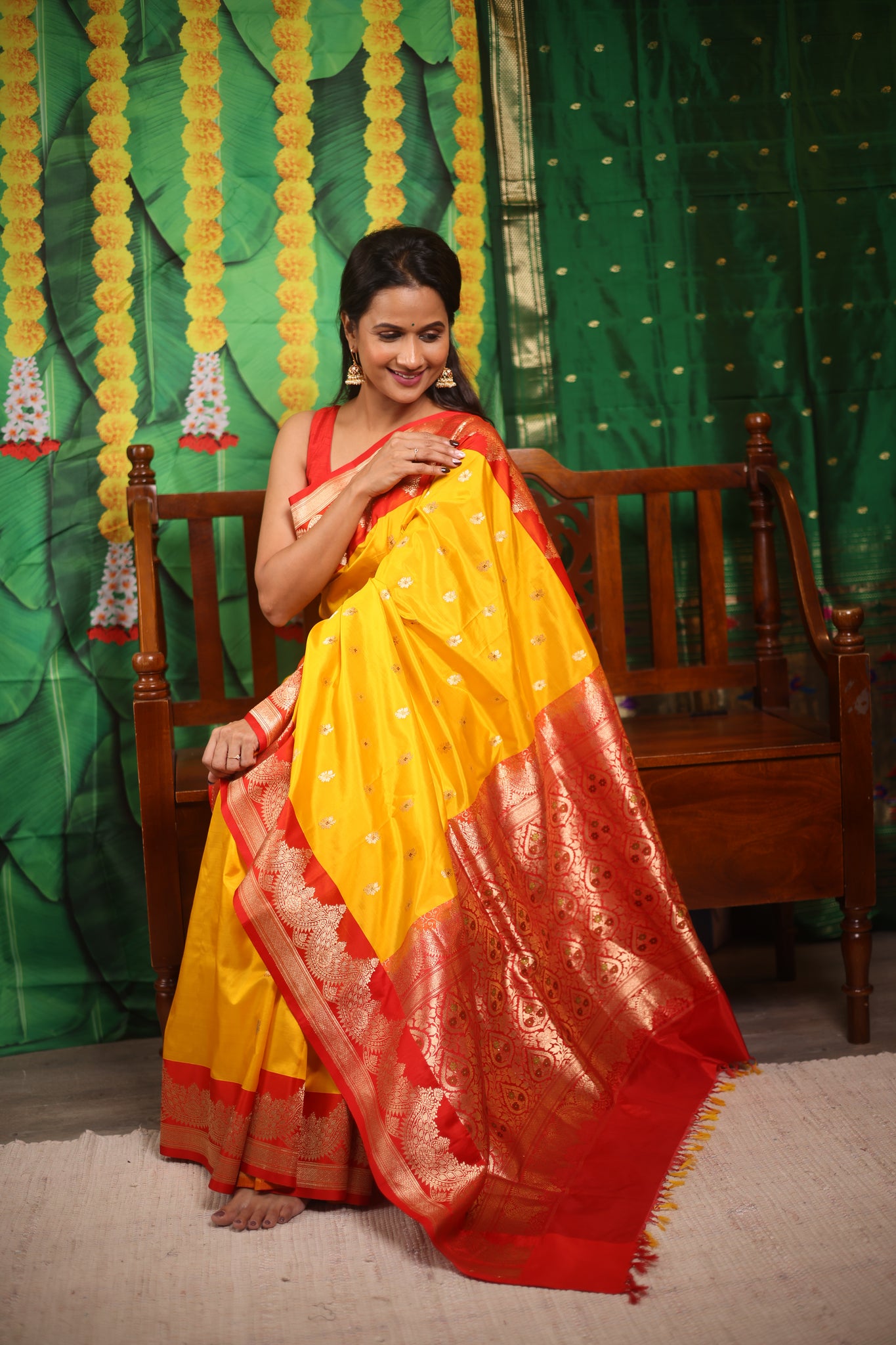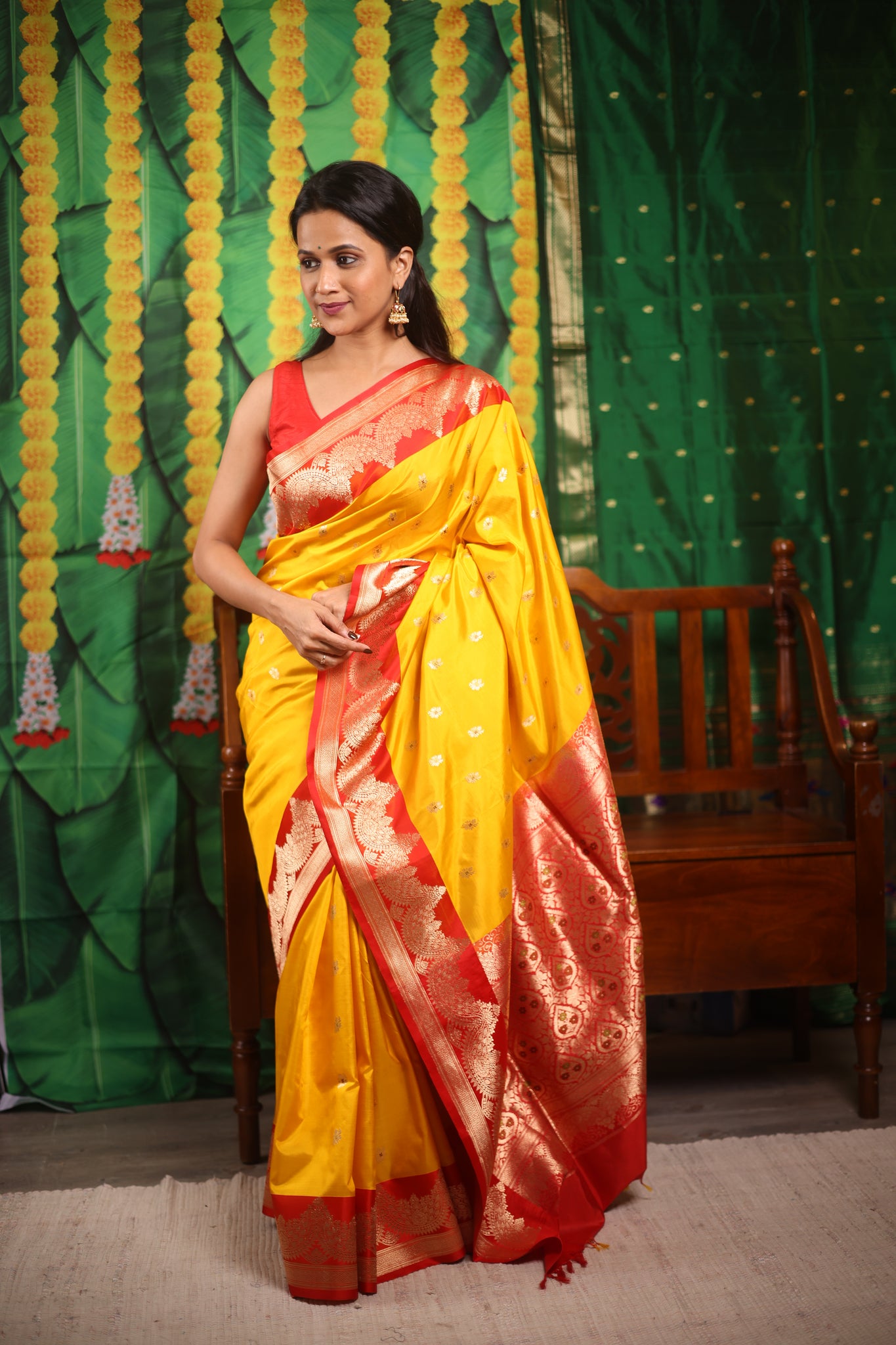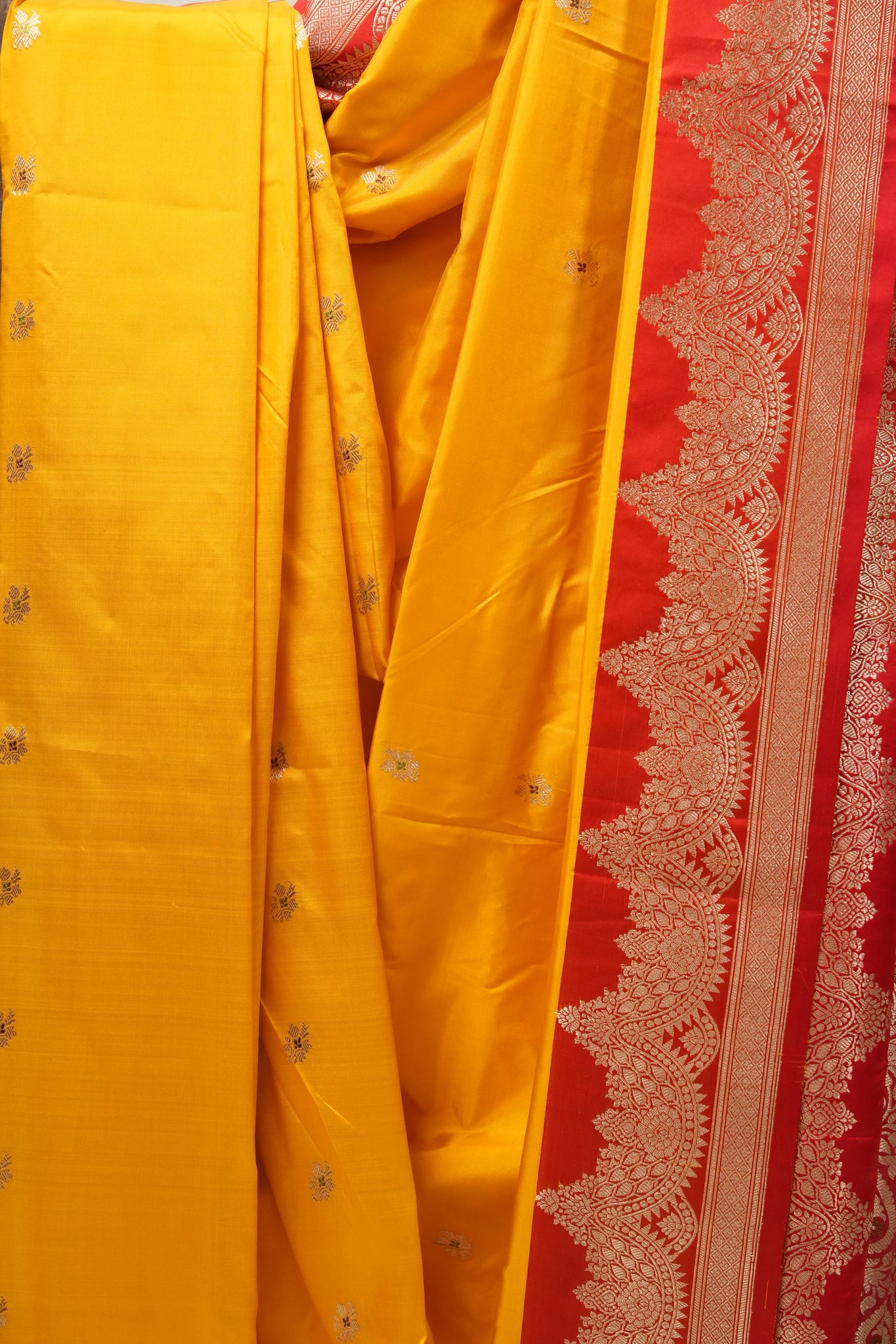 Work - This is a banarasi silk saree in a yellow base, featuring small buti motifs woven across the body and a rich red zari floral border and pallu with intricate traditional designs.