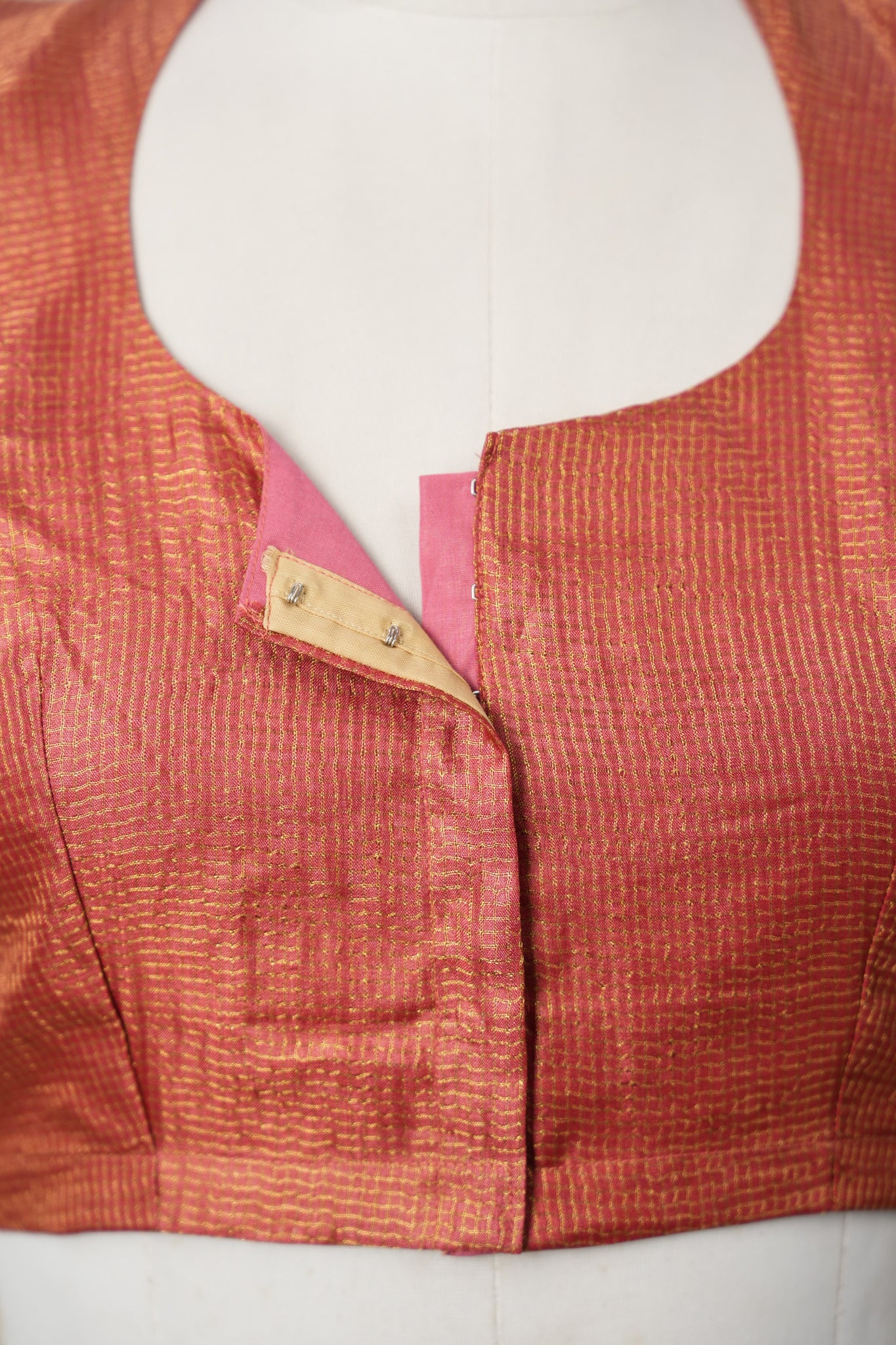 Wine tissue tussar silk checks blouse with a princess-cut fit, round-neck collar detail. Front hook opening, cotton lining, no pads, and 2-inch margin for adjustments—elegant finish ideal for silk and fancy sarees.