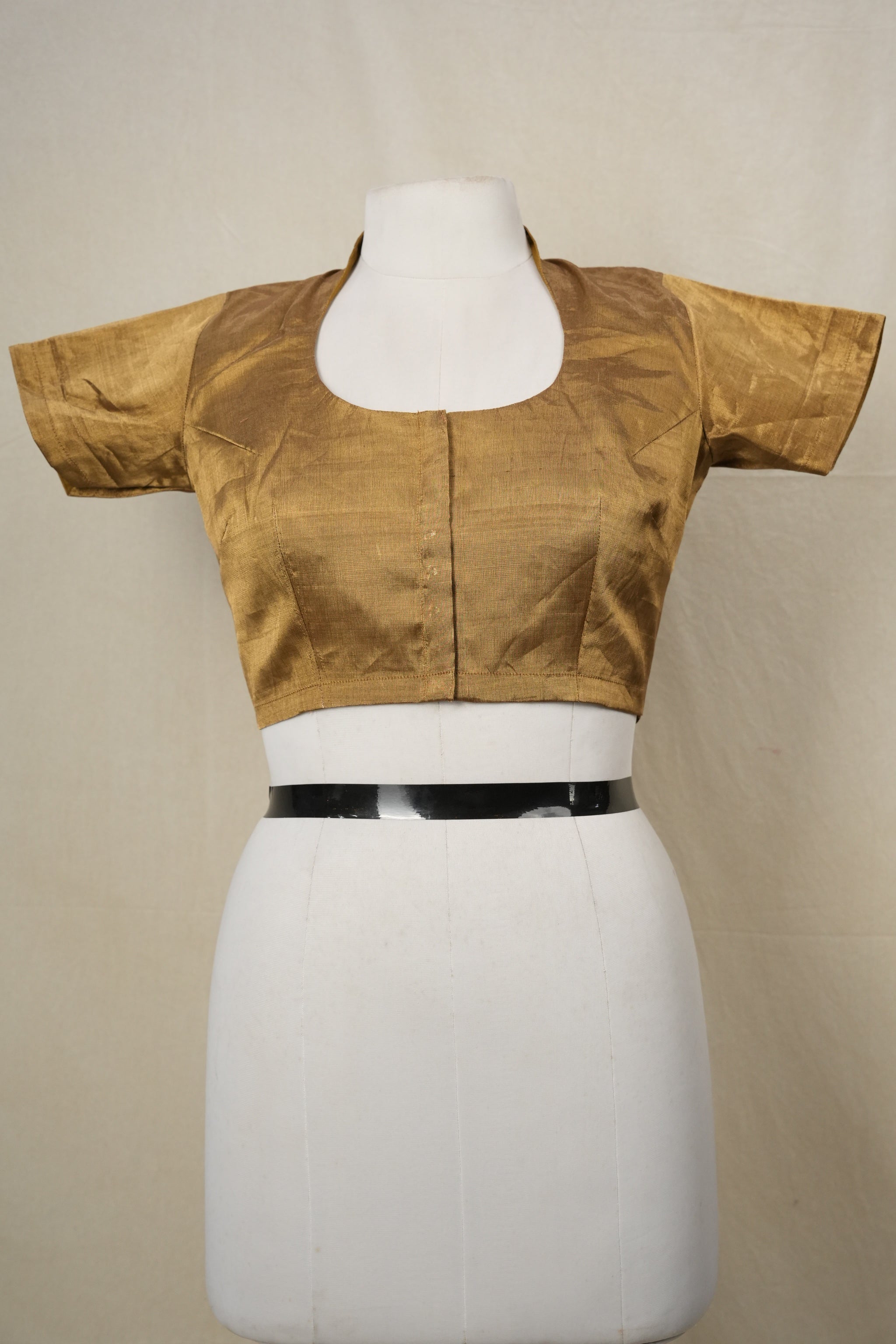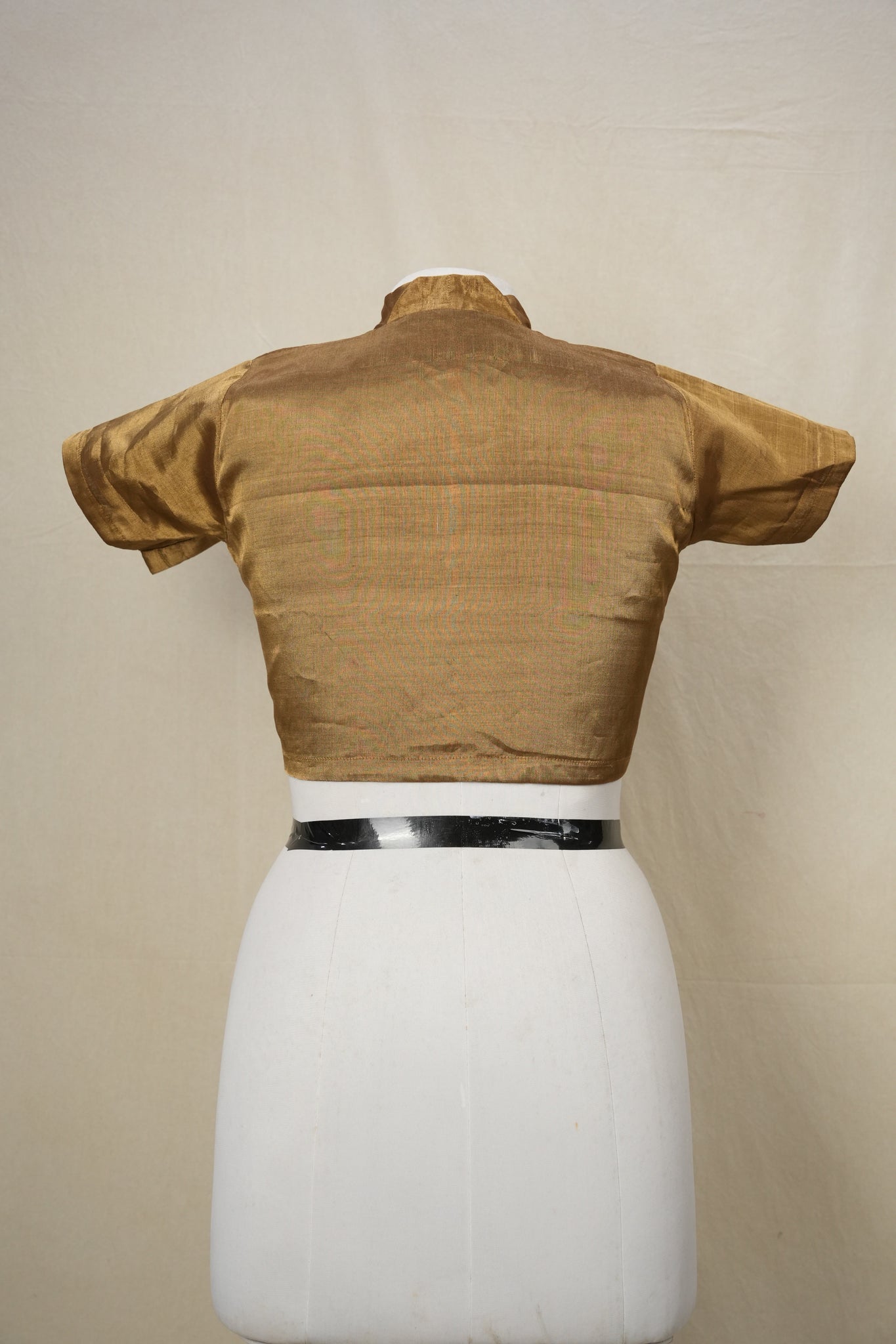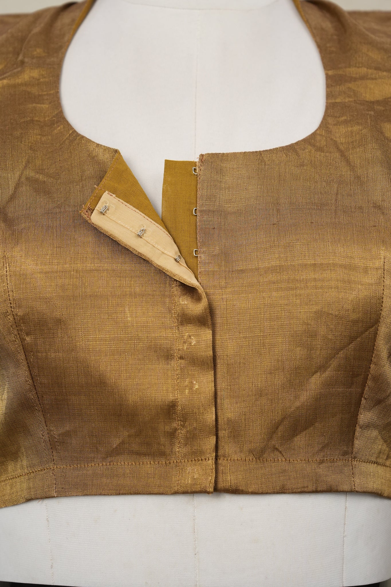 Dark gold tissue silk blouse with a princess-cut fit, round-neck collar detail. Front hook opening, cotton lining, no pads, and 2-inch margin for adjustments—elegant finish ideal for silk and fancy sarees.
