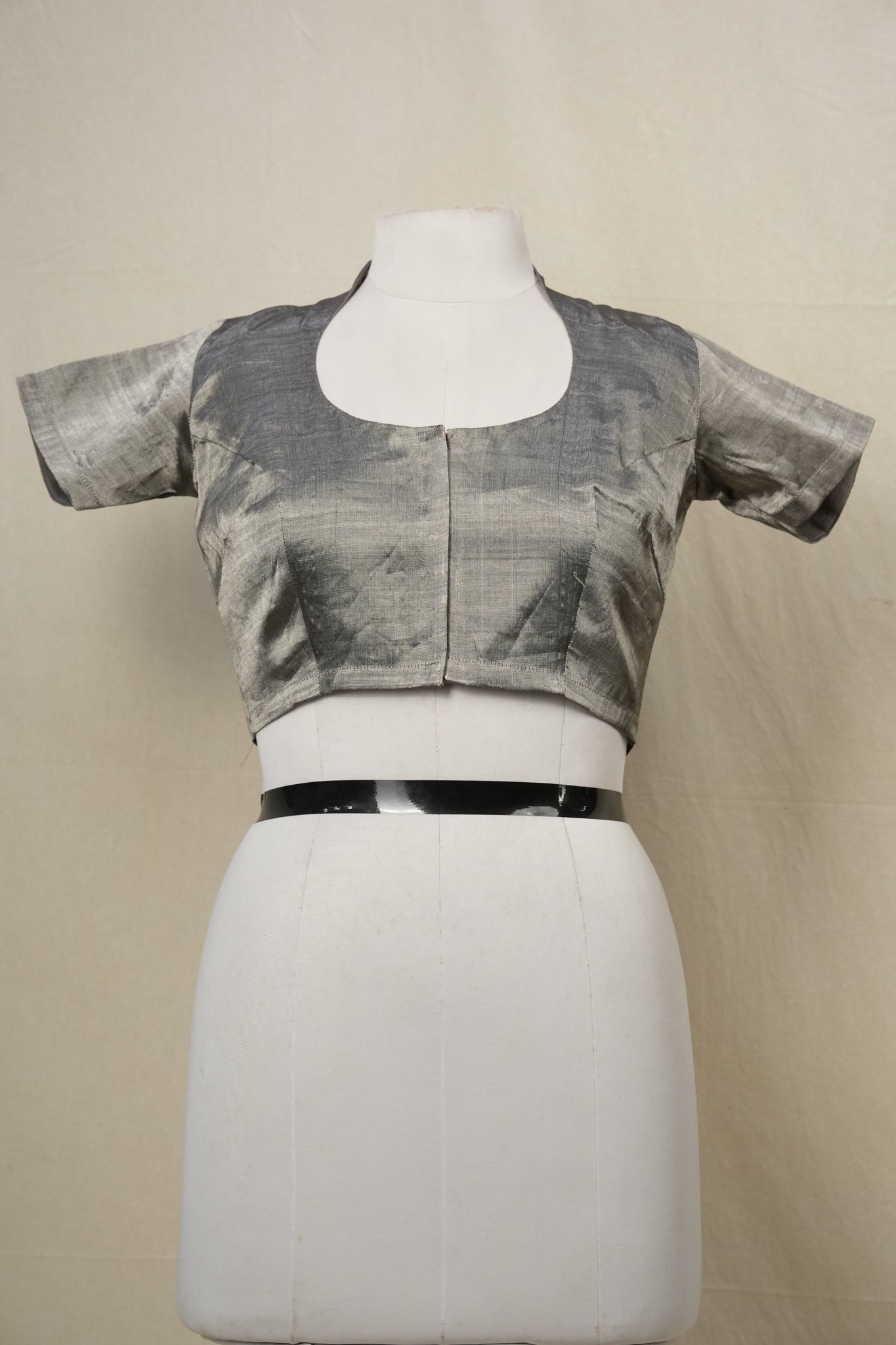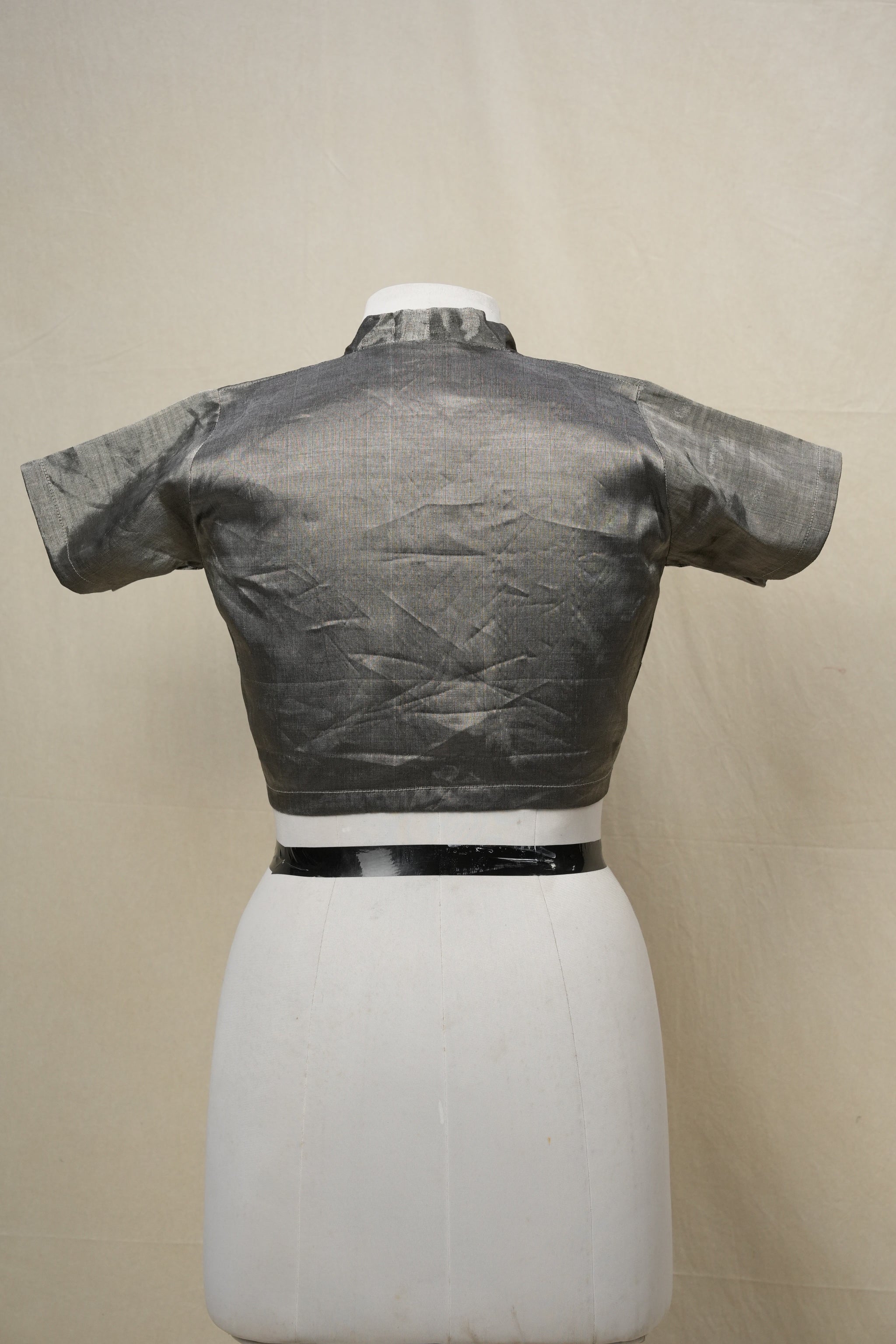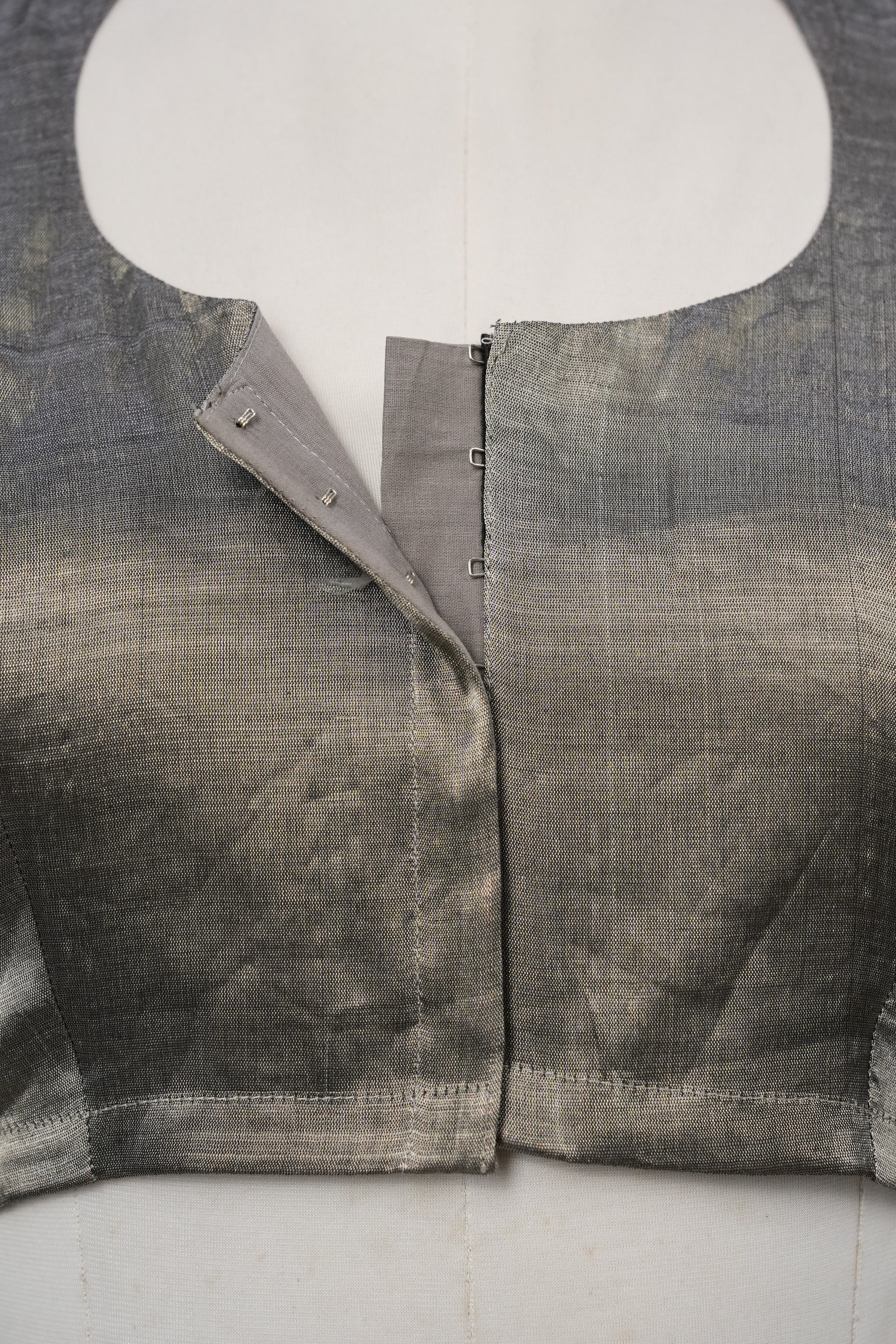 Dark grey tissue silk blouse with a princess-cut fit, round-neck collar detail. Front hook opening, cotton lining, no pads, and 2-inch margin for adjustments—elegant finish ideal for silk and fancy sarees.