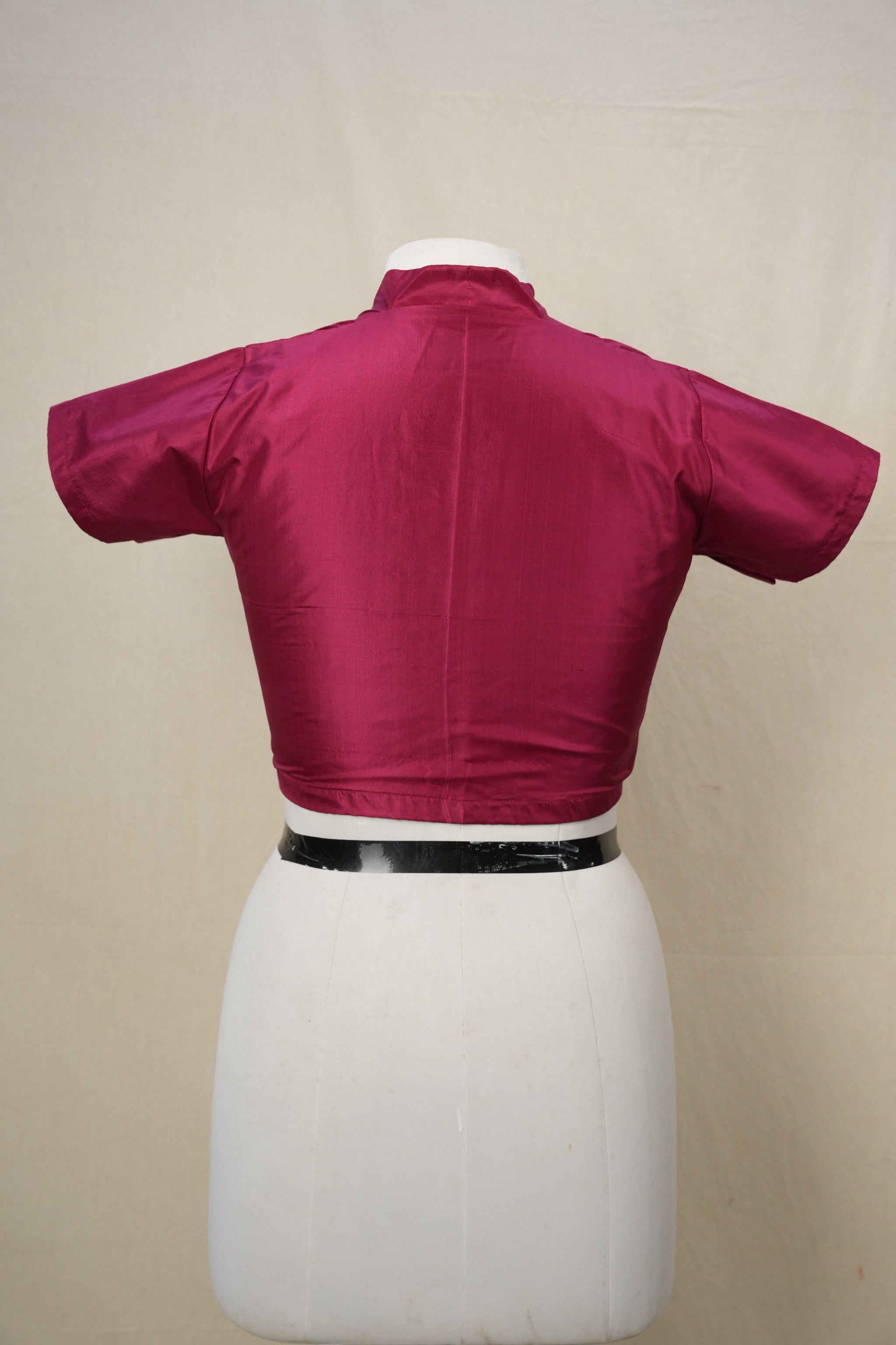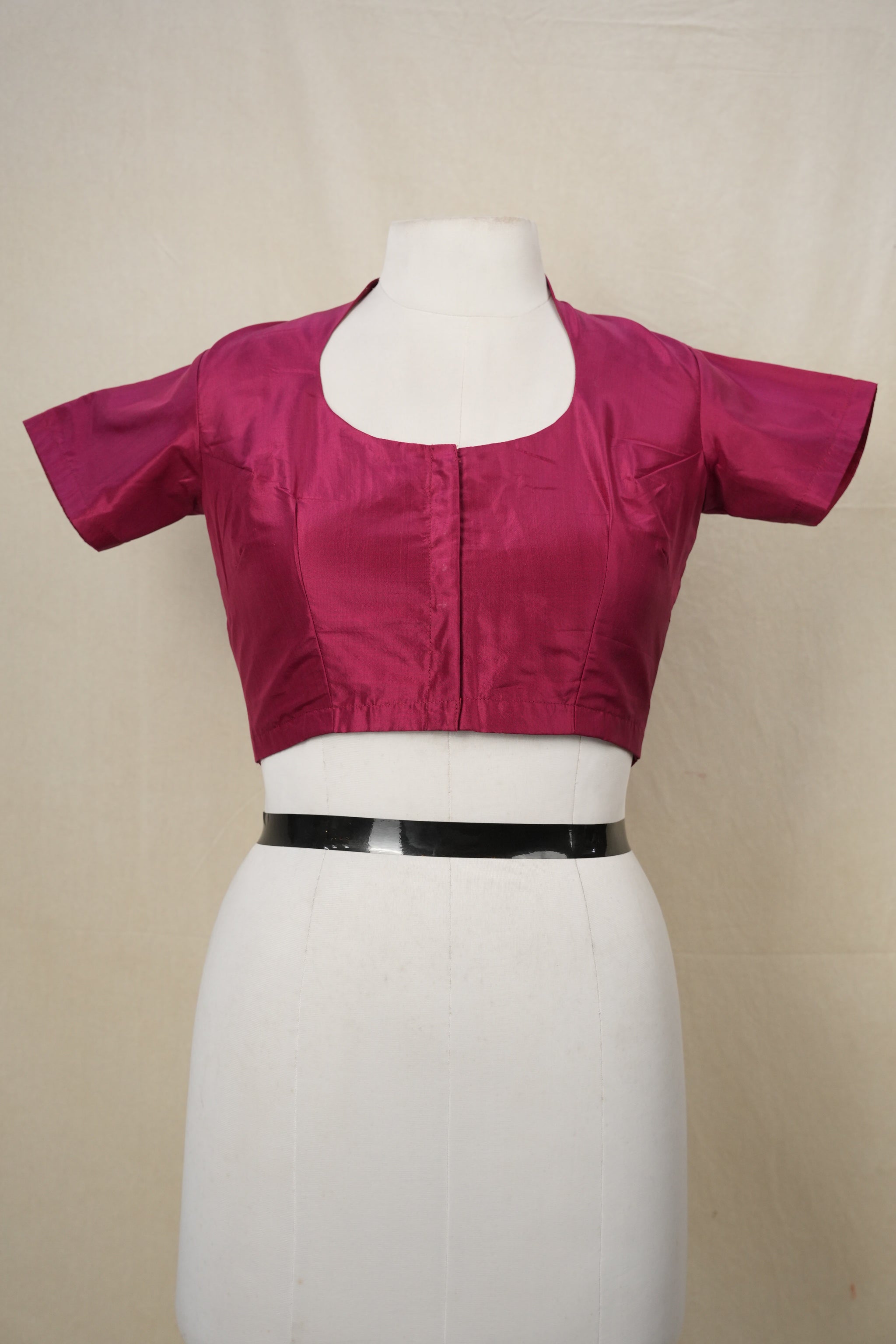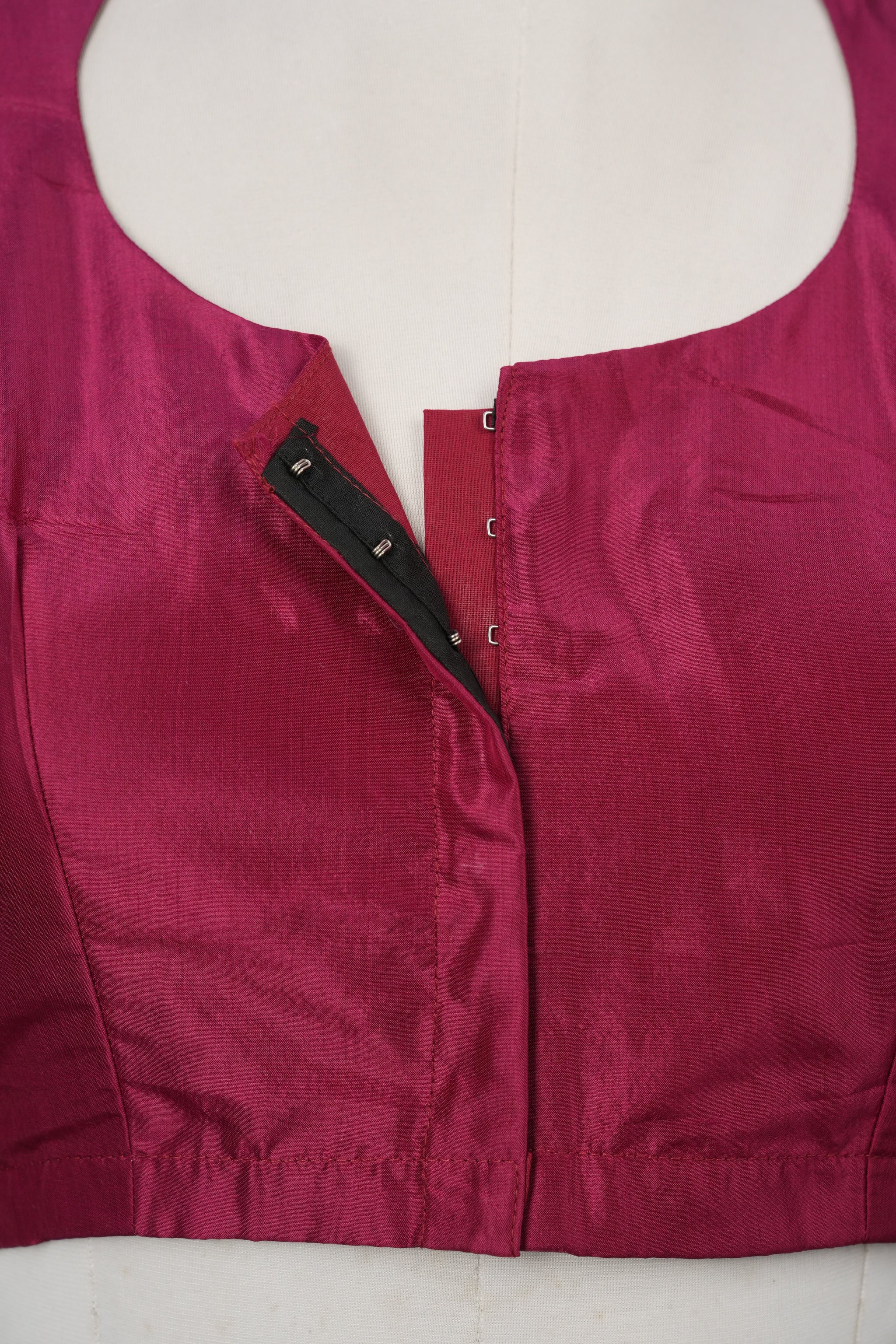 Maroon soft silk blouse with collar neck back, round neck front and open with hooks, without pads, with cotton lining, princess cut with 2 inches margin inside.