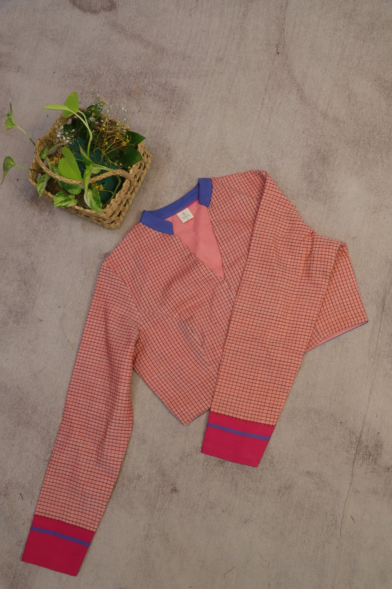 This patteda anchu blouse comes with collar neck, front open with hooks, without pads, with cotton lining, princess cut with 2 inches margin inside.
