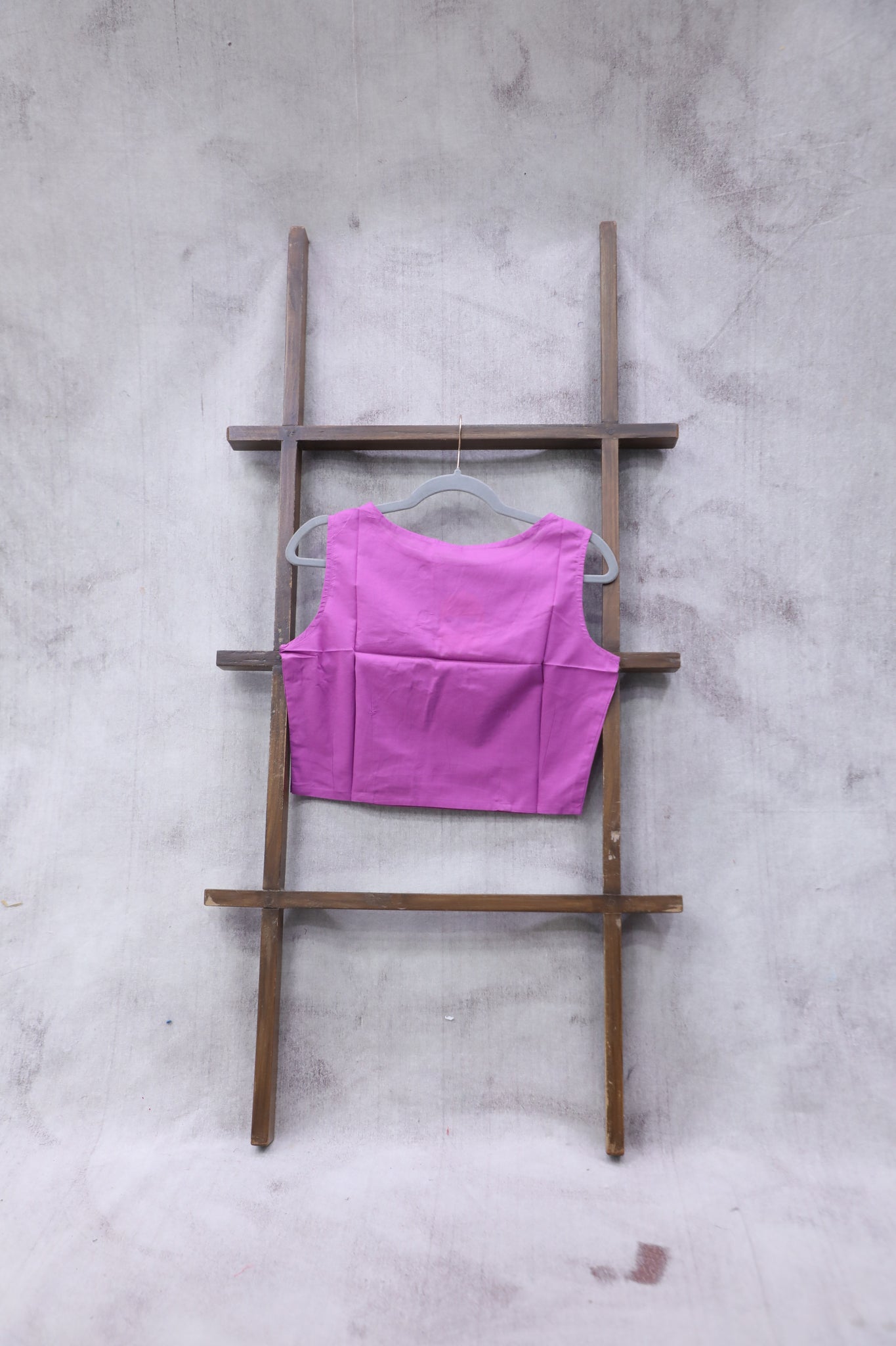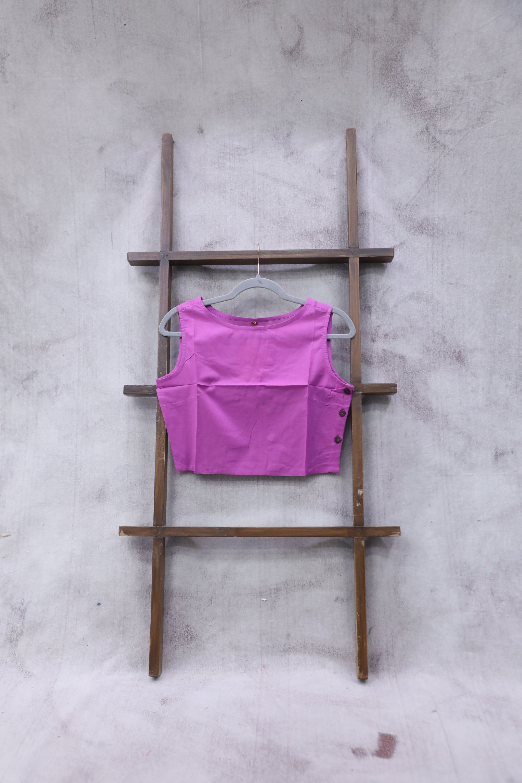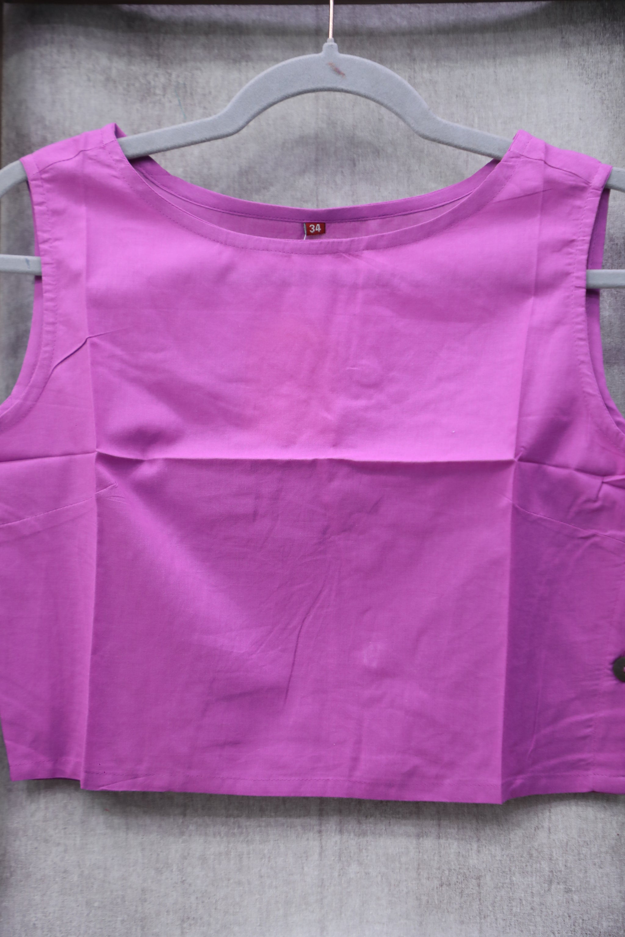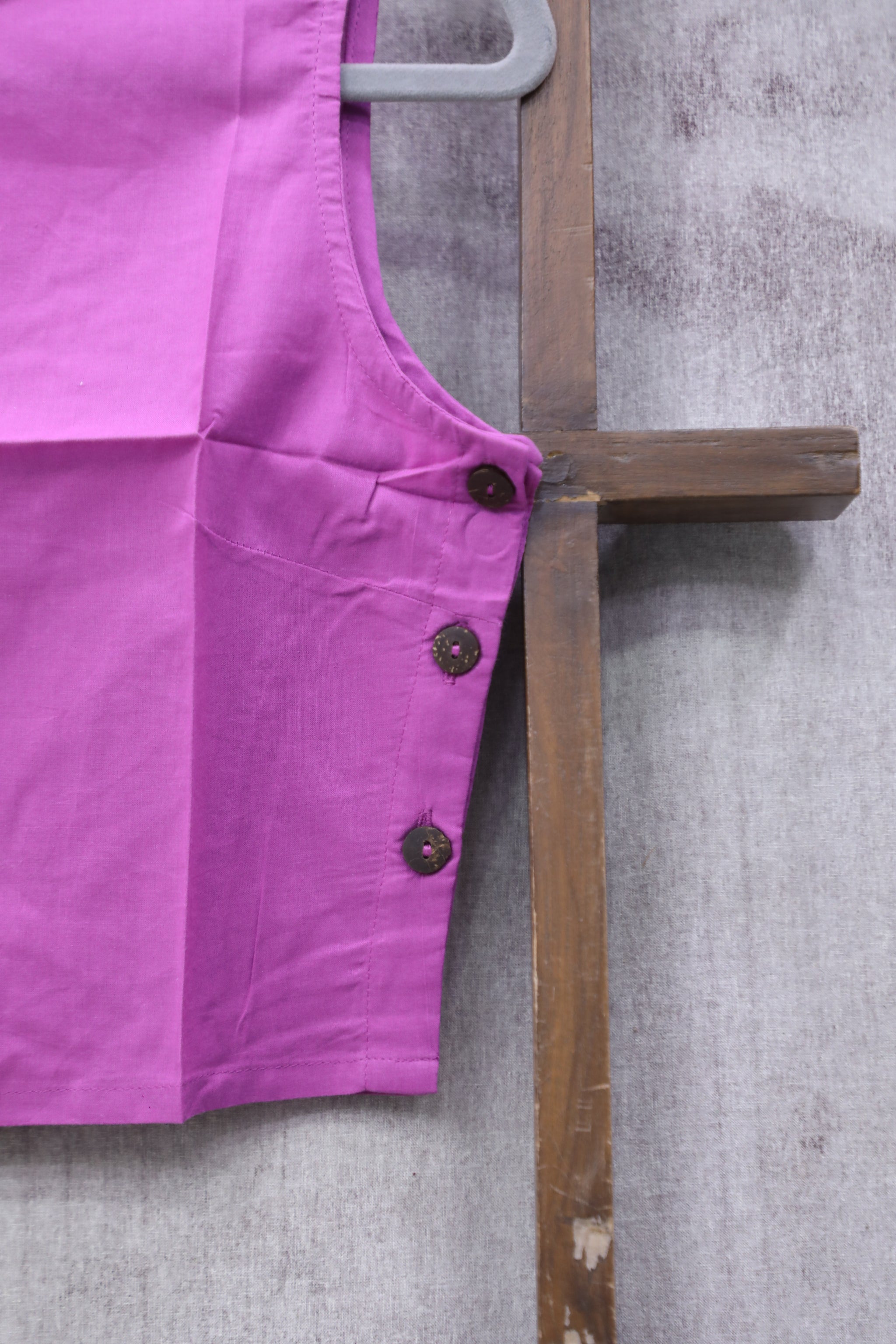 This pink round-neck cotton blouse features fish shaped fabric embedded on the 3/4th sleeves and a front-opening design. It has a closed back and is made without pads and lining.