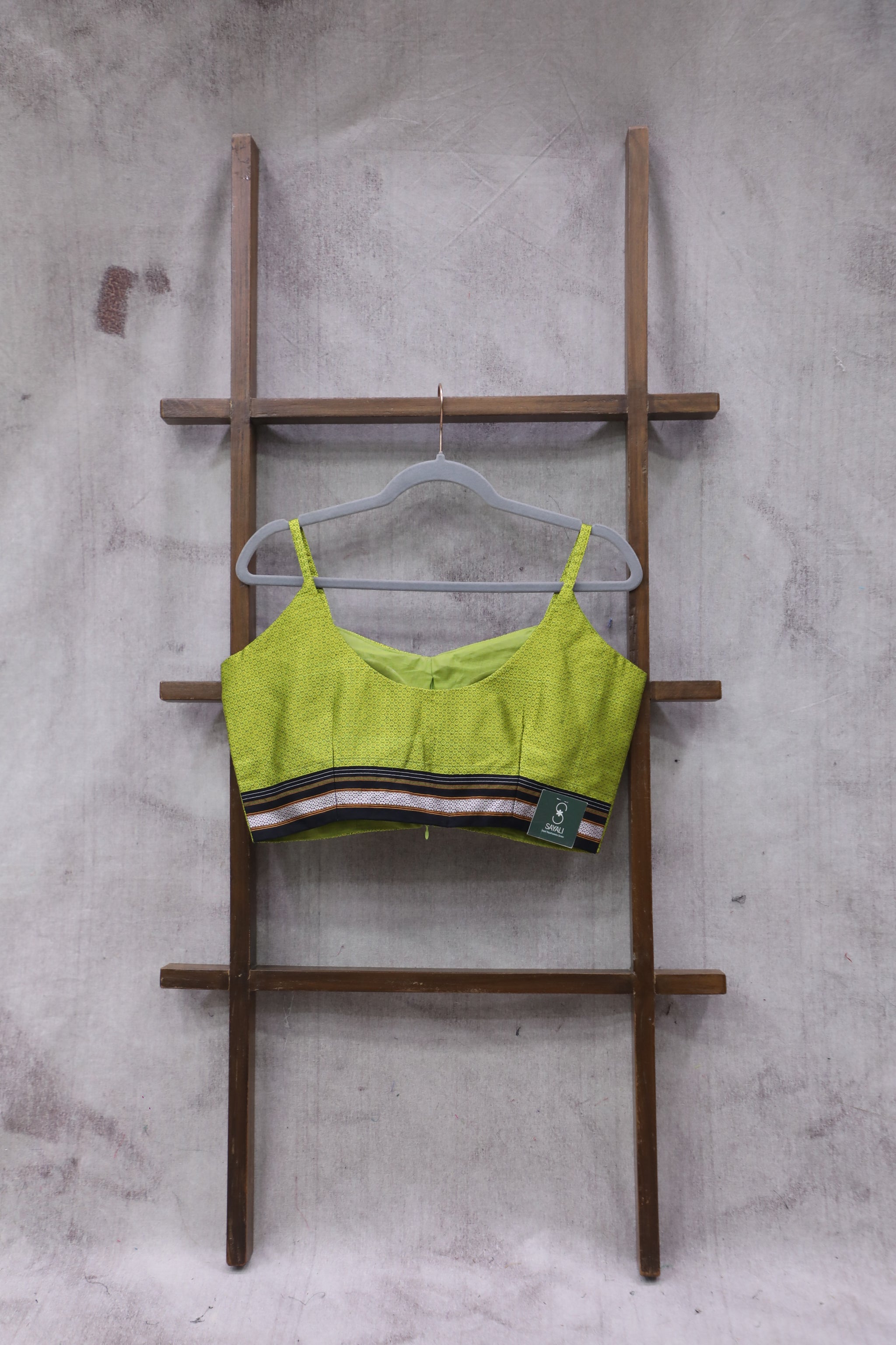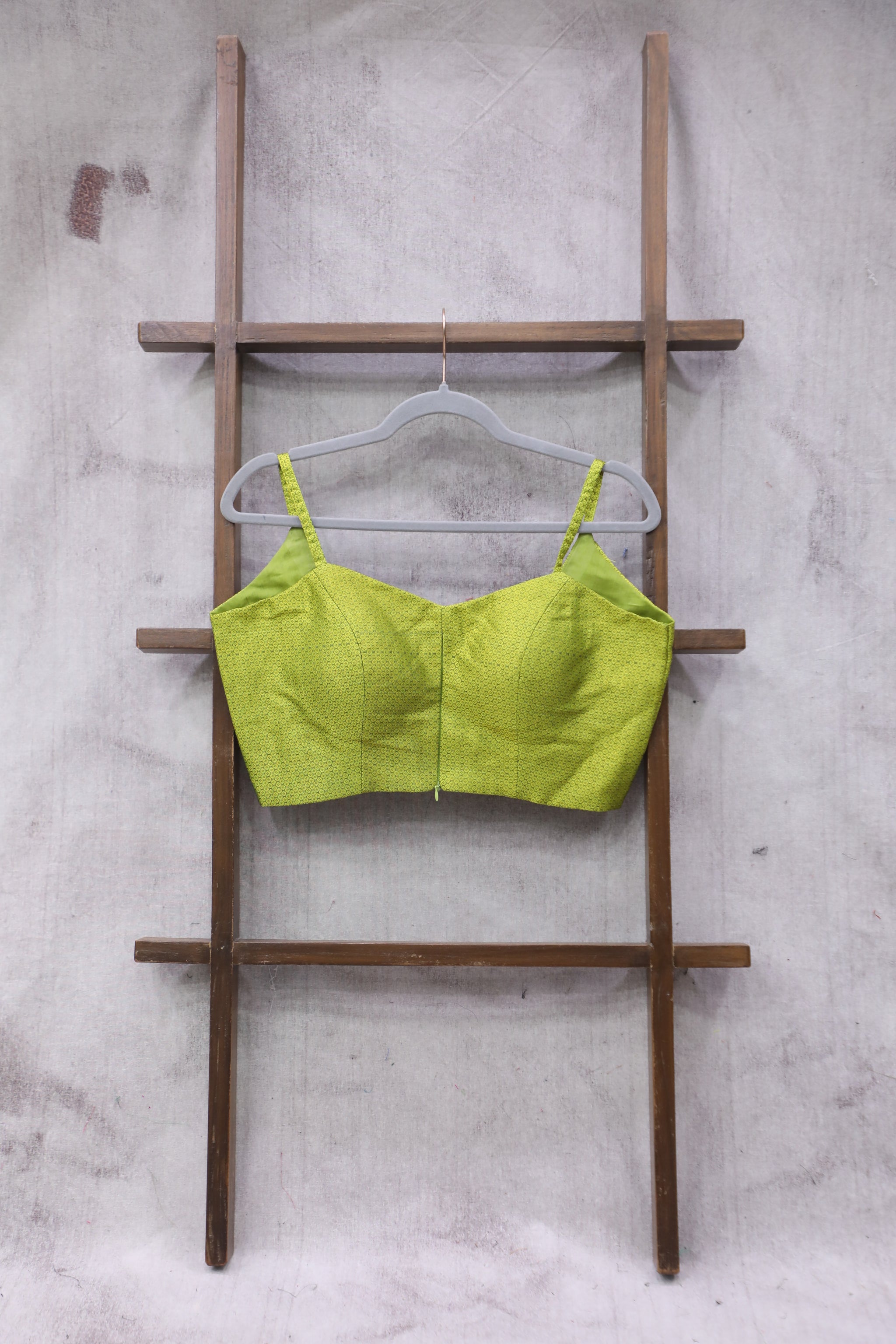 Green khun blouse with round neck front and back, front open with zip, with pads, with cotton lining, princess cut with 1 inches margin inside. small border and sleeveless. This khun blouses comes with different types of weaving patterns.