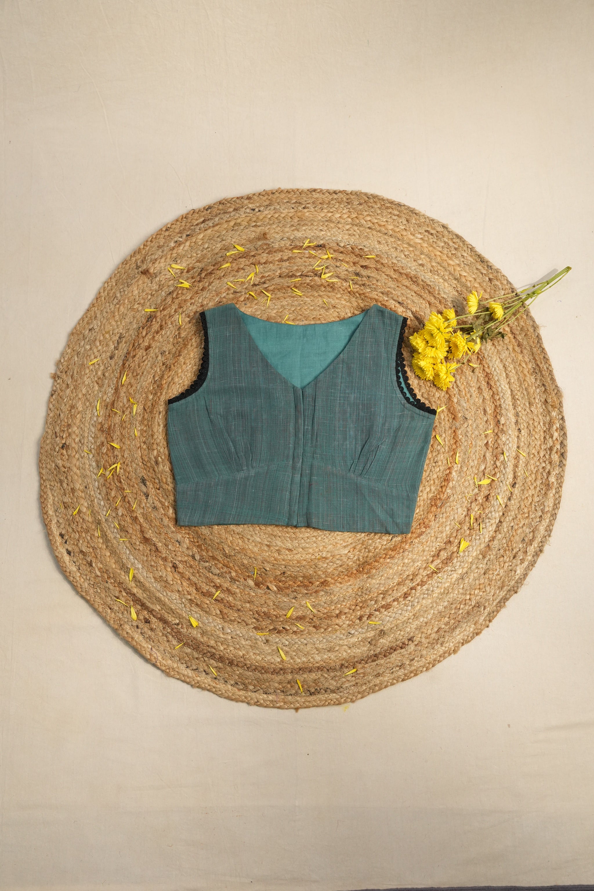 This green sleeveless kala cotton blouse comes with a lace lining on the sleeves, front open with buttons. It has an elegant cut with a v-neck line.