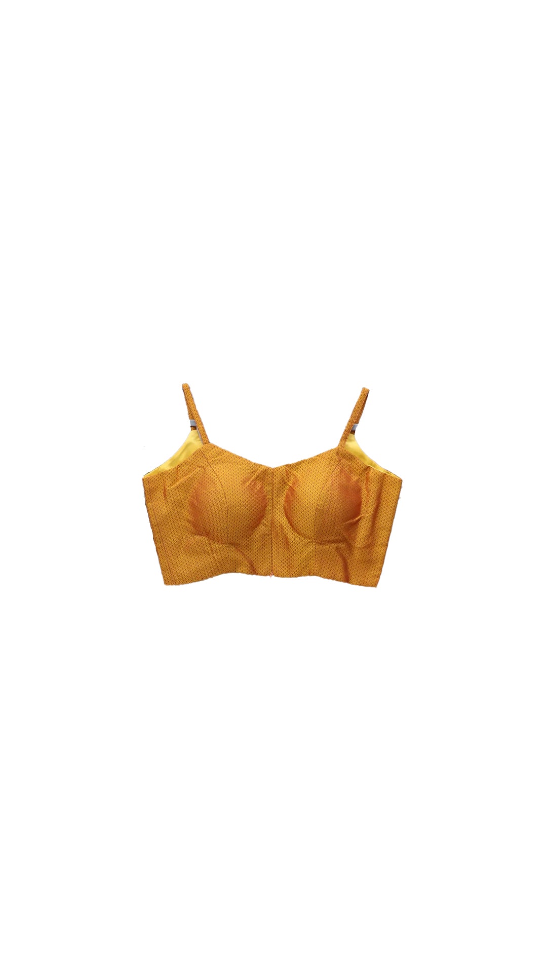 Orange khun blouse with round neck front and back, front open with zip, with pads, with cotton lining, princess cut with 1 inches margin inside. small border and sleeveless. This khun blouses comes with different types of weaving patterns.
