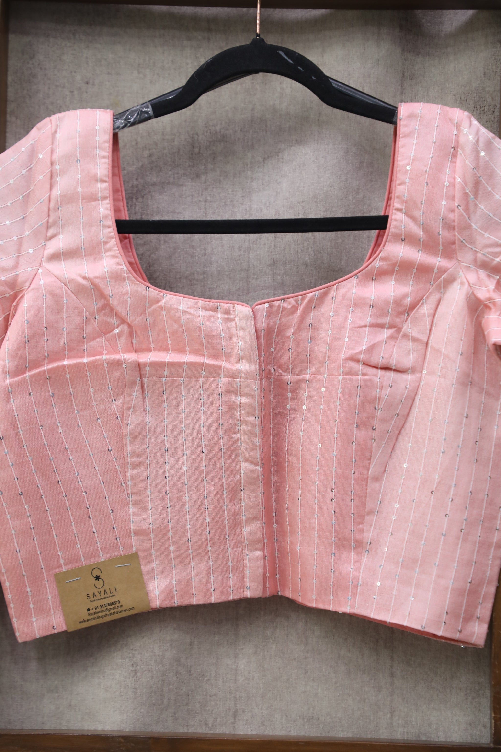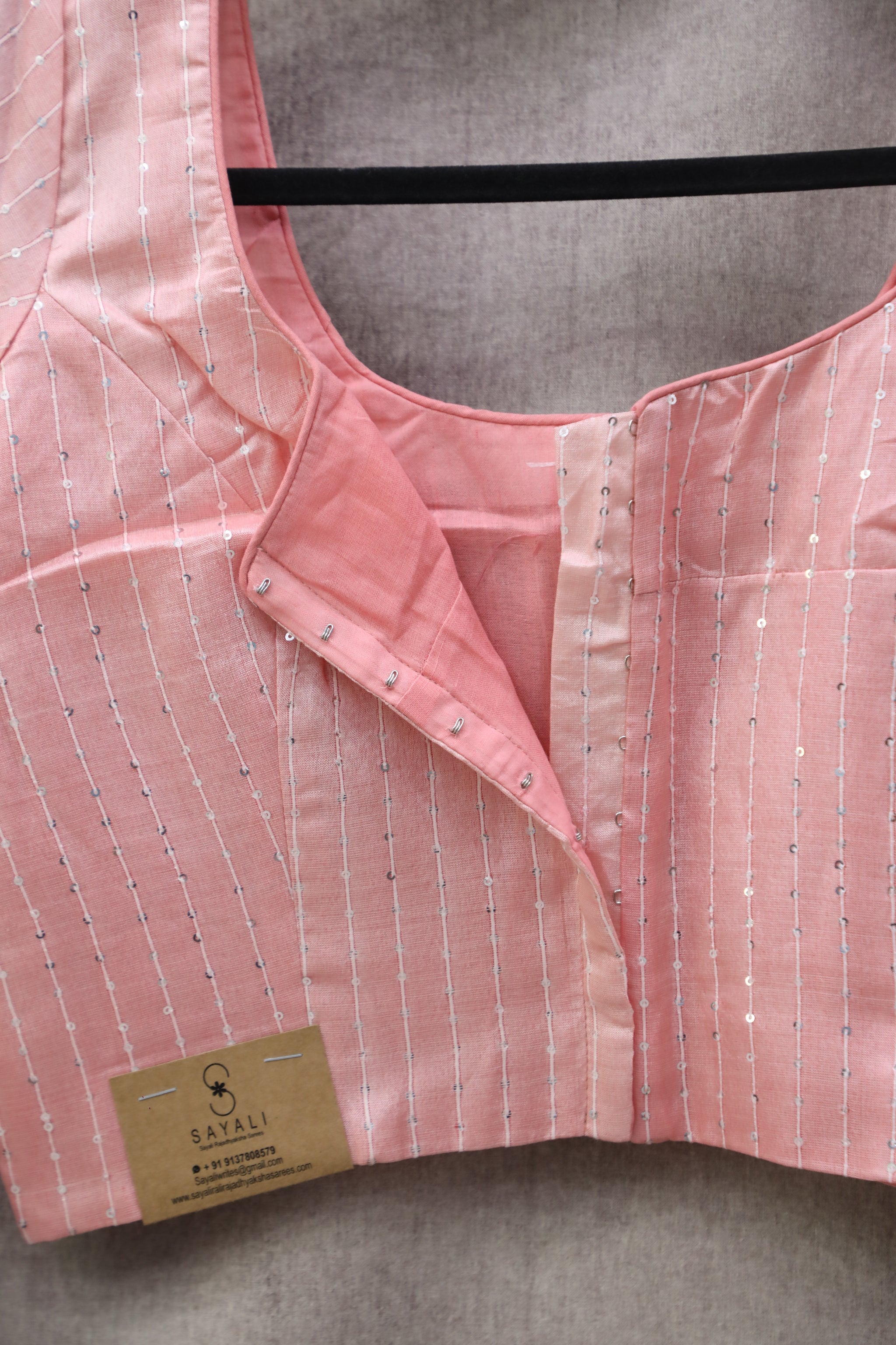 Baby pink tussar silk sequins blouse with boat neck, u neck front and open with hooks, without pads, with cotton lining, princess cut with 2 inches margin inside.