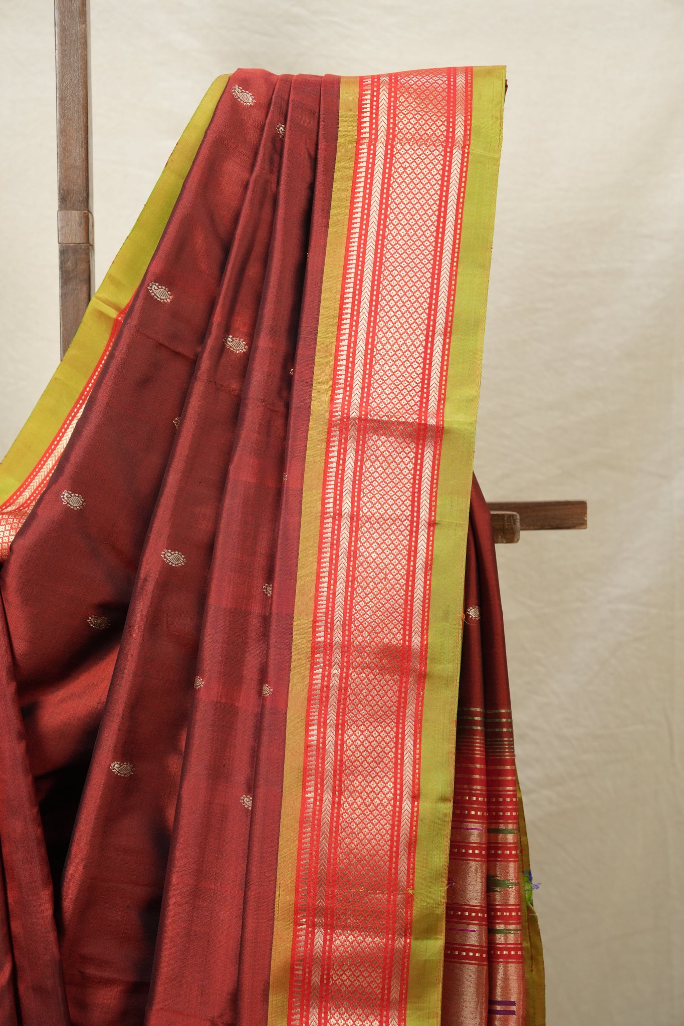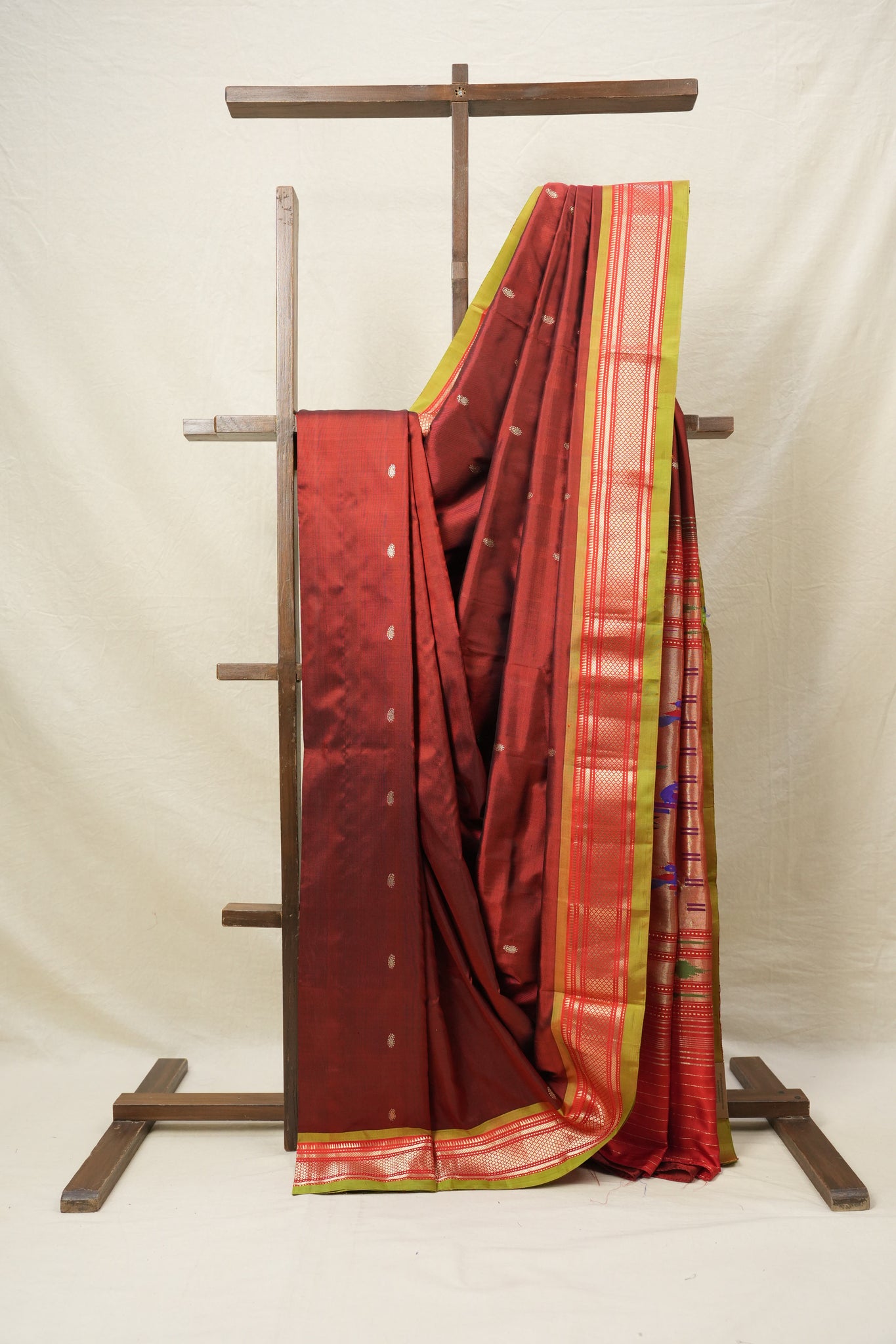 Work - The pallu features vibrant woven peacock and floral motifs, the maroon body has small woven buti.