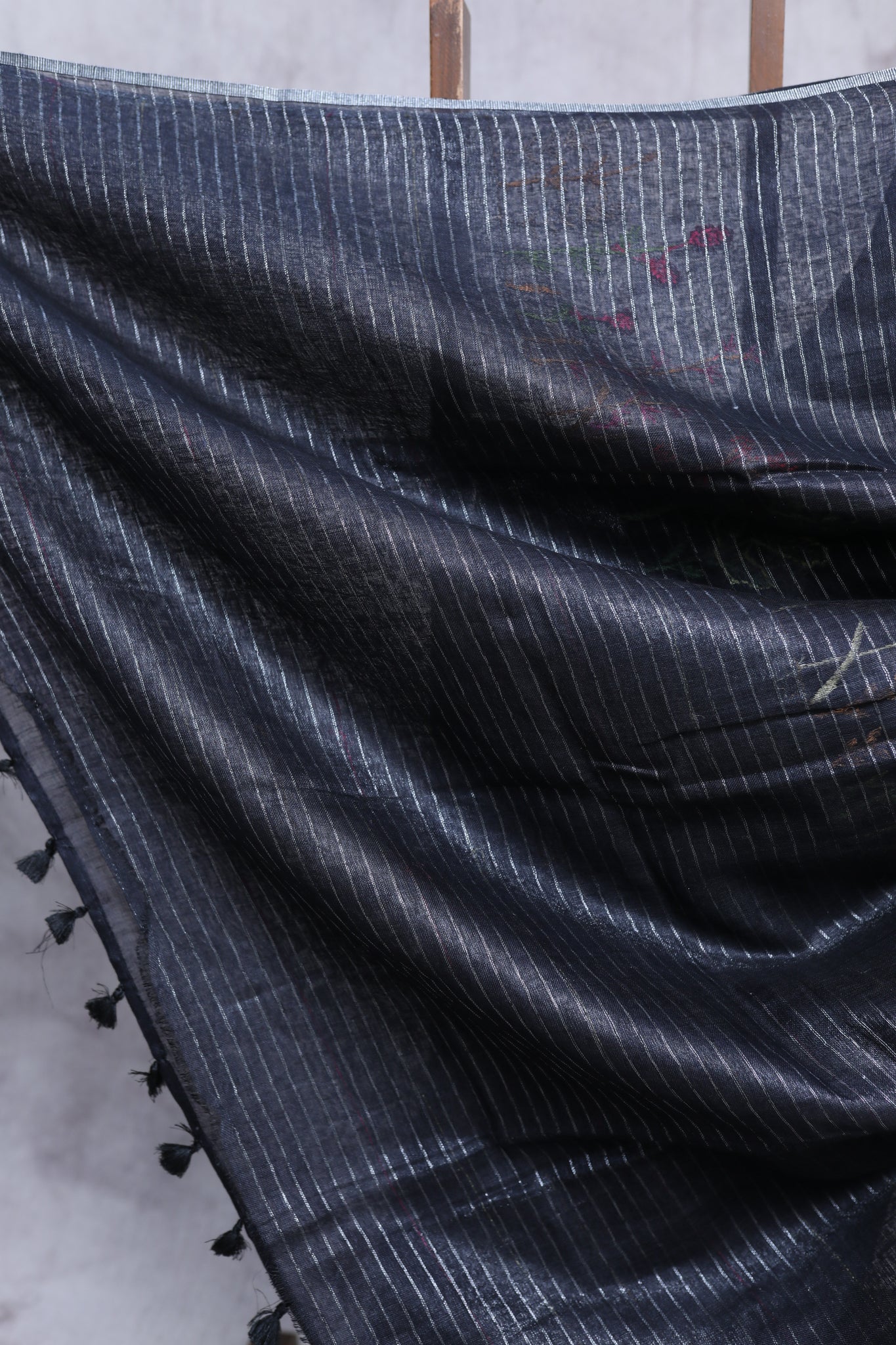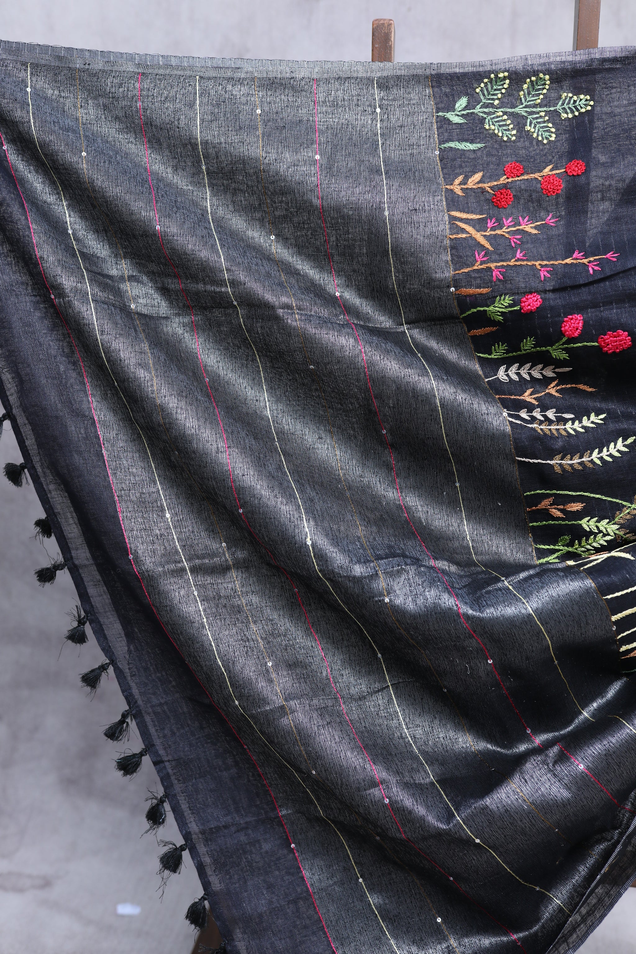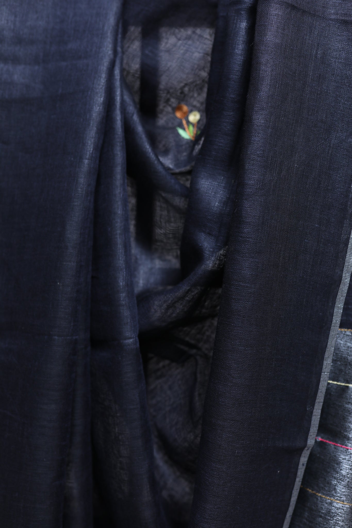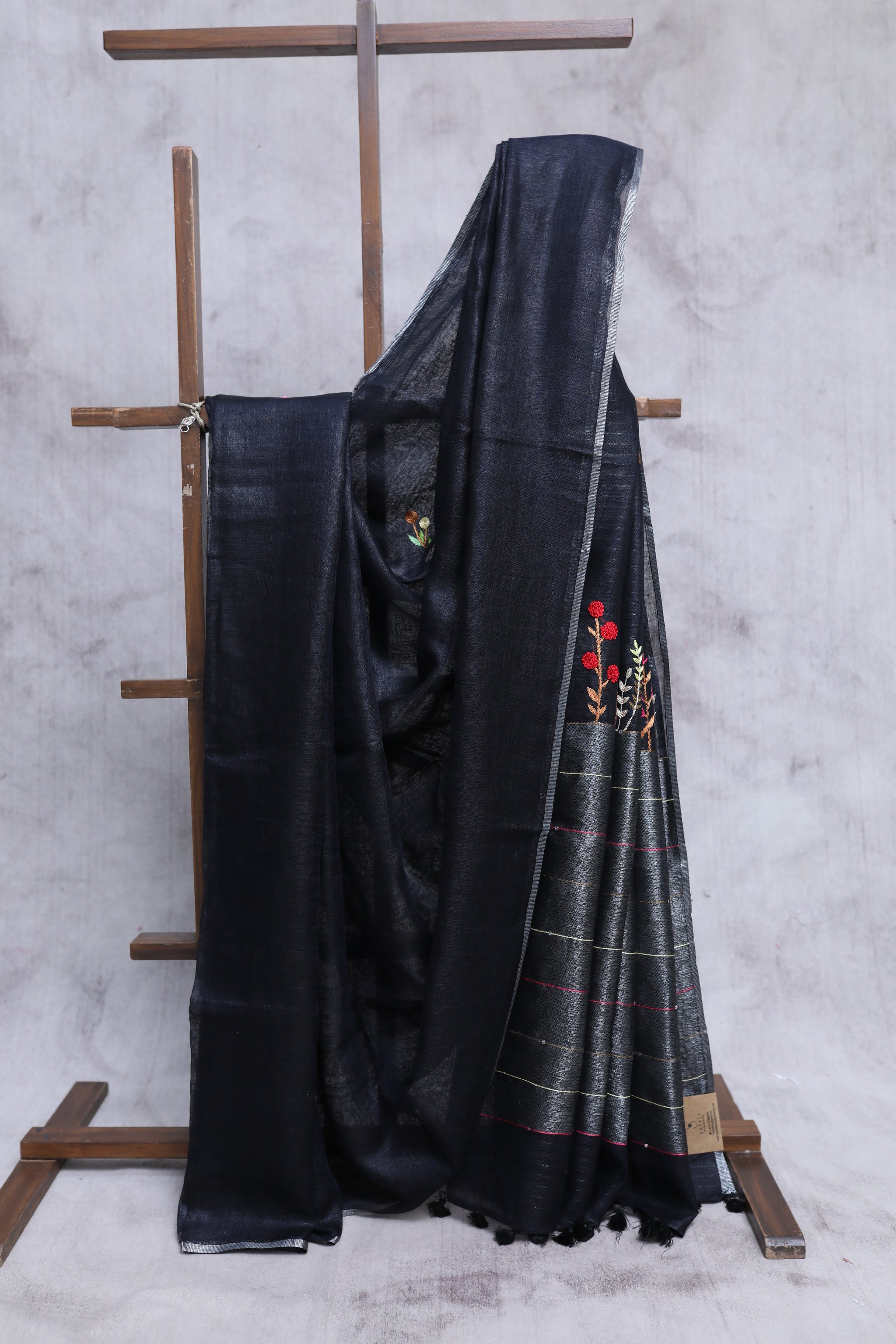 Black hand embroidered linen saree with silver zari border. A linen sarees is a lightweight and breathable garment known for its elegant drape and minimalistic designs, ideal for both casual and formal wear. Totally hand crafted work, no Machine work.