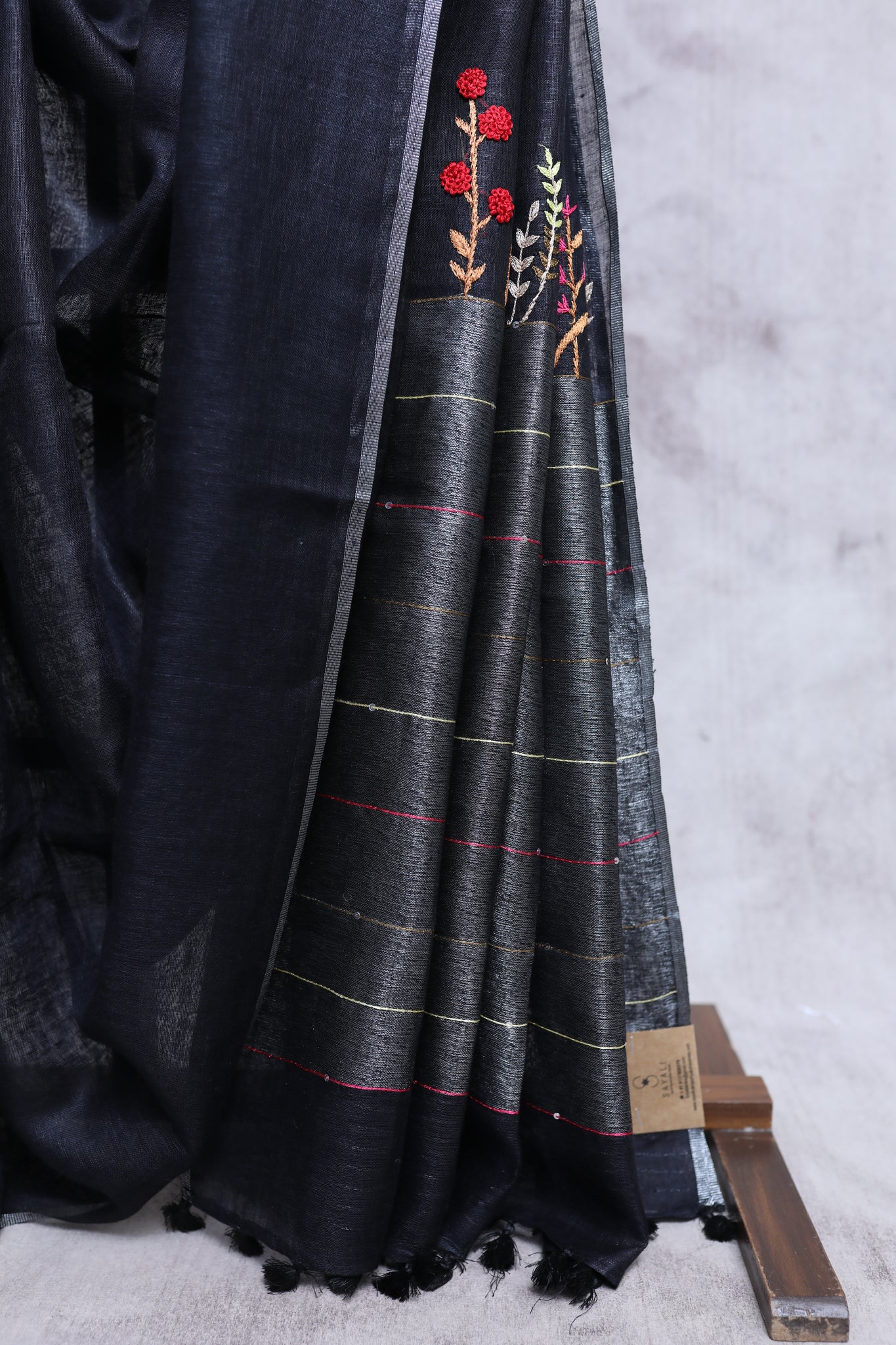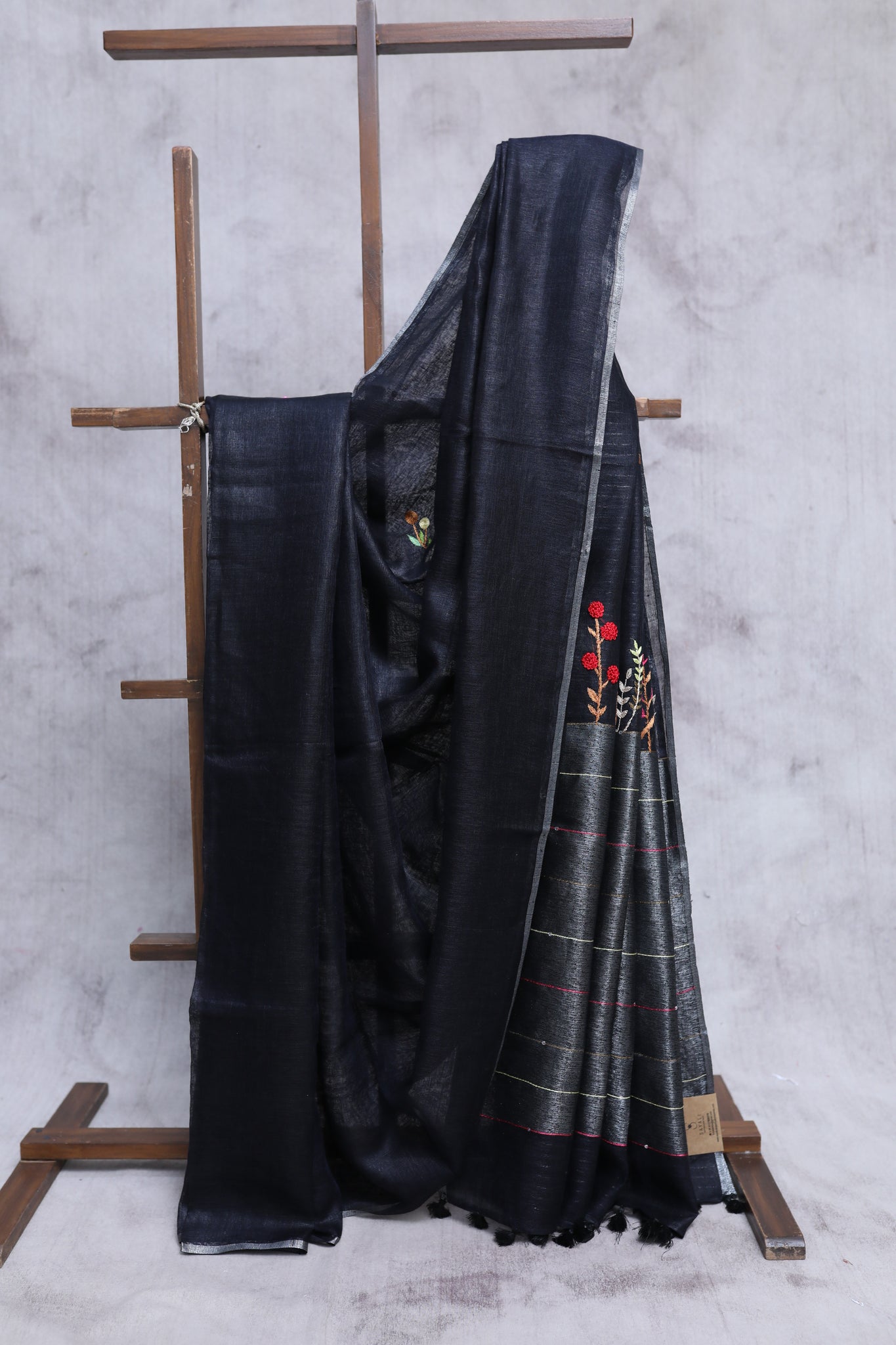 Black Hand Embroidered Linen Saree - SRBHELS07