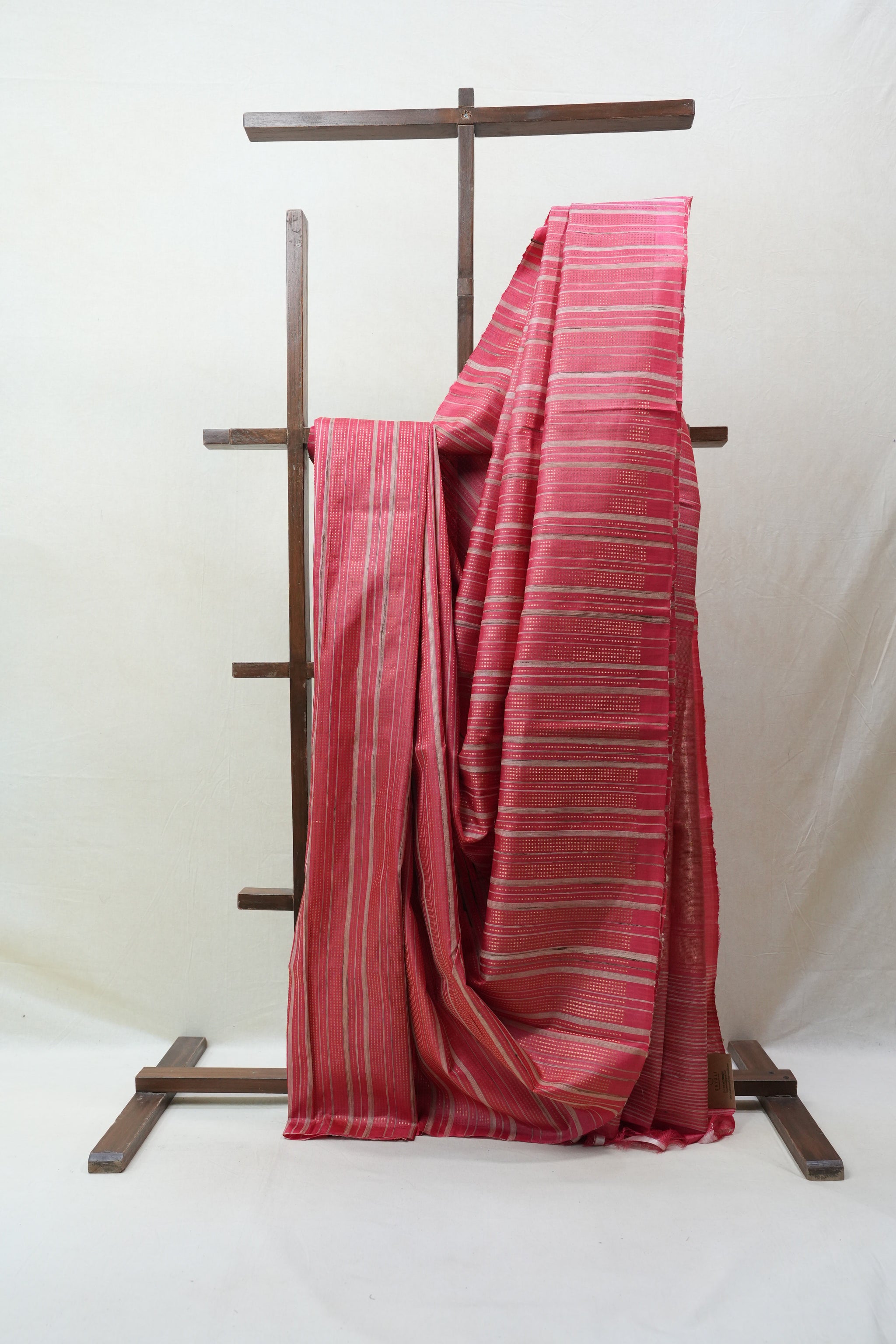 Work - This is a coral pink Tussar saree with a self-woven or striped pattern and a subtle, ornate border.