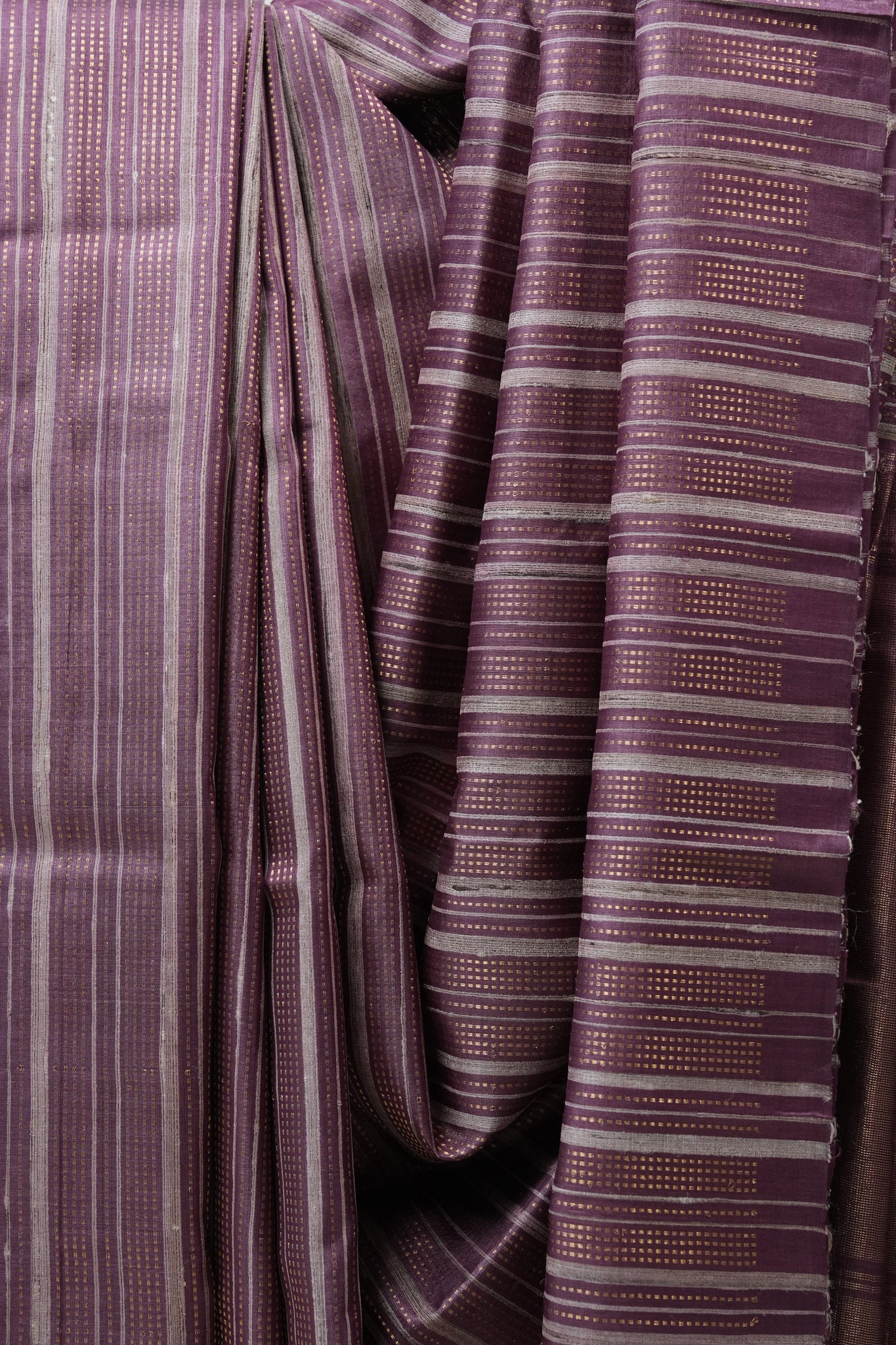 Work - This is a dark magenta Tussar saree with a self-woven or striped pattern and a subtle, ornate border.