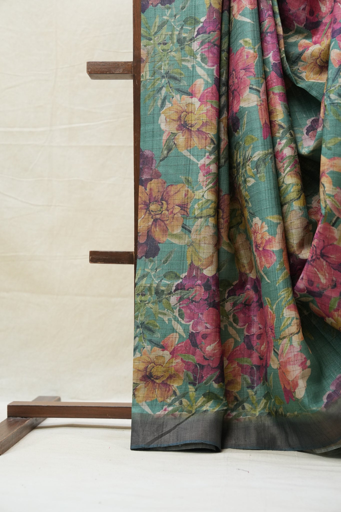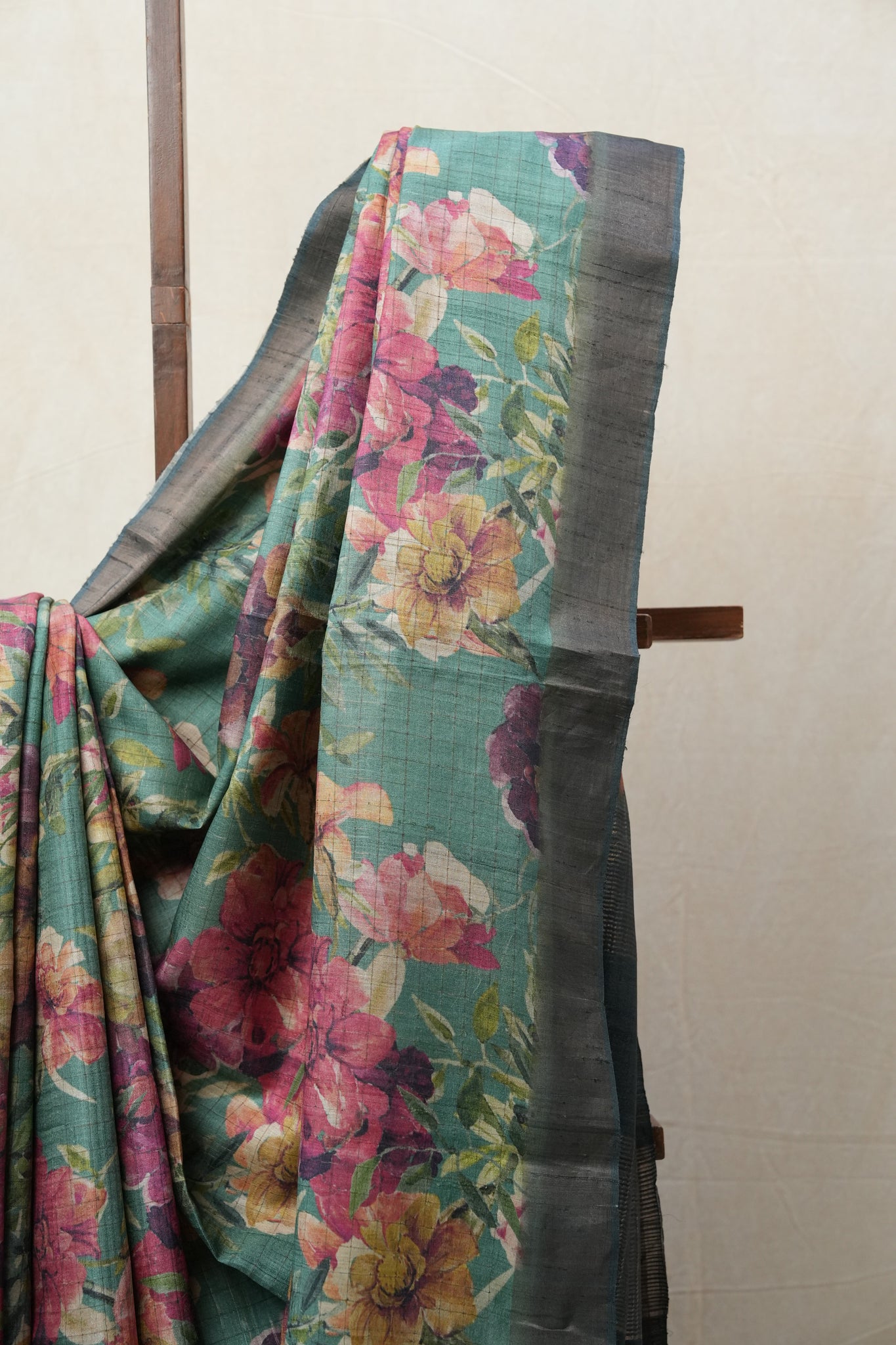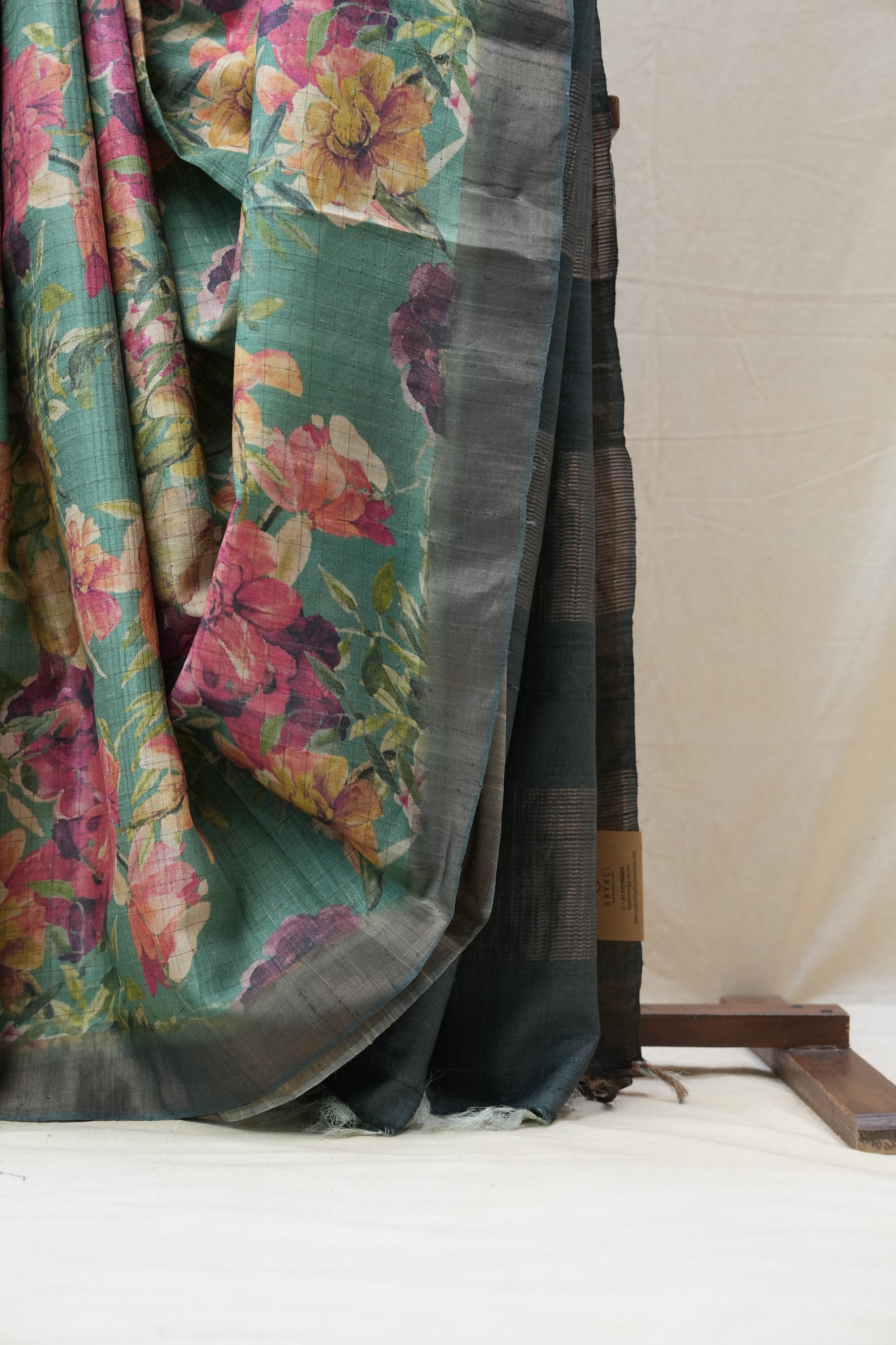 Work - This is a green Tussar saree with a floral print work and a subtle, ornate border.