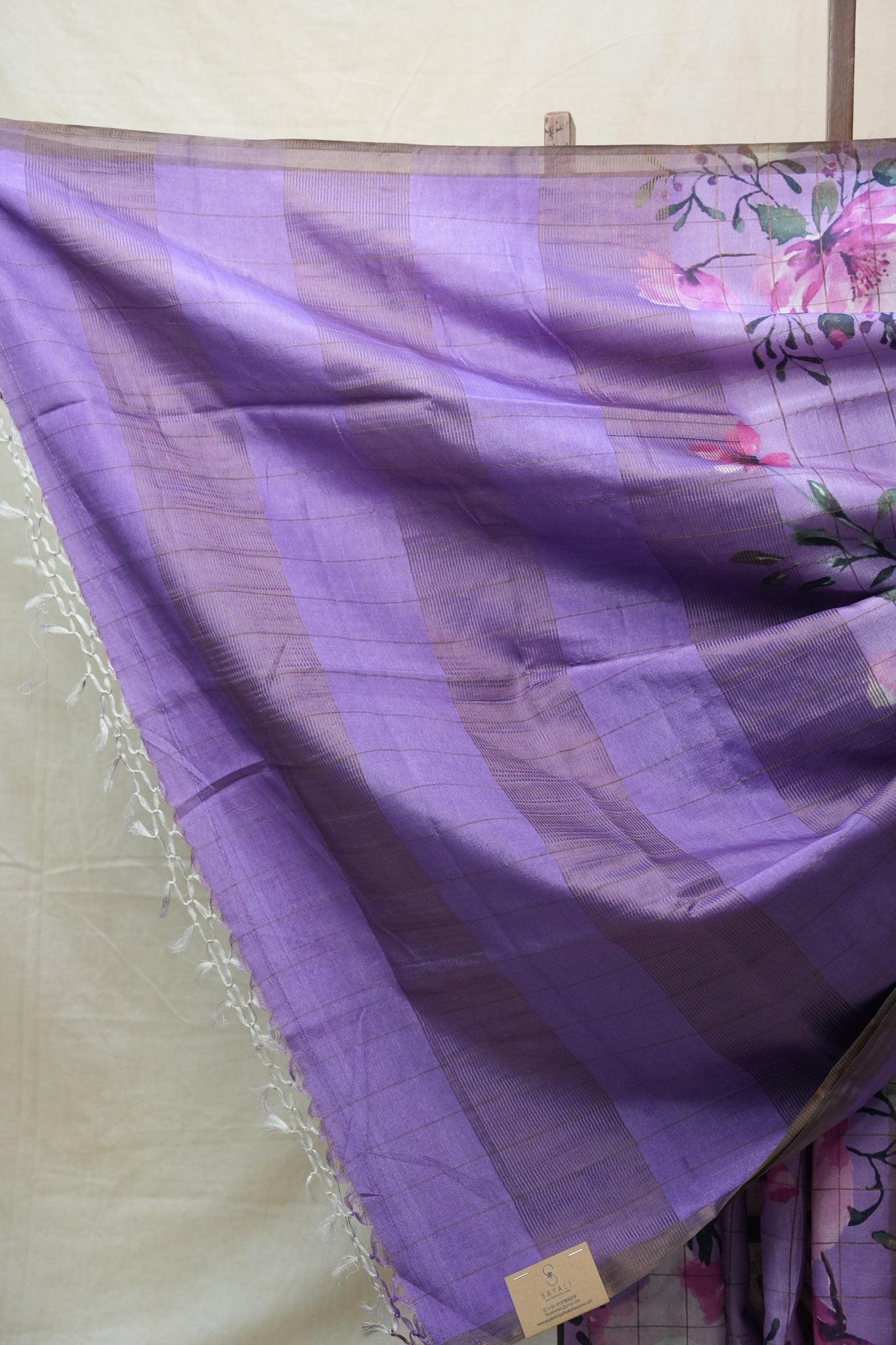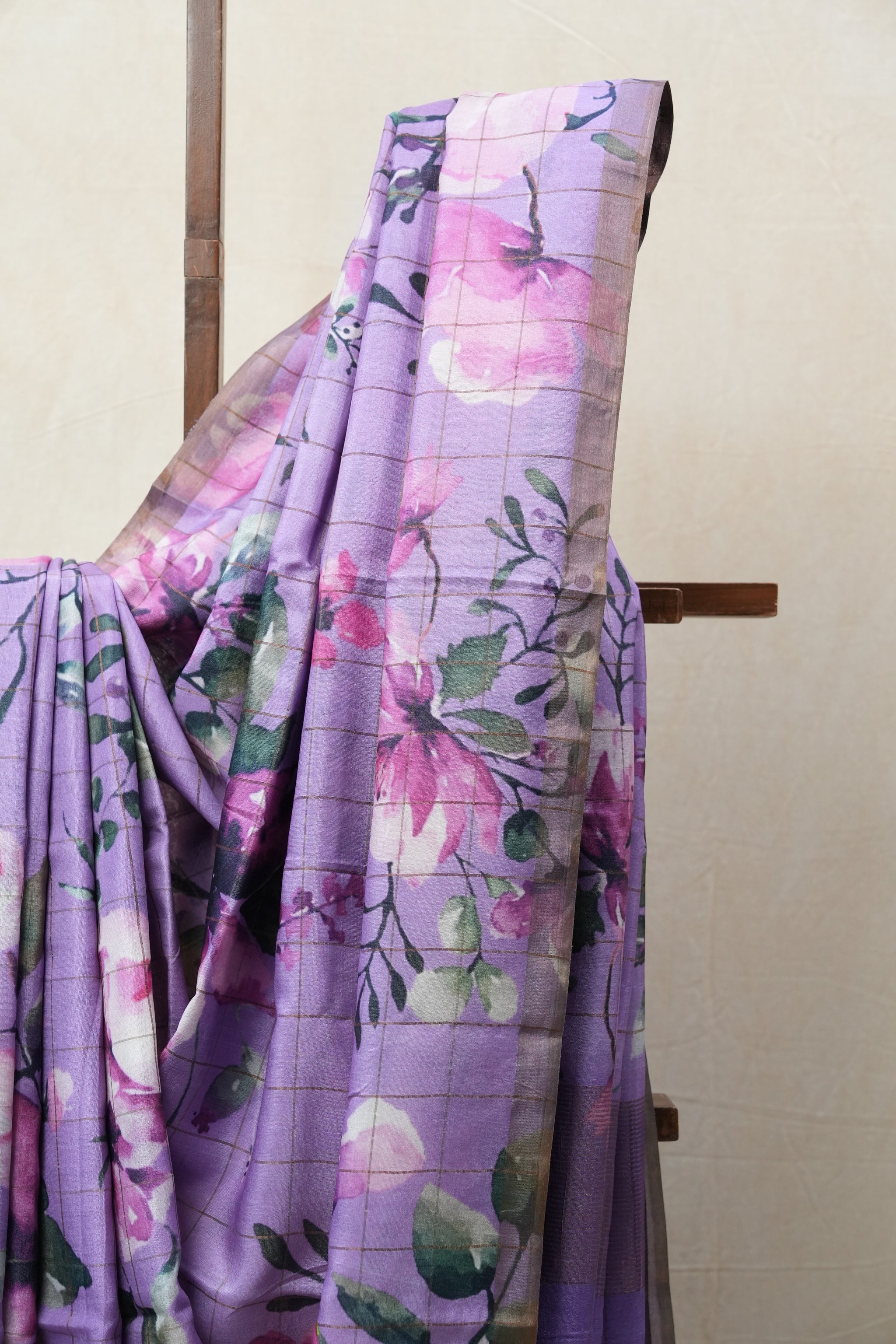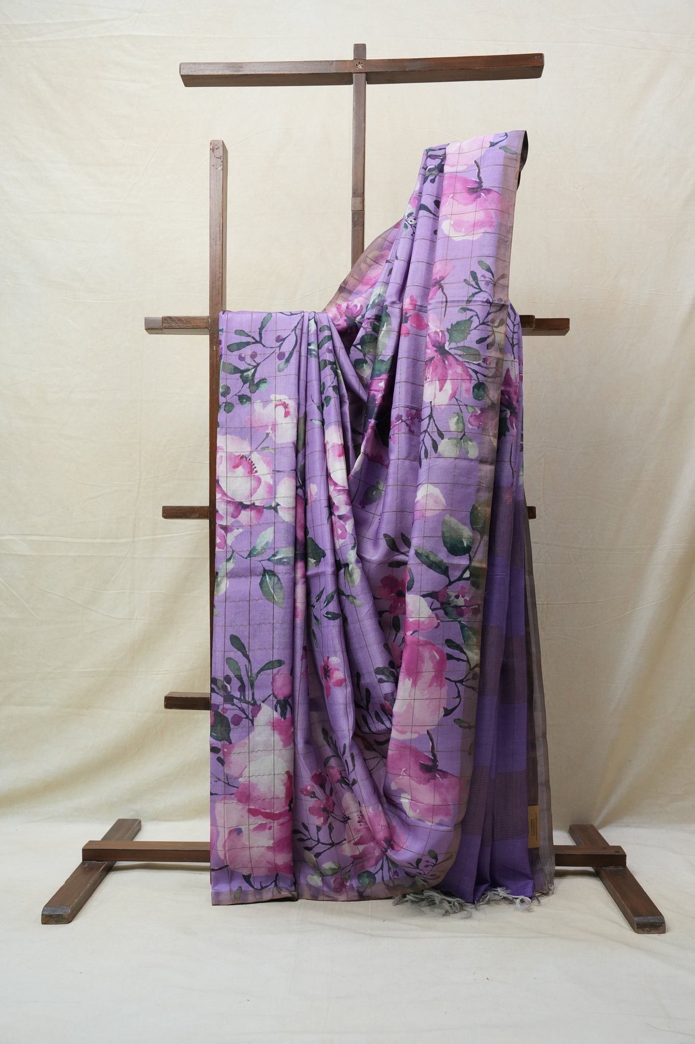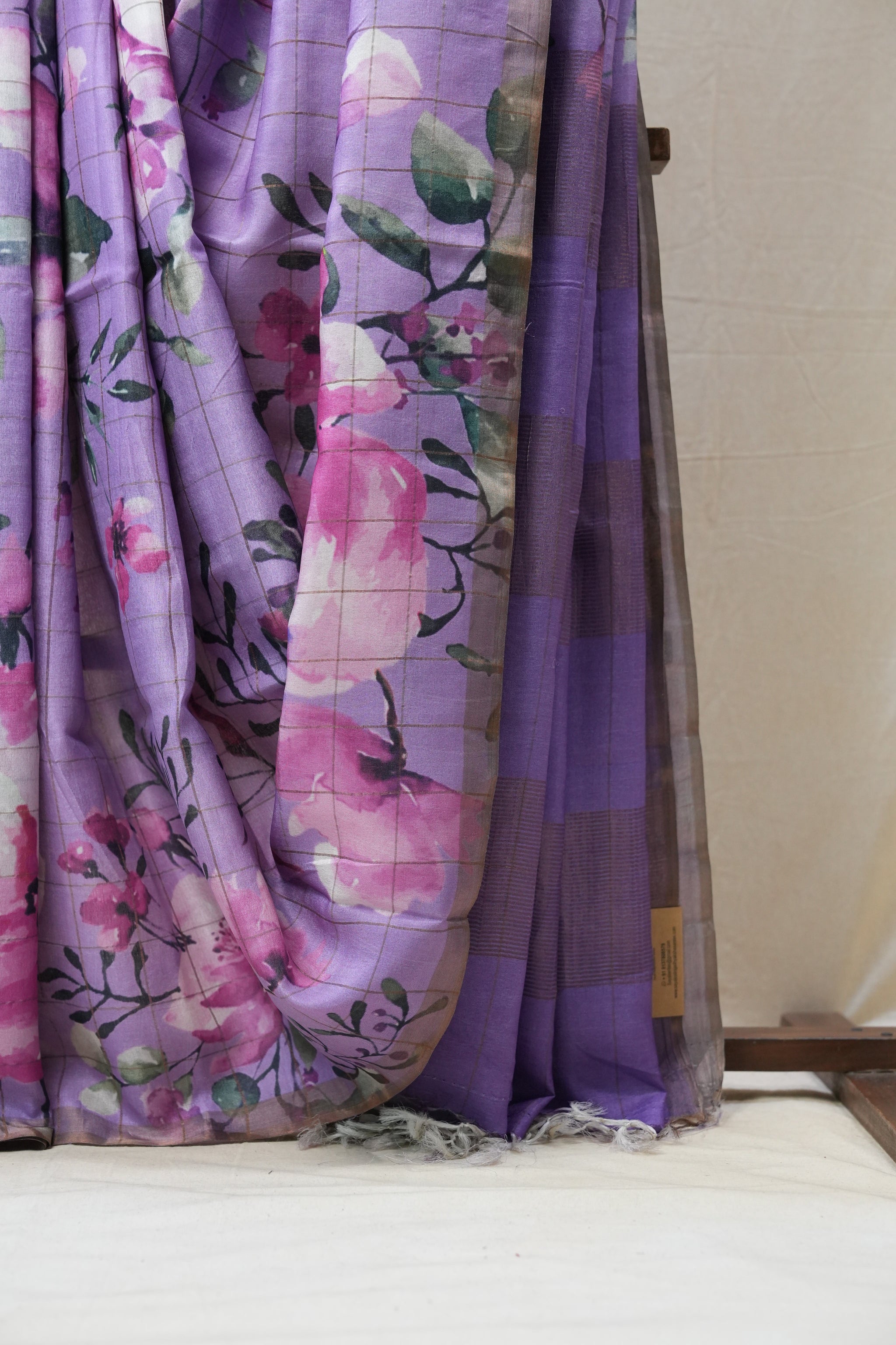 Work - Lavender tussar silk with floral print work and subtle checked texture.