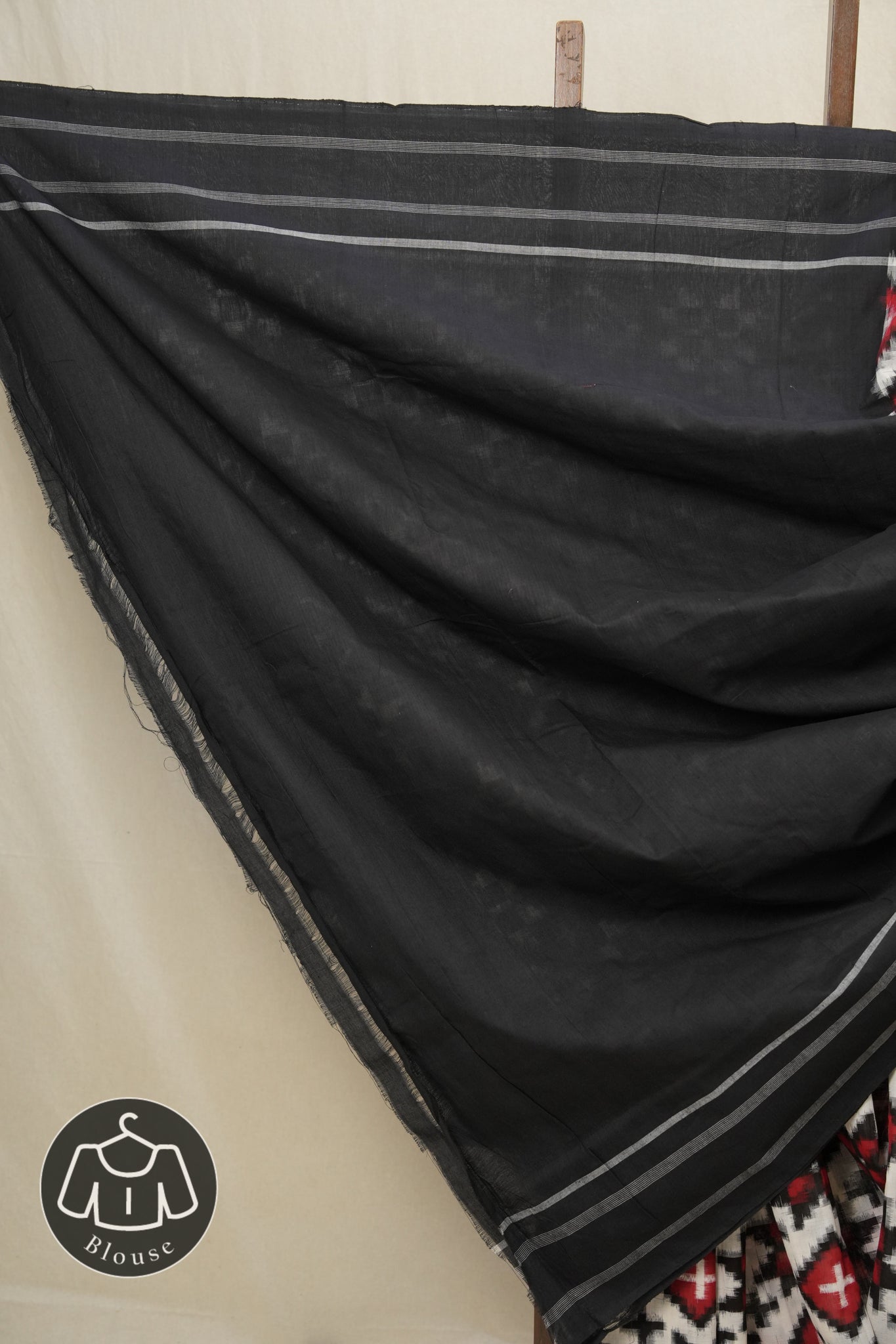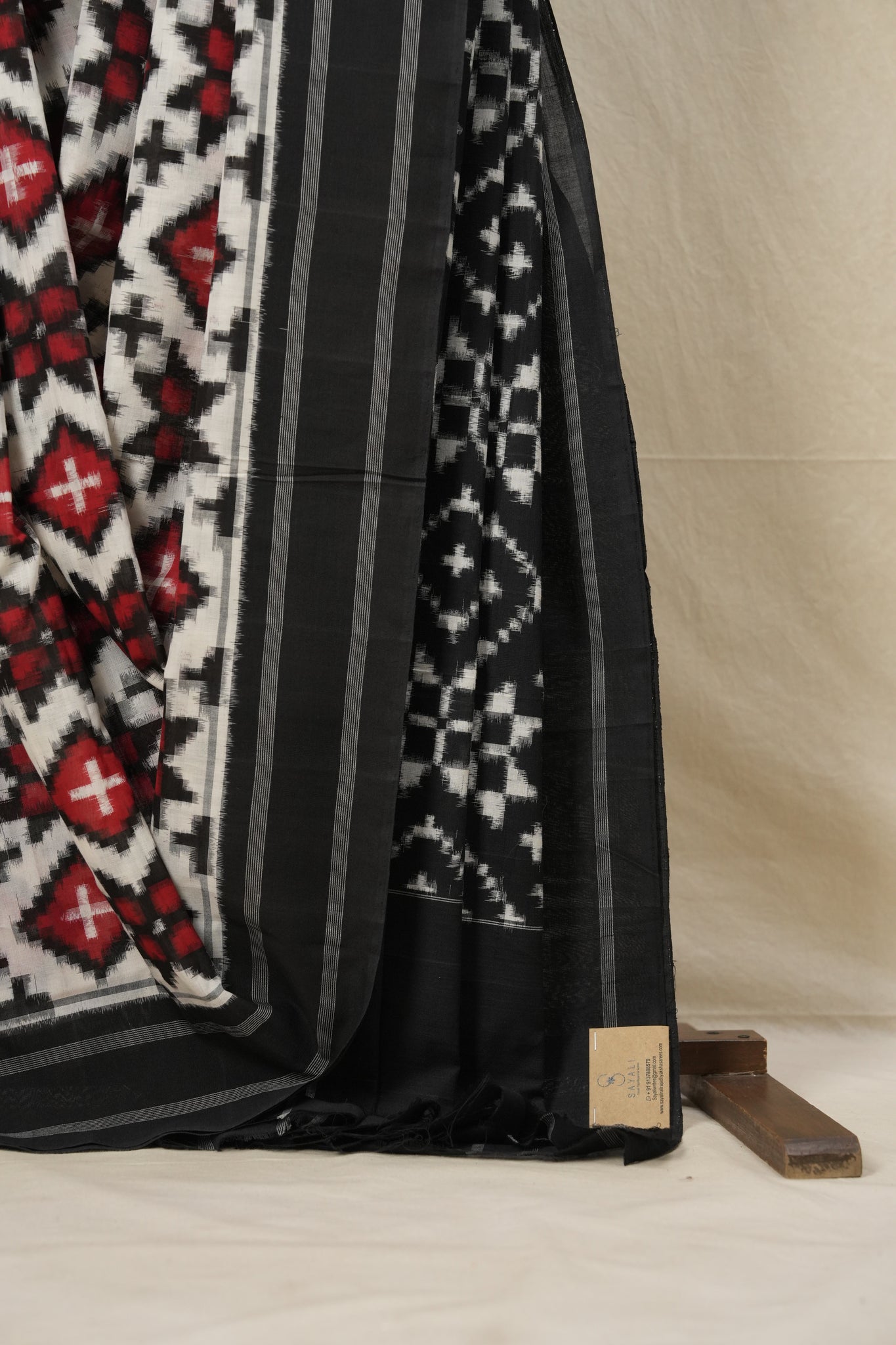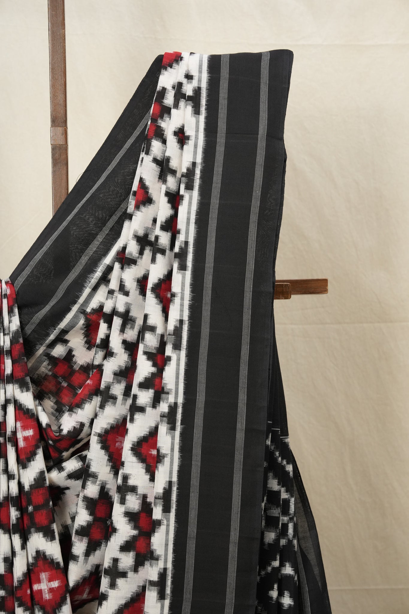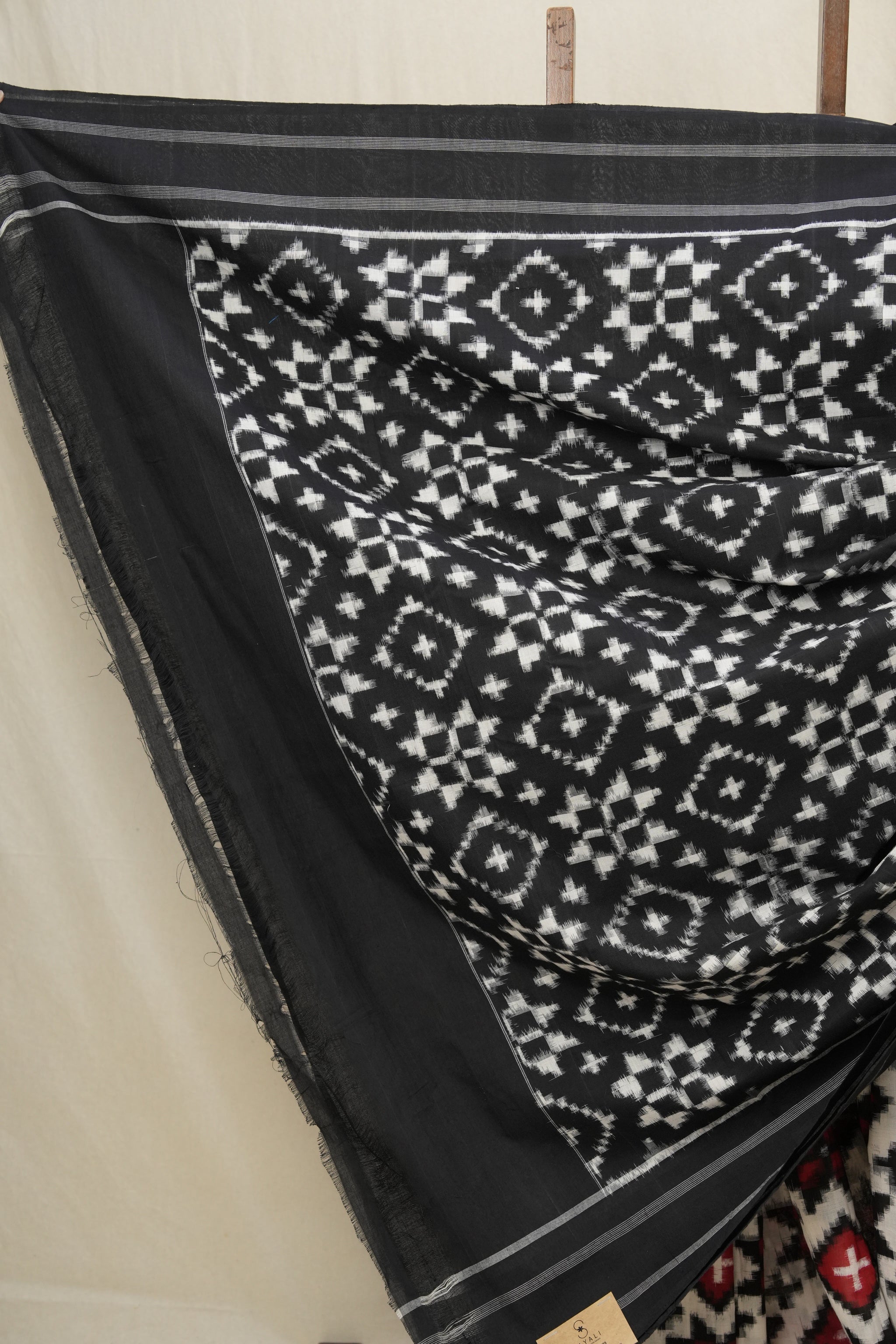 Work - This is a Pochampalli Cotton Ikat saree with black ,white and red color body, complemented by an ikat patterned border and pallu.