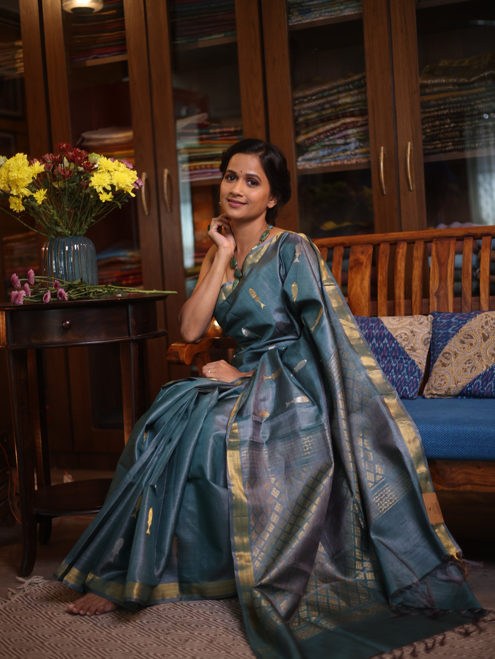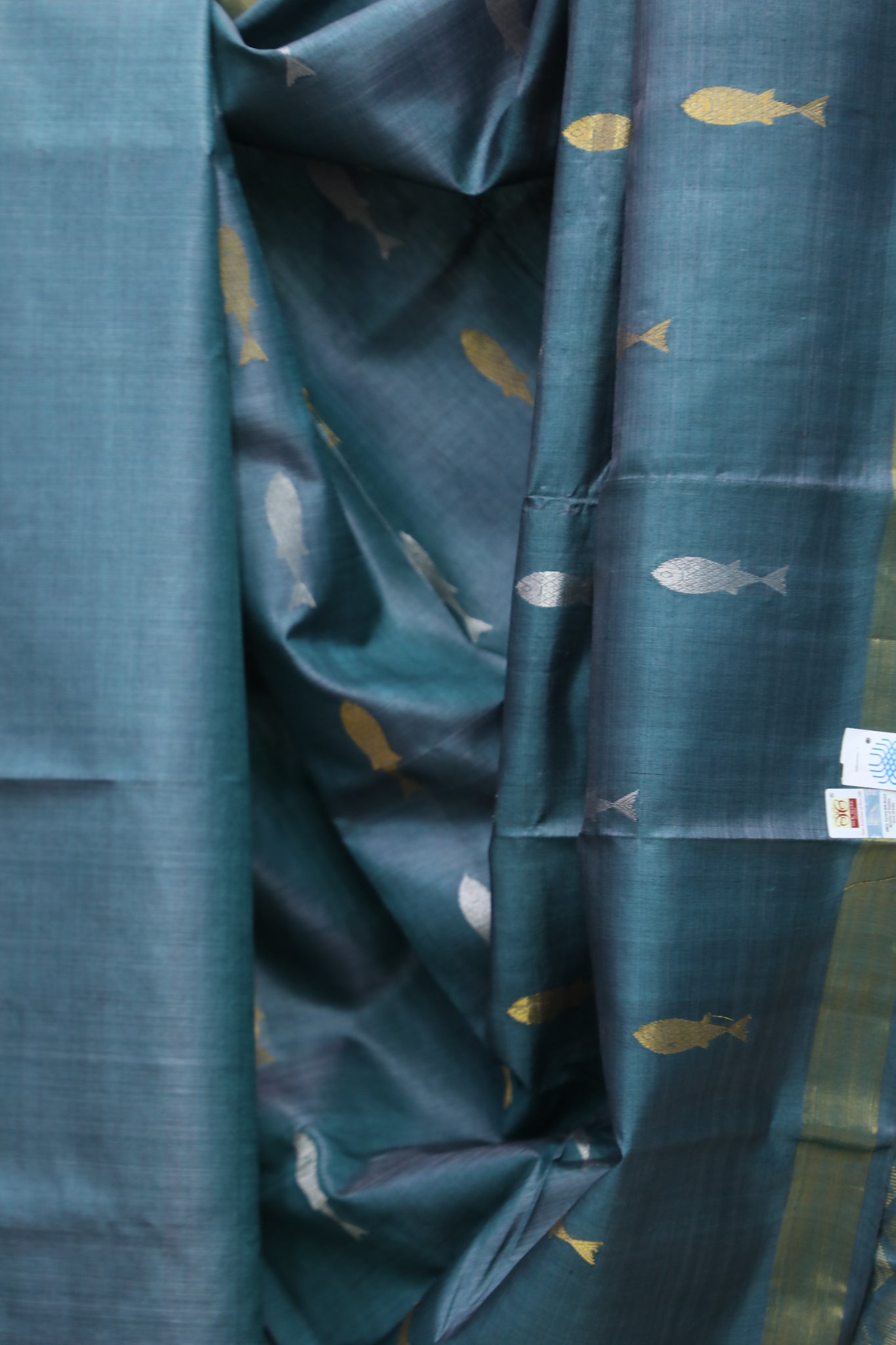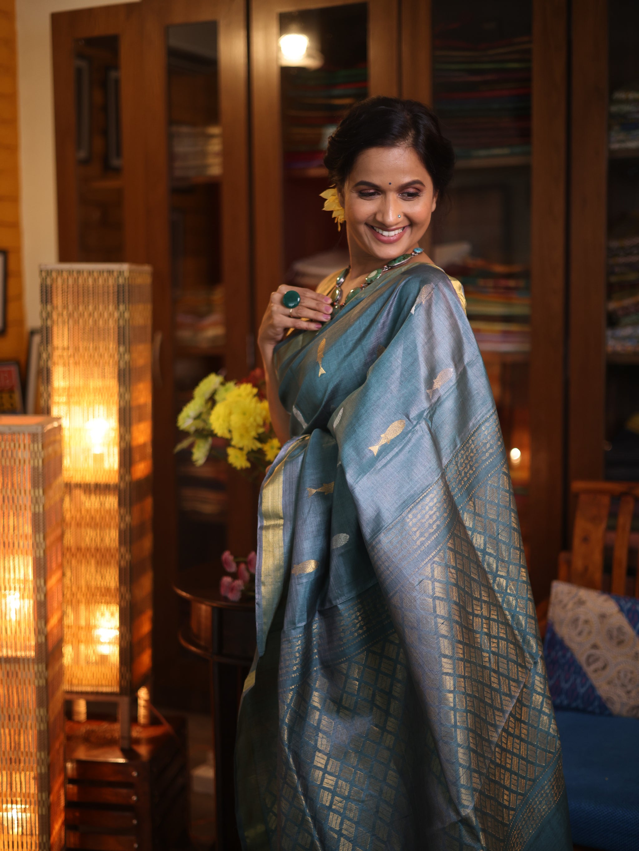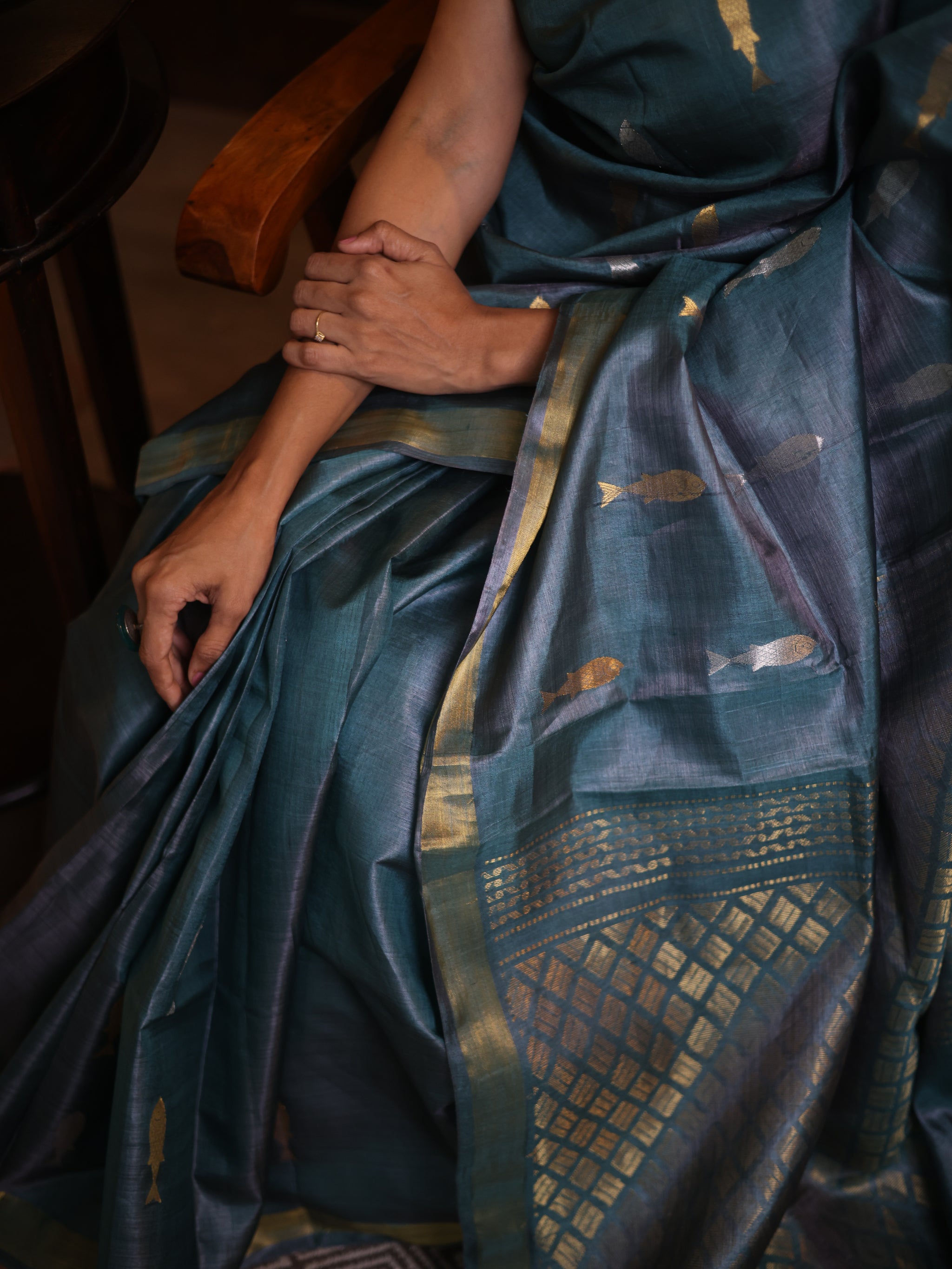 Work - Kosa Tussar silk saree in teal blue, adorned with gold and silver fish motifs and complemented by a zari border and intricately woven pallu.