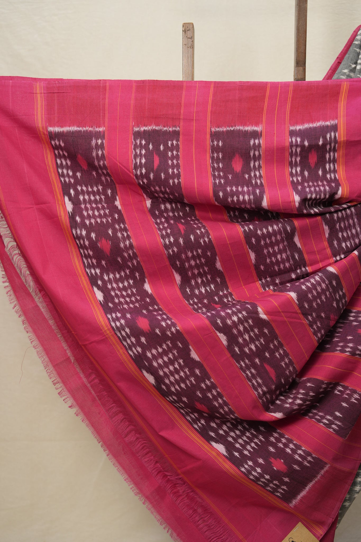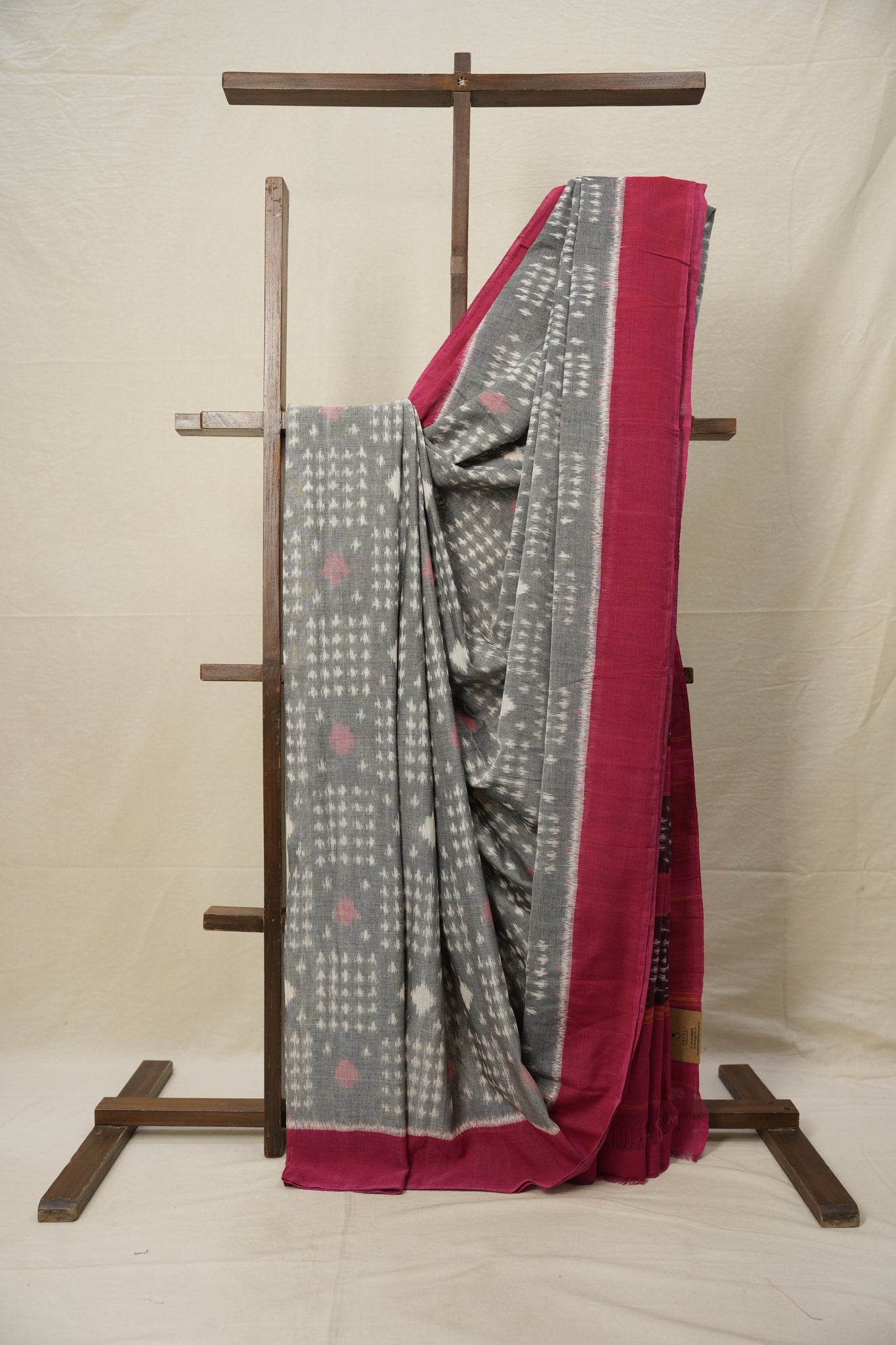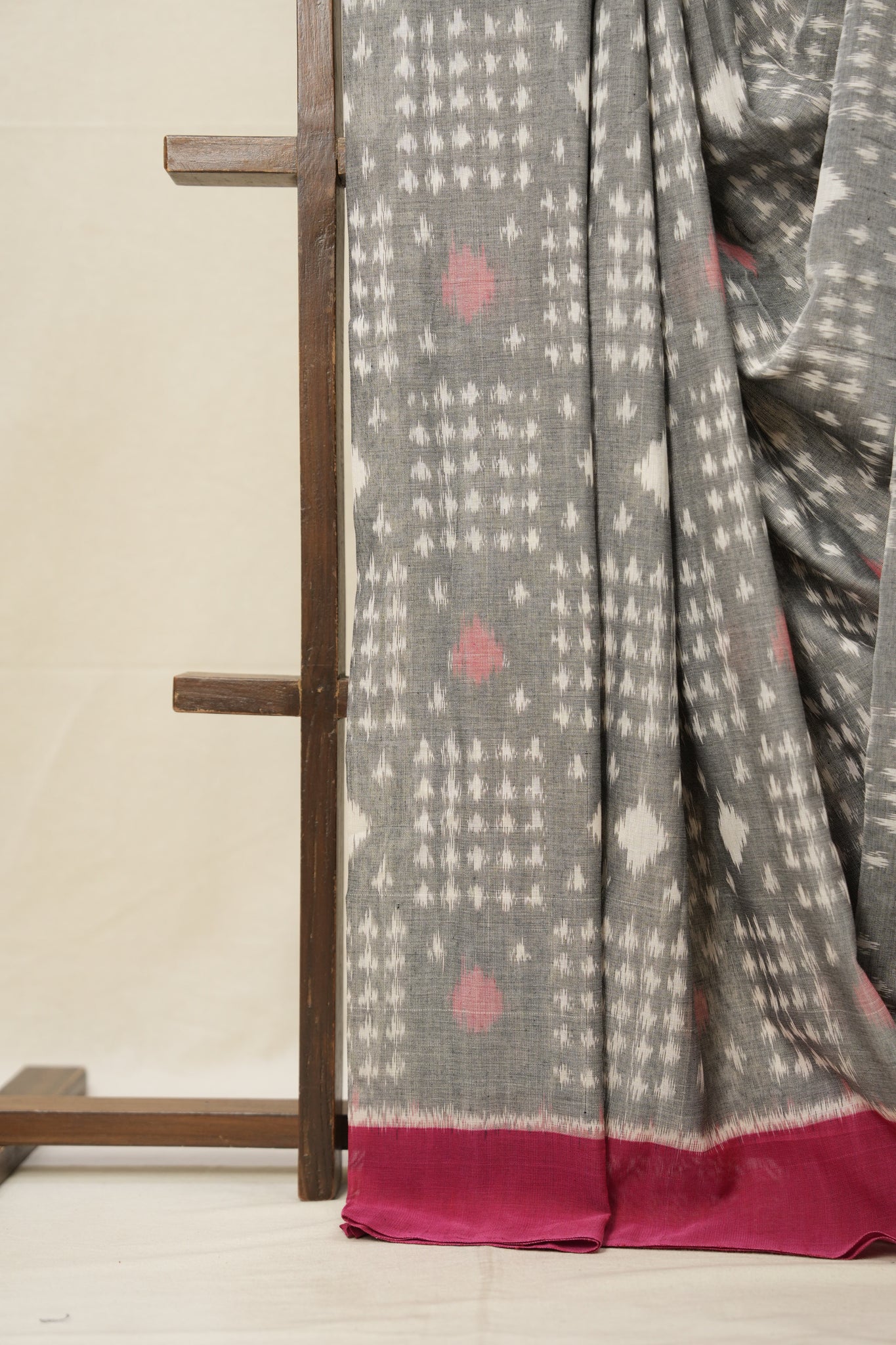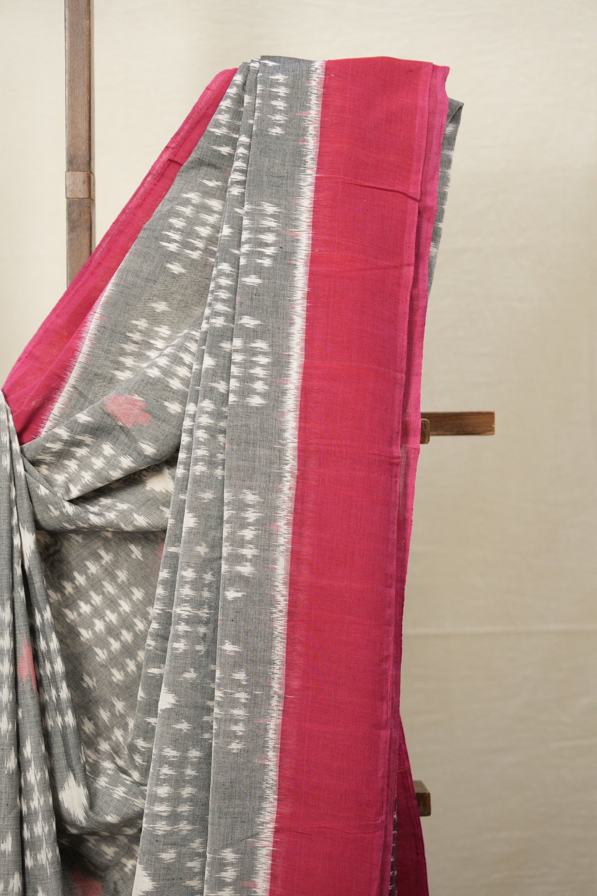 Work - This is a Pochampalli Cotton Ikat saree with Grey color body, complemented by an ikat patterned border and pallu.