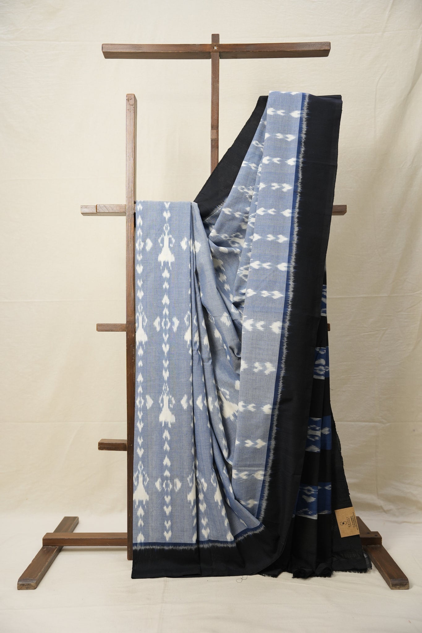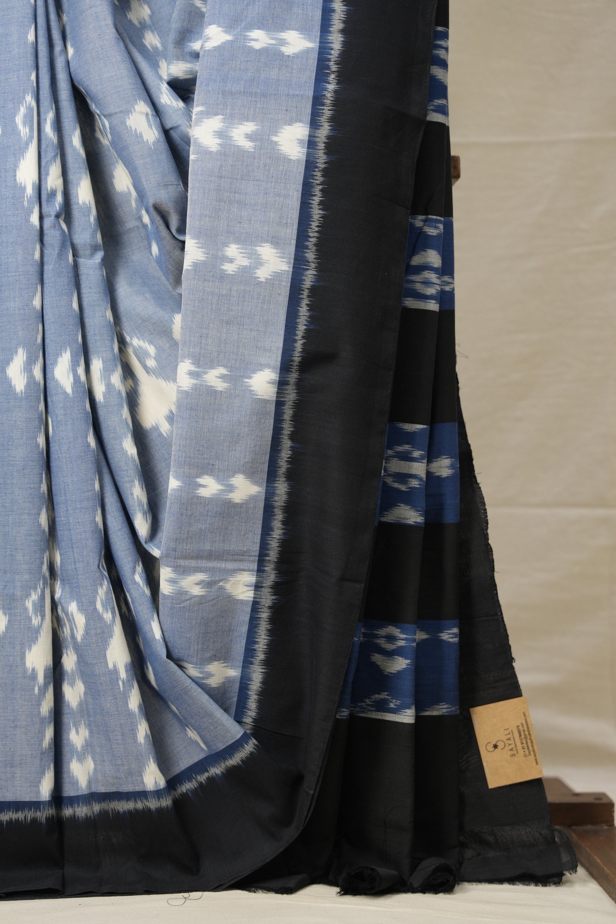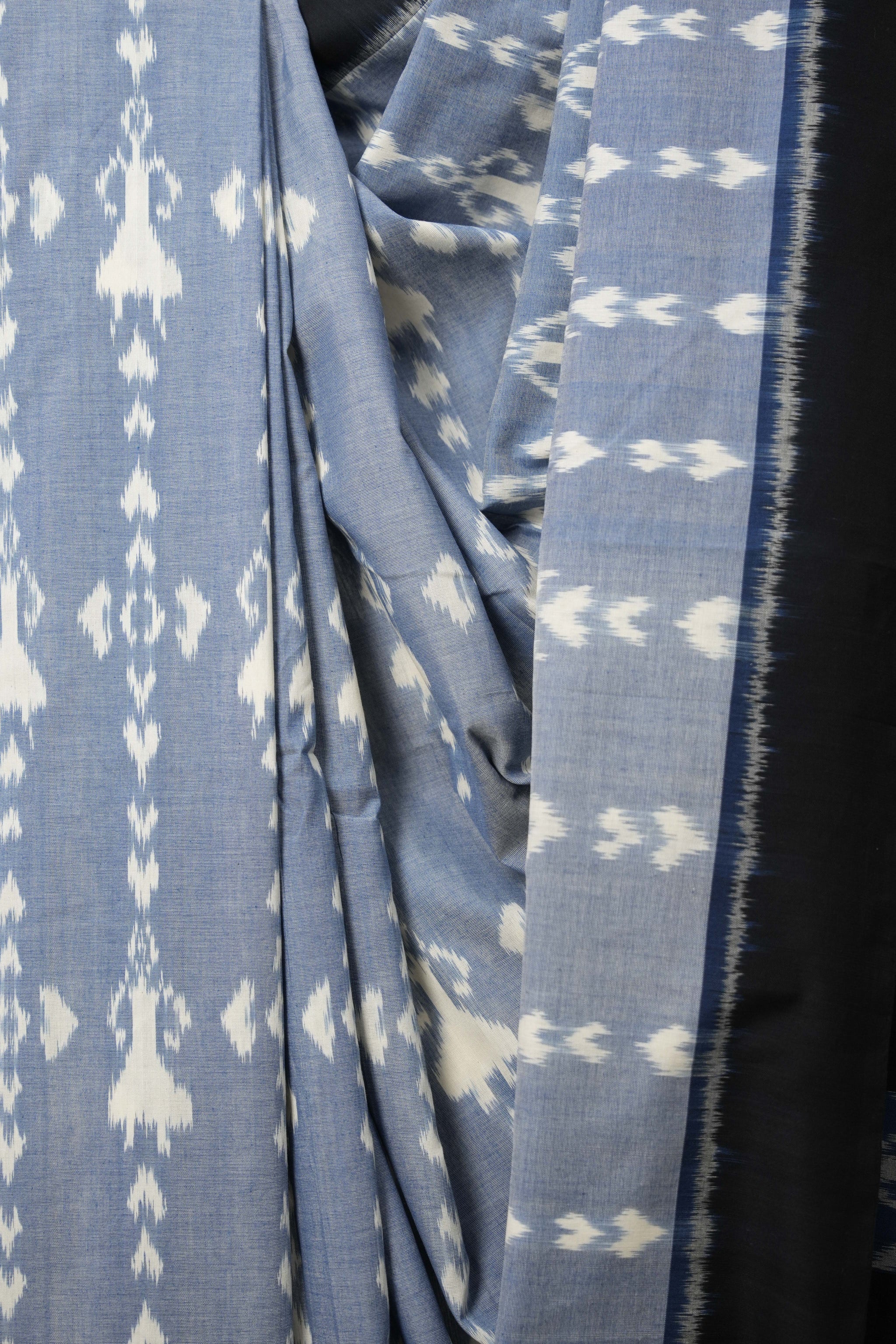 Work - This is a Pochampalli Cotton Ikat saree with Jeans Blue color body, complemented by an ikat patterned border and pallu.