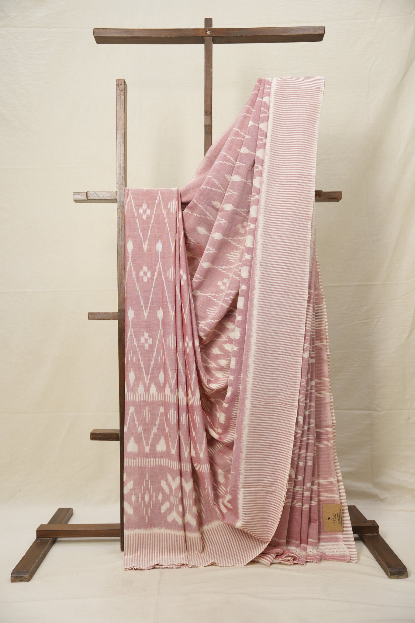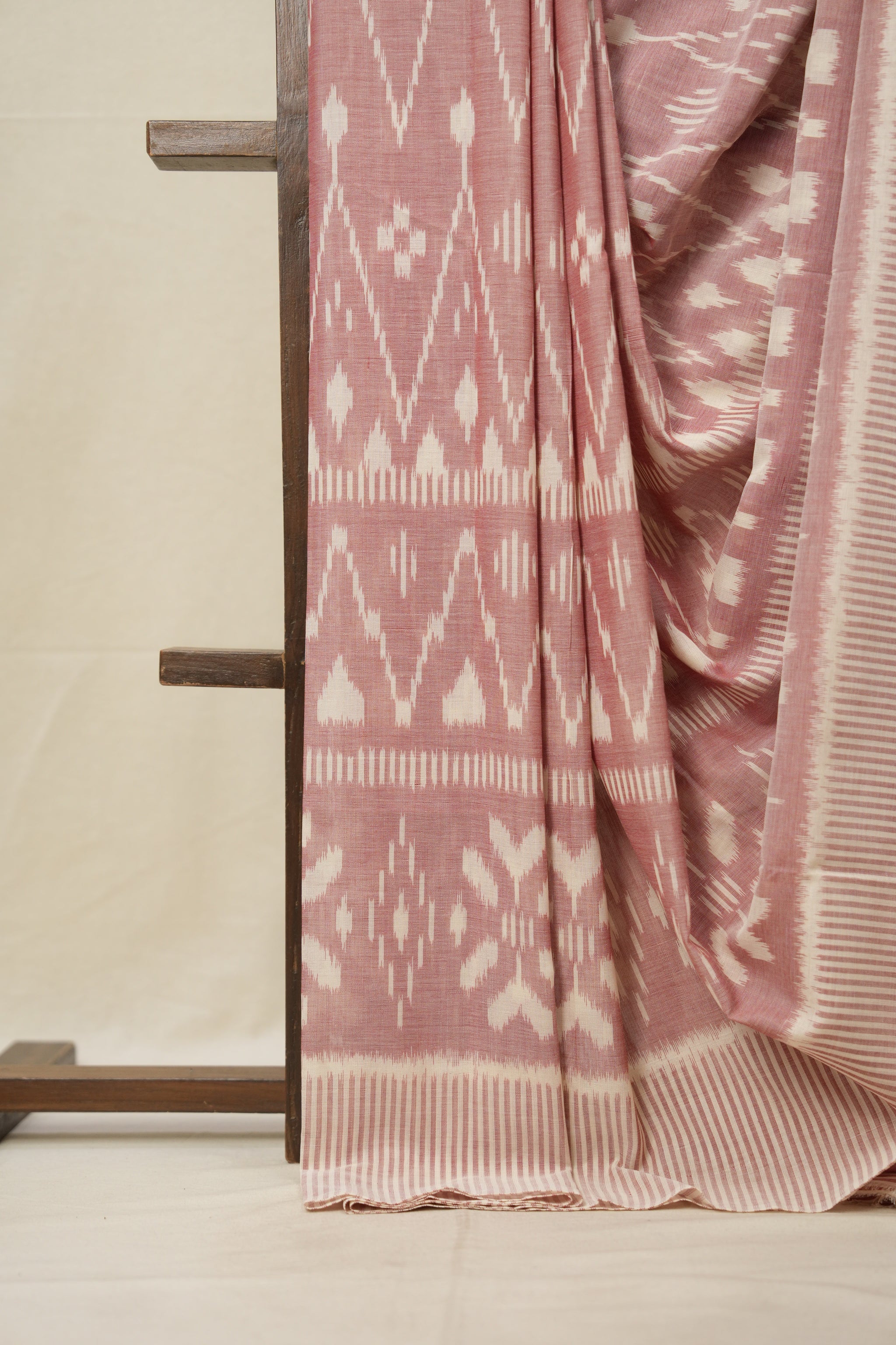 Work - This is a Pochampalli Cotton Ikat saree with Peach White color body, complemented by an ikat patterned border and pallu.