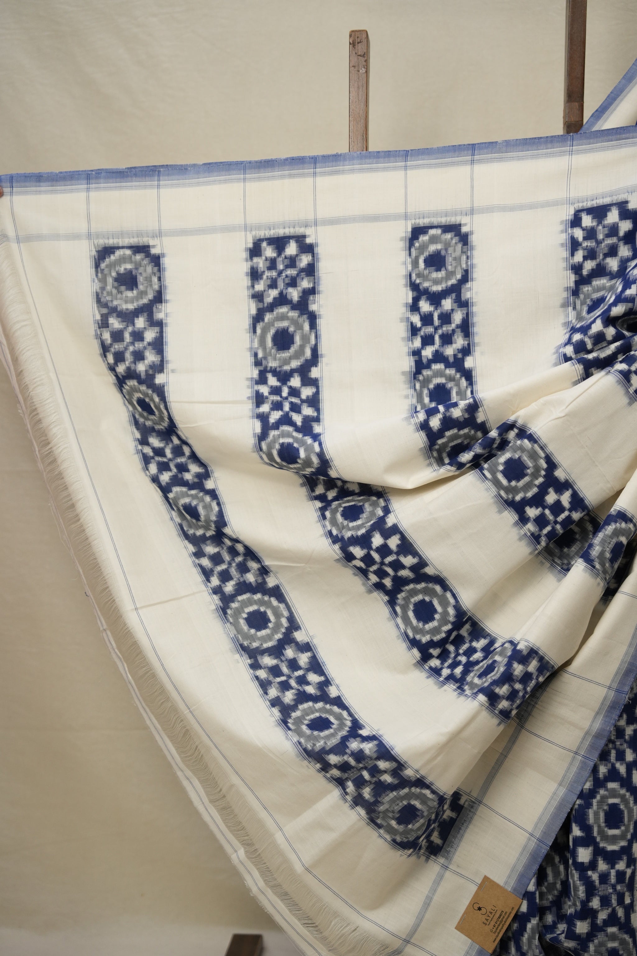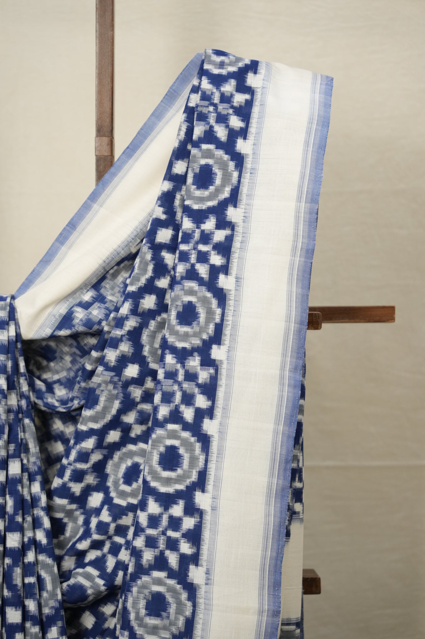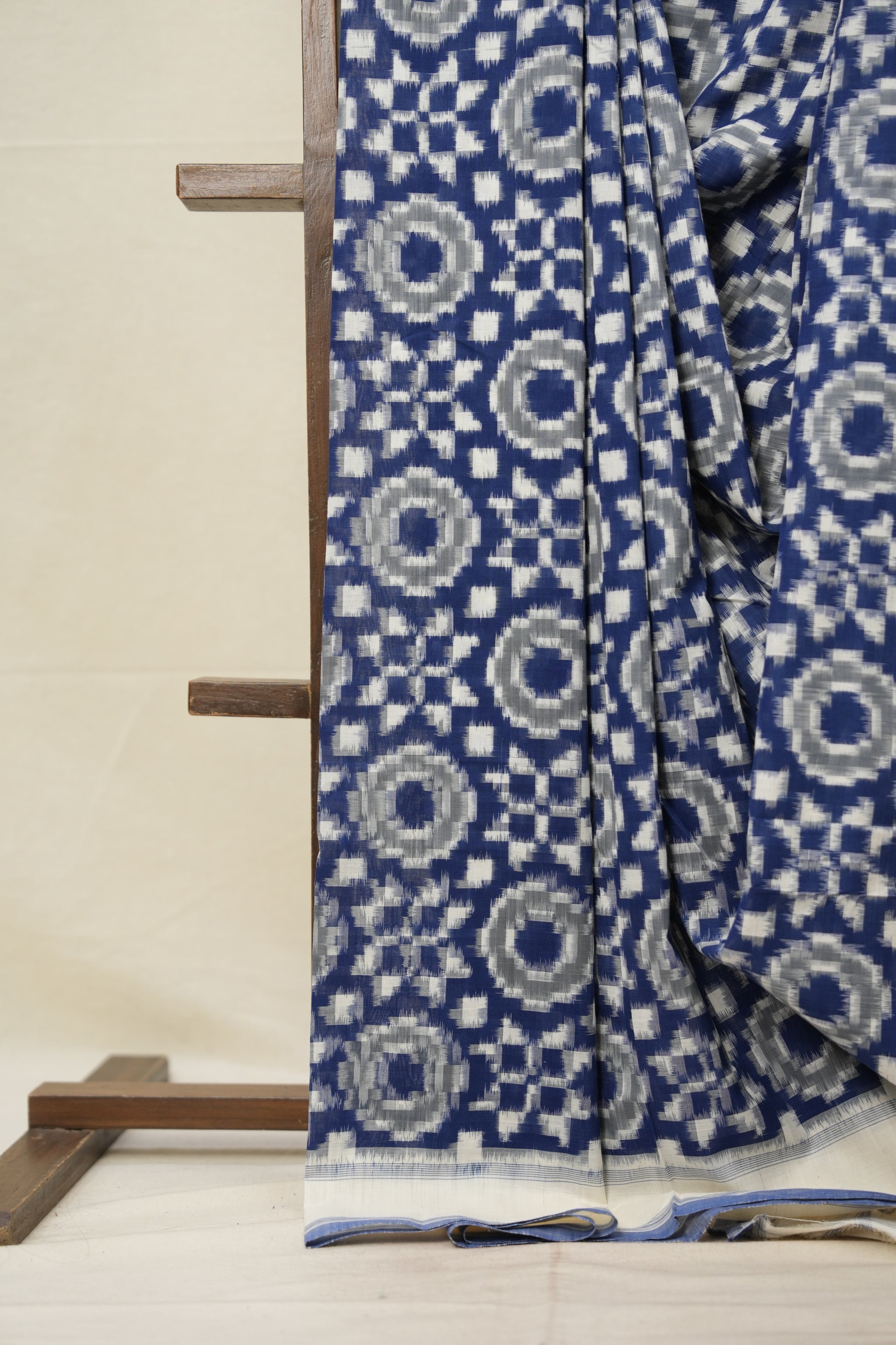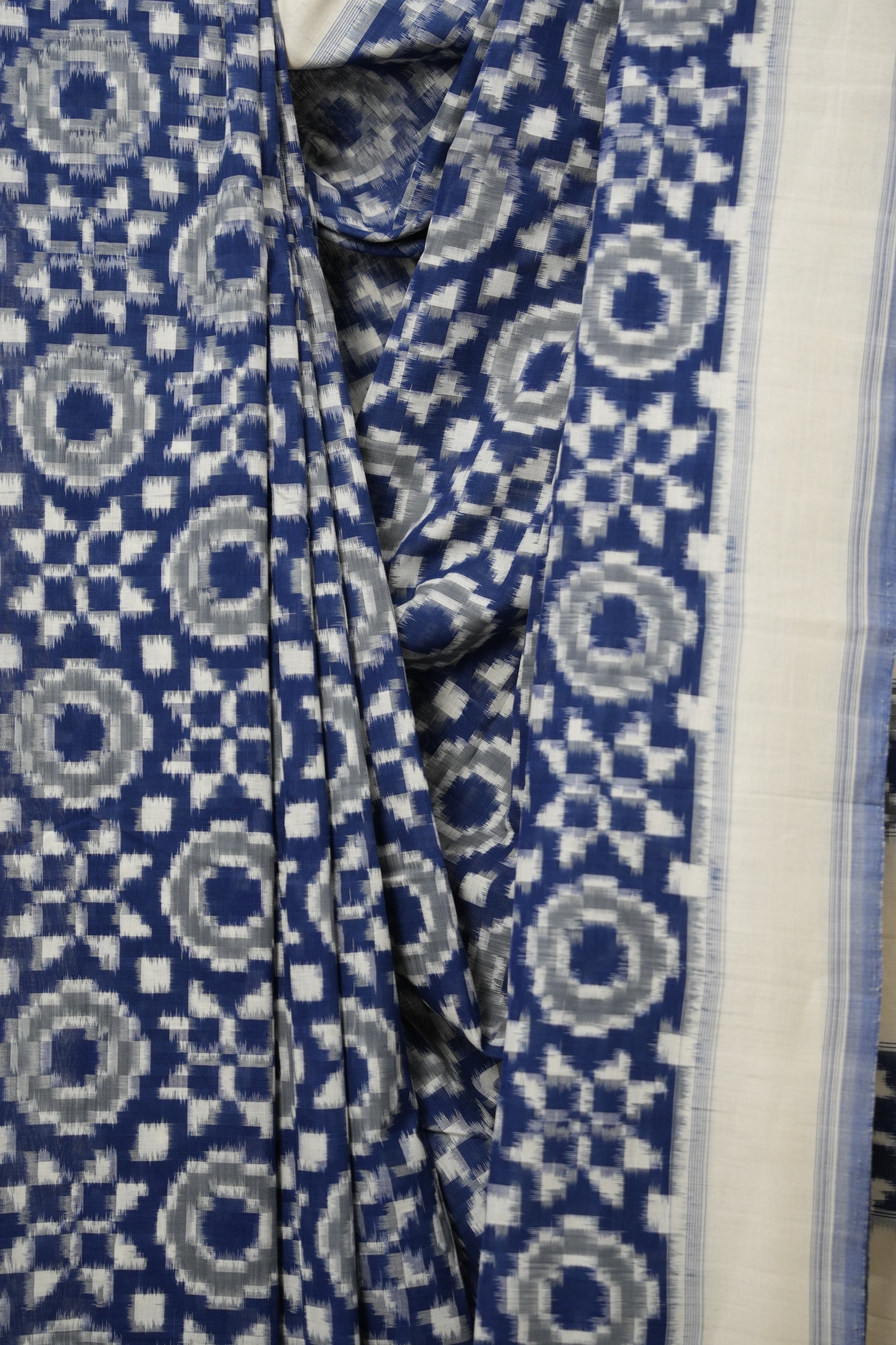 Work - This is a Pochampalli Cotton Ikat saree with blue ,white color body, complemented by an ikat patterned border and pallu.