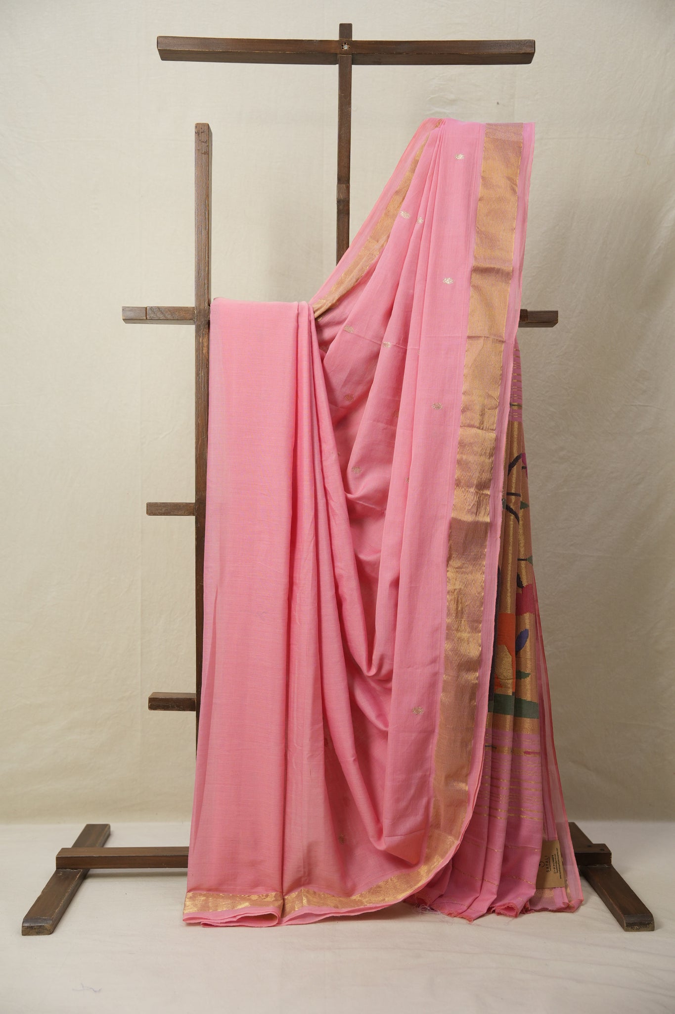 Work - This light pink cotton paithani saree with golden butti all over body and gold zari border with Fancy pallu.