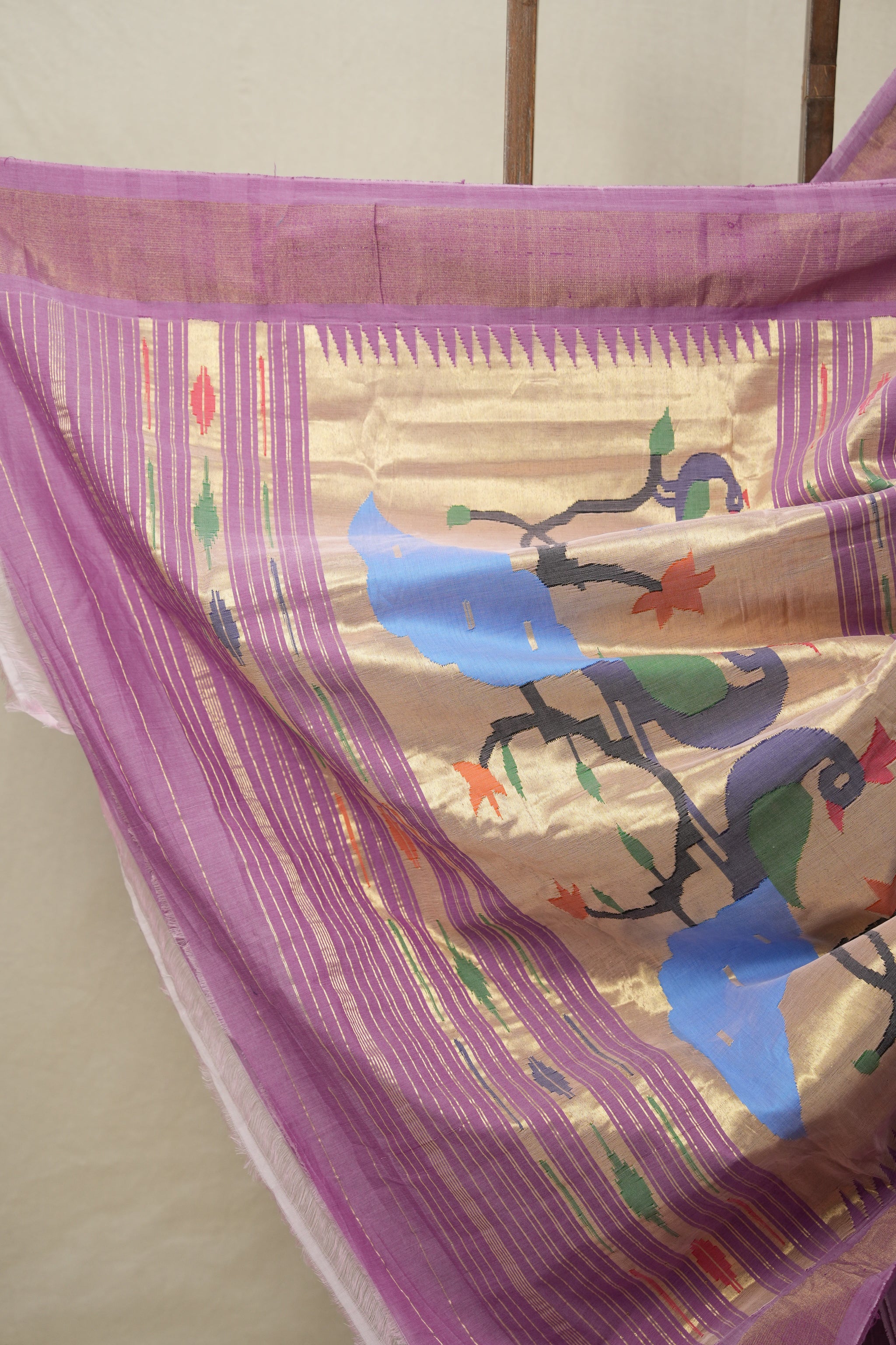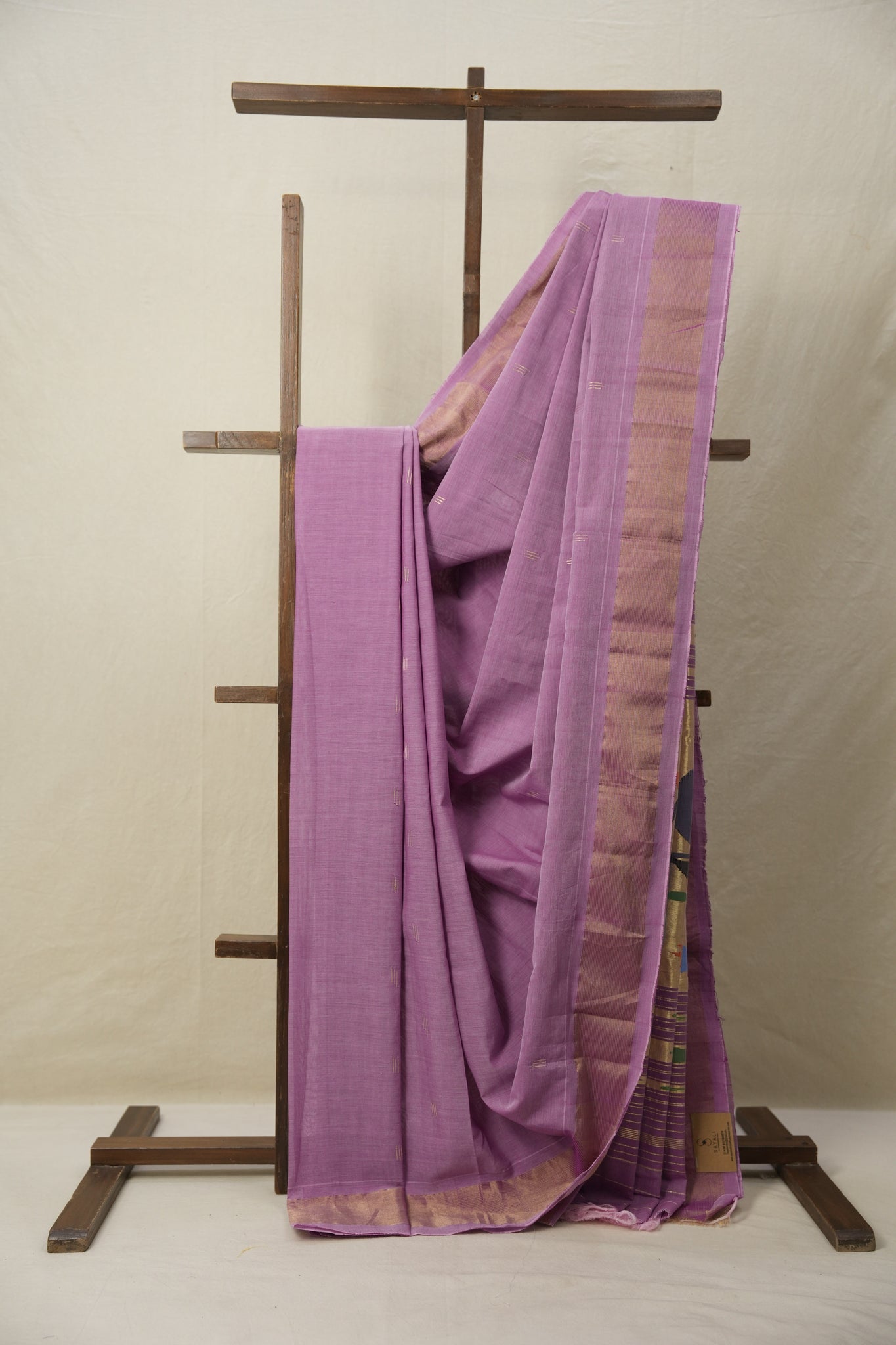 Work - This lilac cotton paithani saree with golden butti all over body and gold zari border with Fancy pallu.