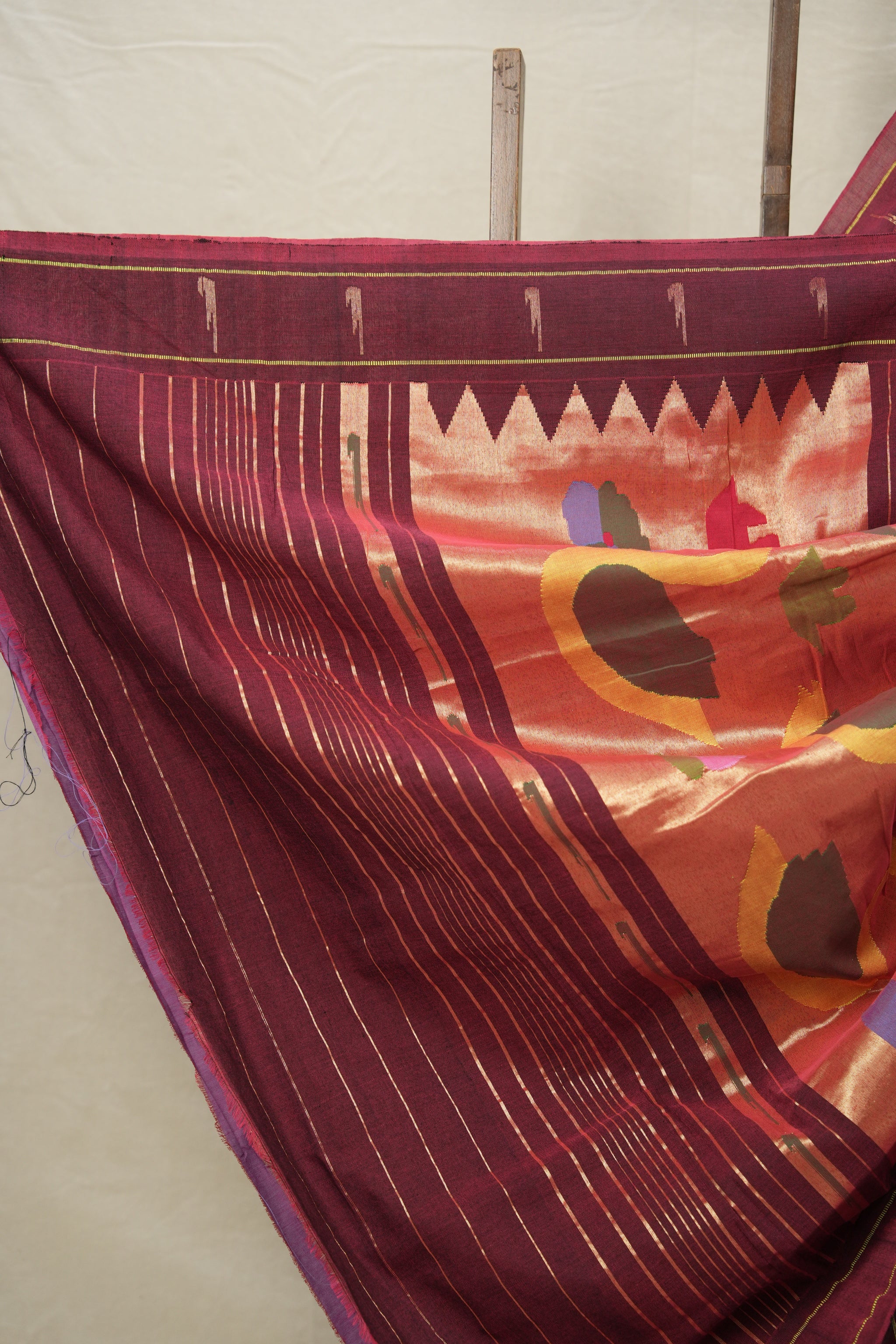Work - This Maroon cotton paithani saree with golden butti all over body and gold zari border with Fancy pallu.