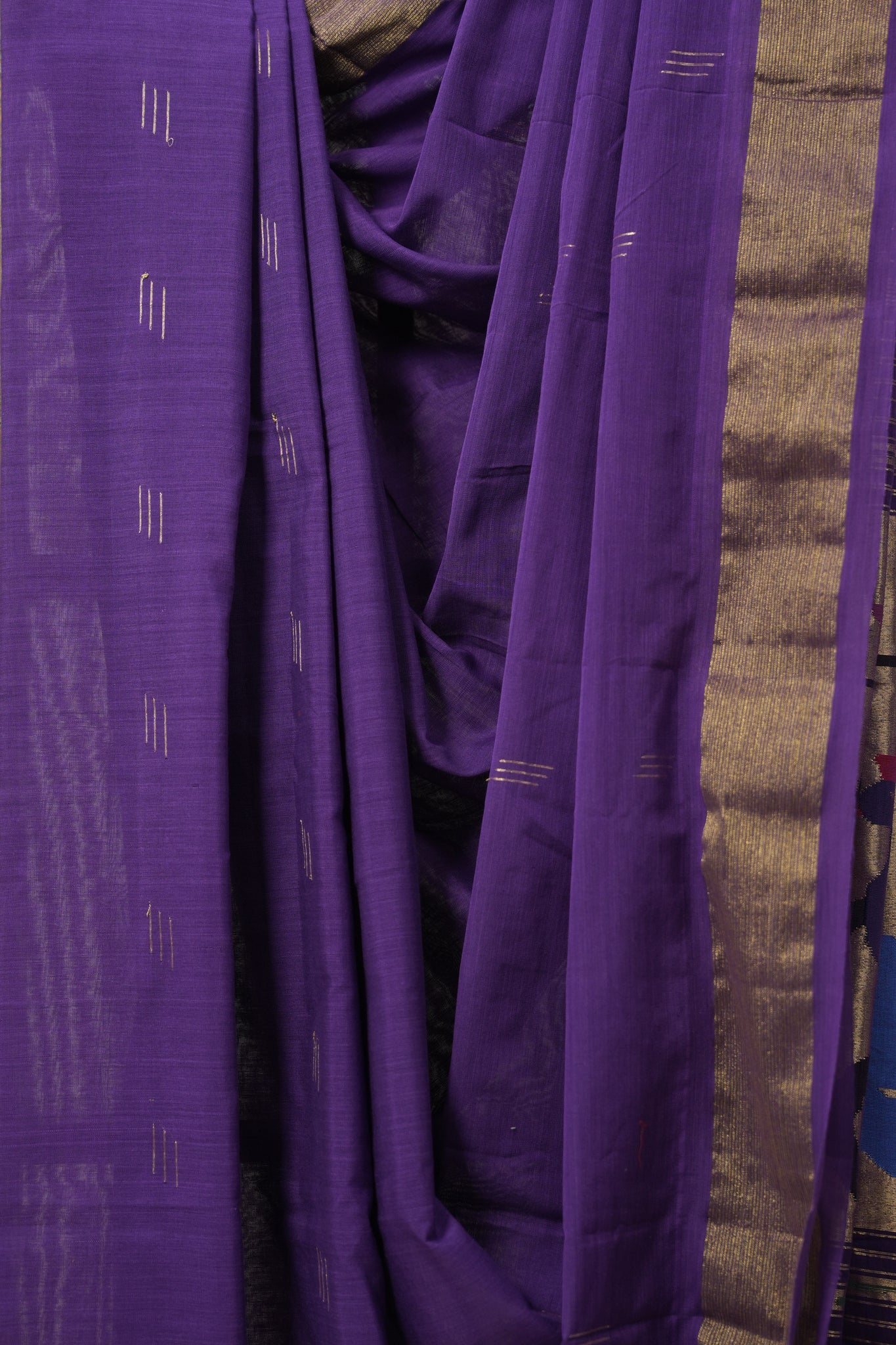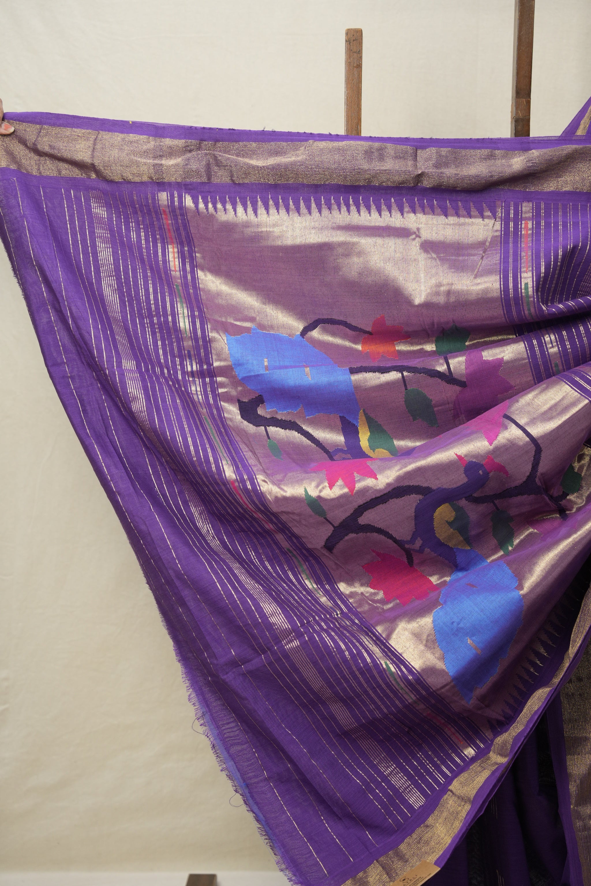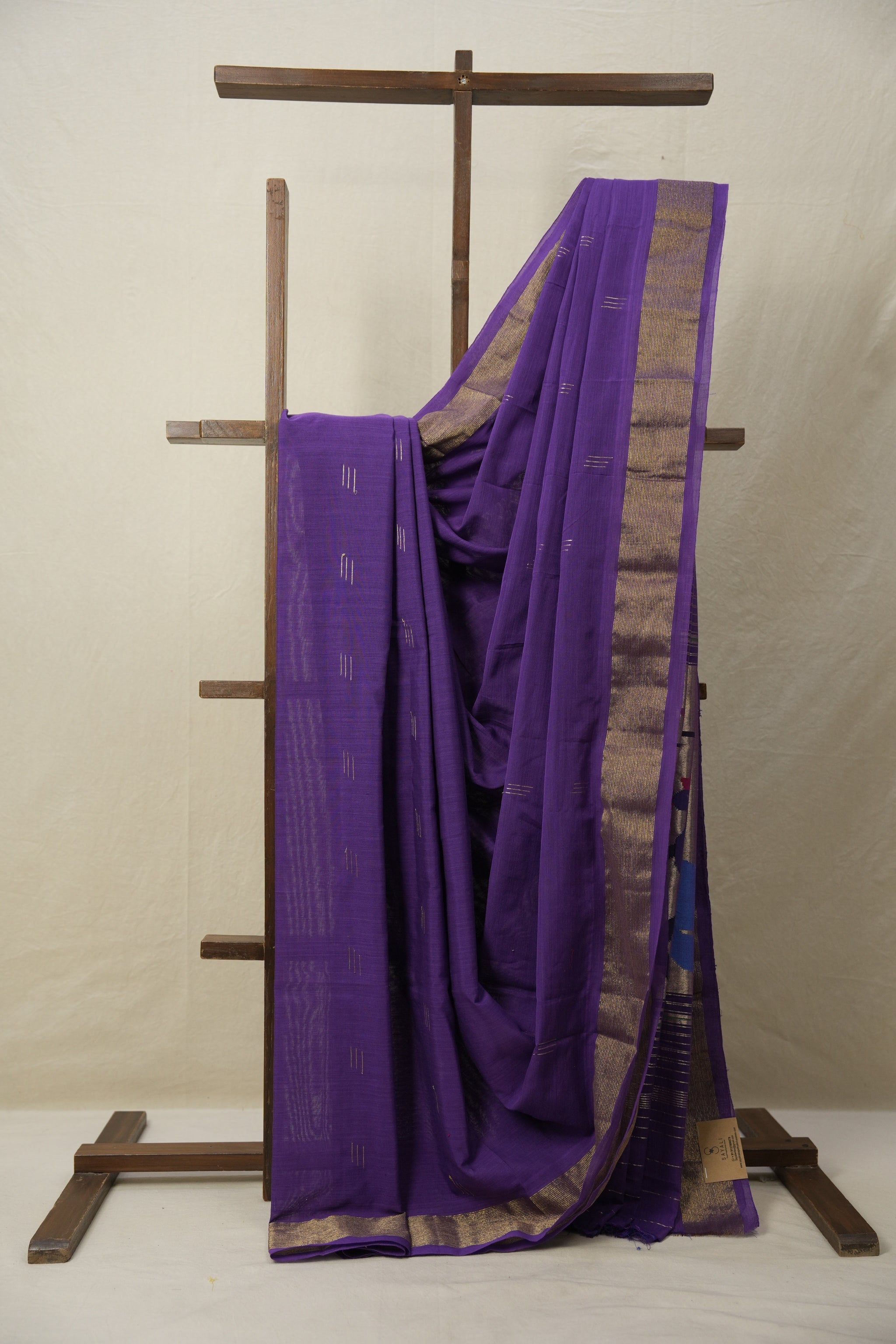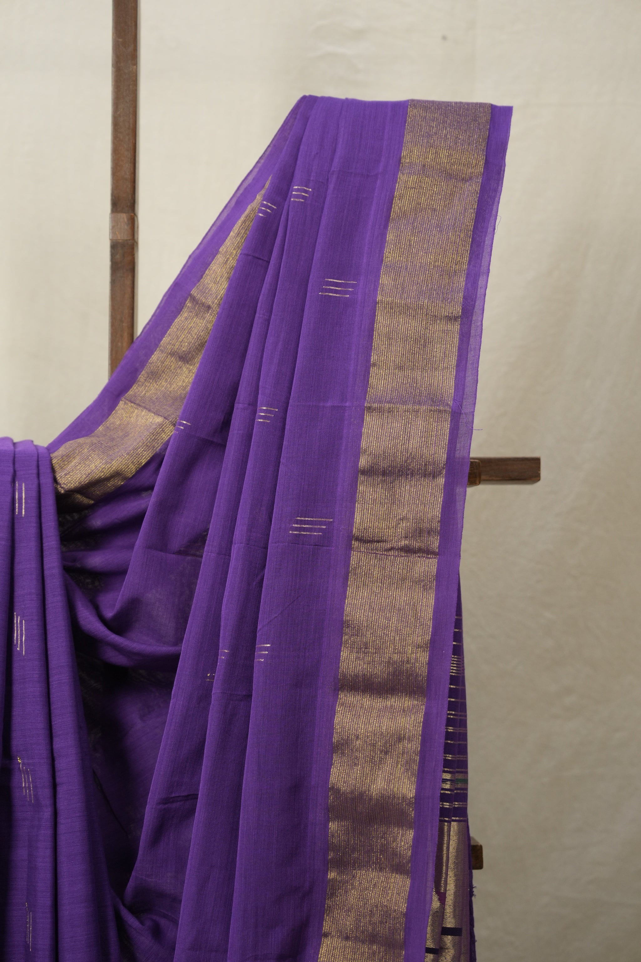 Work - This violet cotton paithani saree with golden butti all over body and gold zari border with Fancy pallu.
