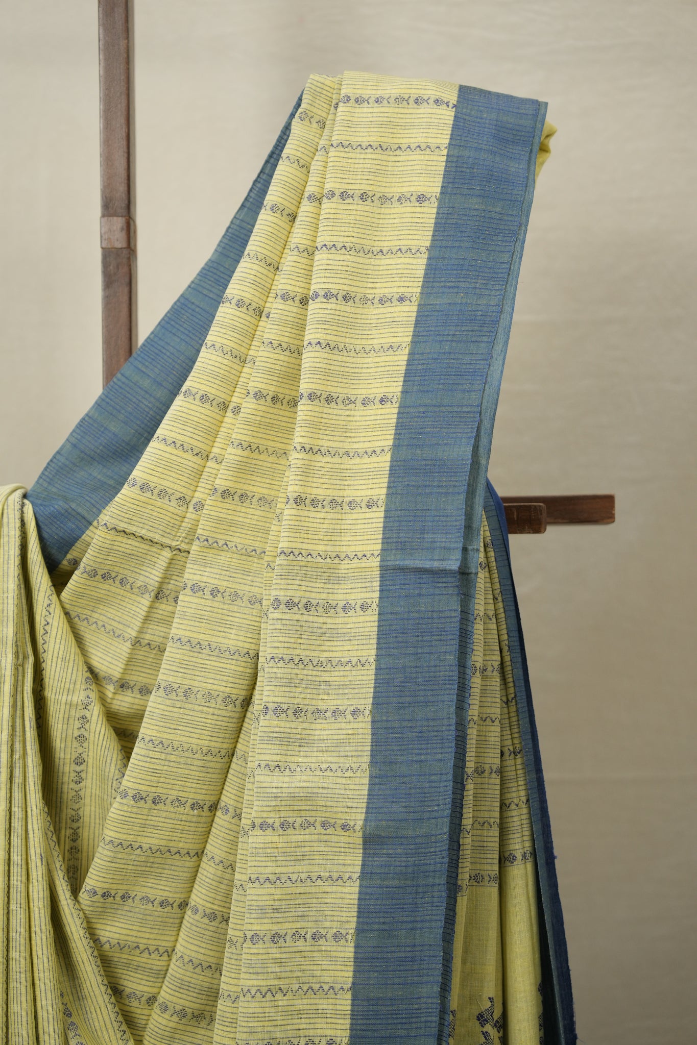 Work - The Bengal cotton saree features a soft pastel-toned body with a vibrant contrast border, highlighted by woven fish and zigzag patterns. Its pallu is adorned with intricate motifs resembling animal faces, adding a distinctive traditional charm.