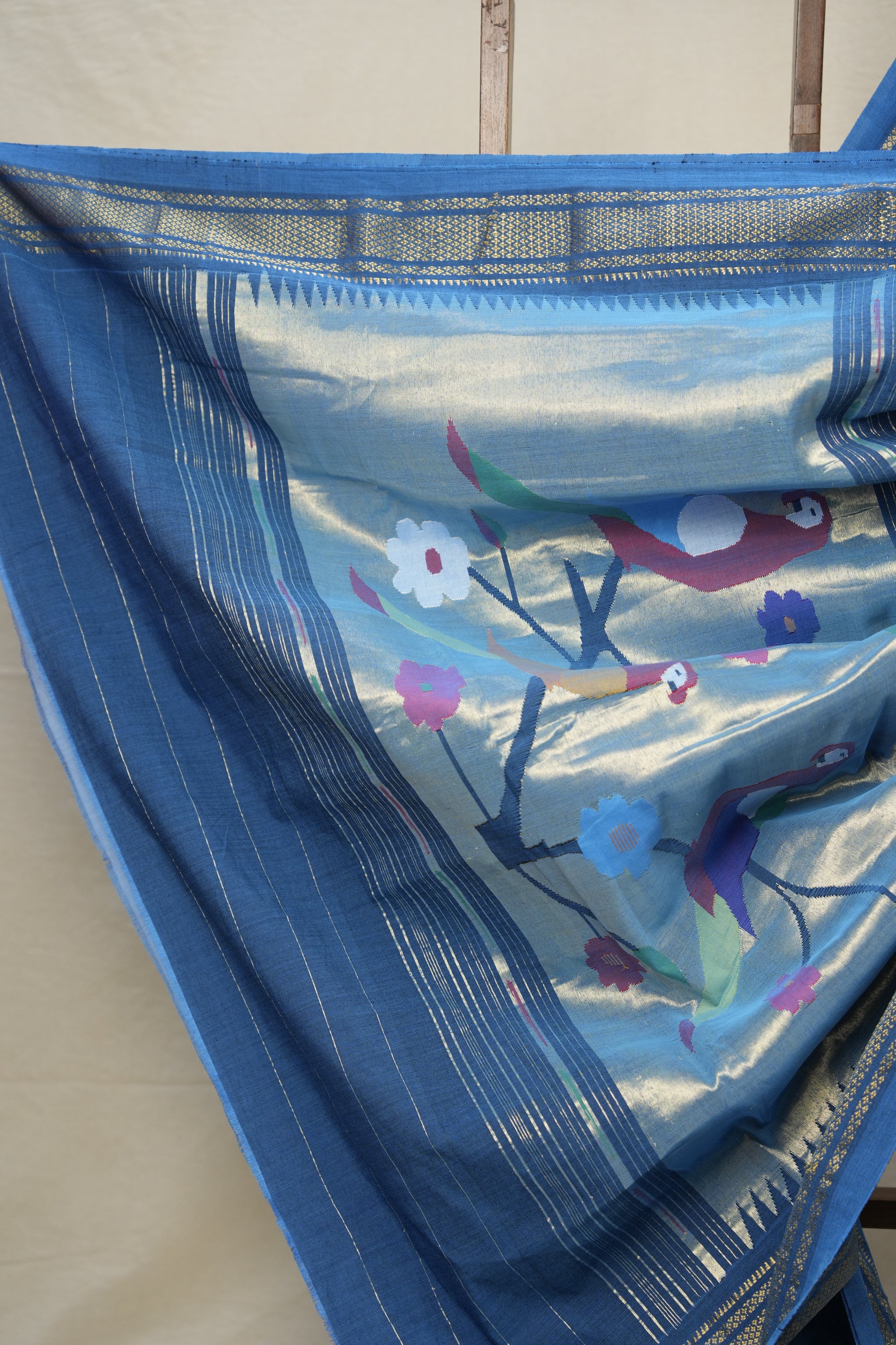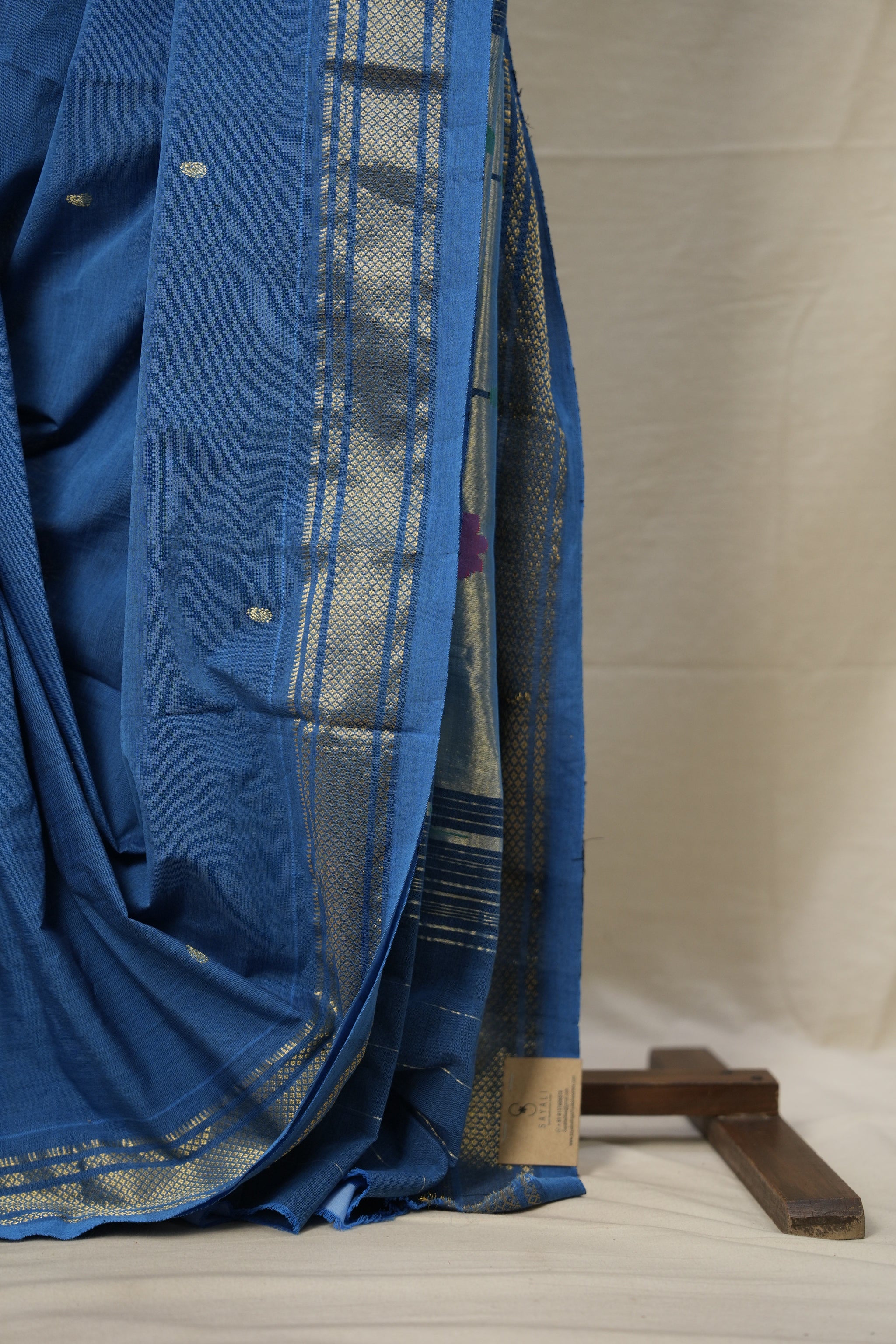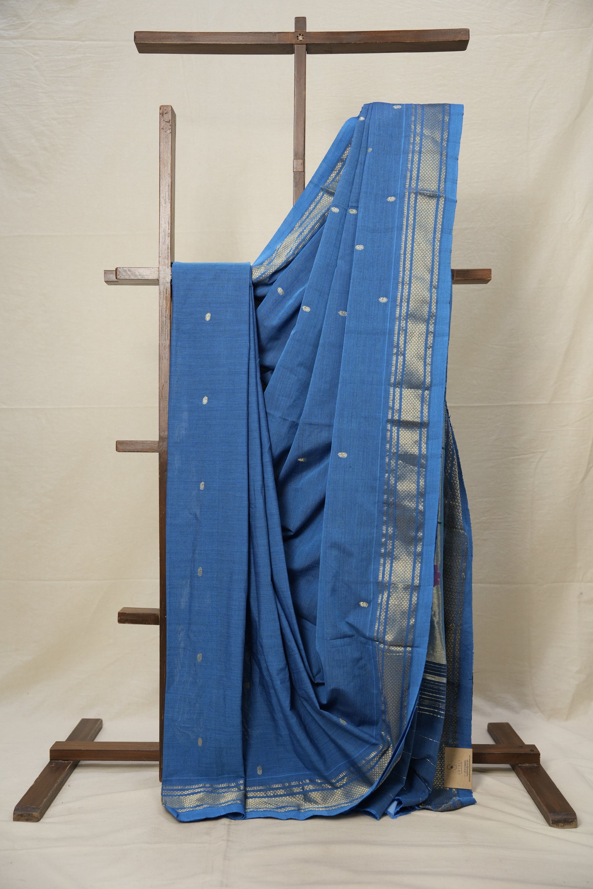 Work - Blue cotton paithani saree with golden butti and gold zari border with fancy pallu.