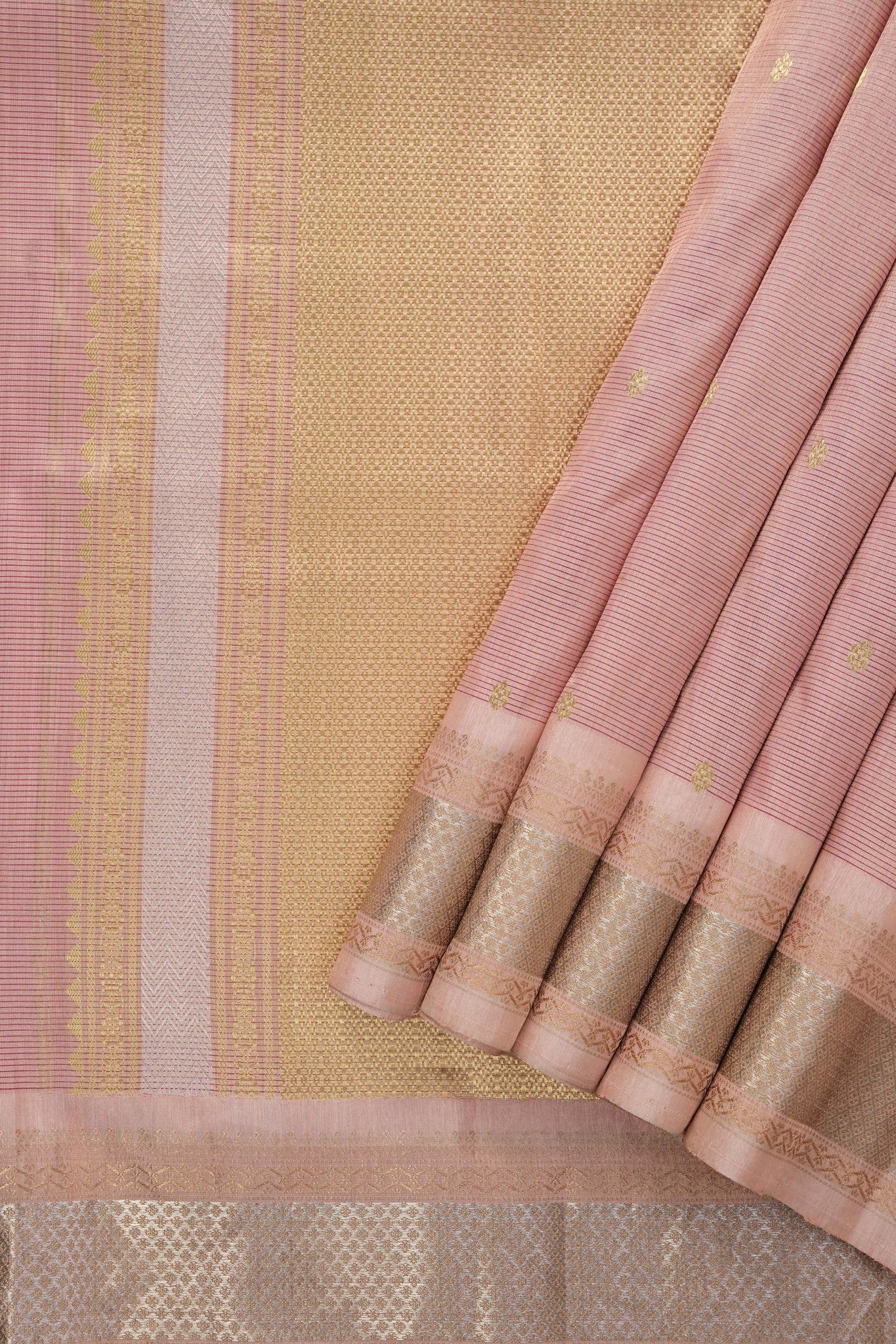 Work - Peach tissue cotton Paithani saree adorned with floral butta all over body, rich silver gold zari border, and a vibrant designed pallu.