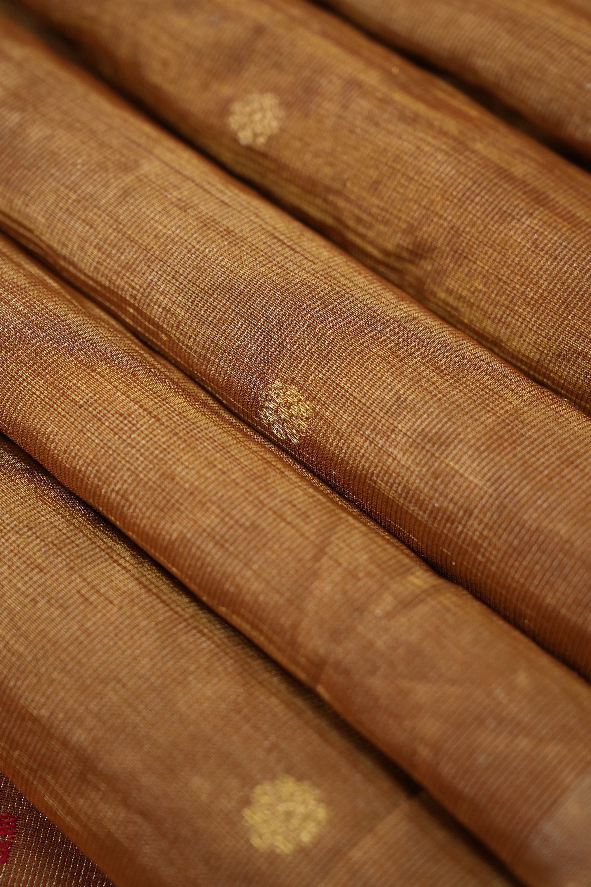 Work - Graceful rust-coloured cotton Paithani saree adorned with a traditional Muniya border and intricate small gold buttas. The soft cotton fabric offers comfort with a rich traditional charm. Perfect for festive occasions or cultural events, this saree beautifully blends elegance and heritage.