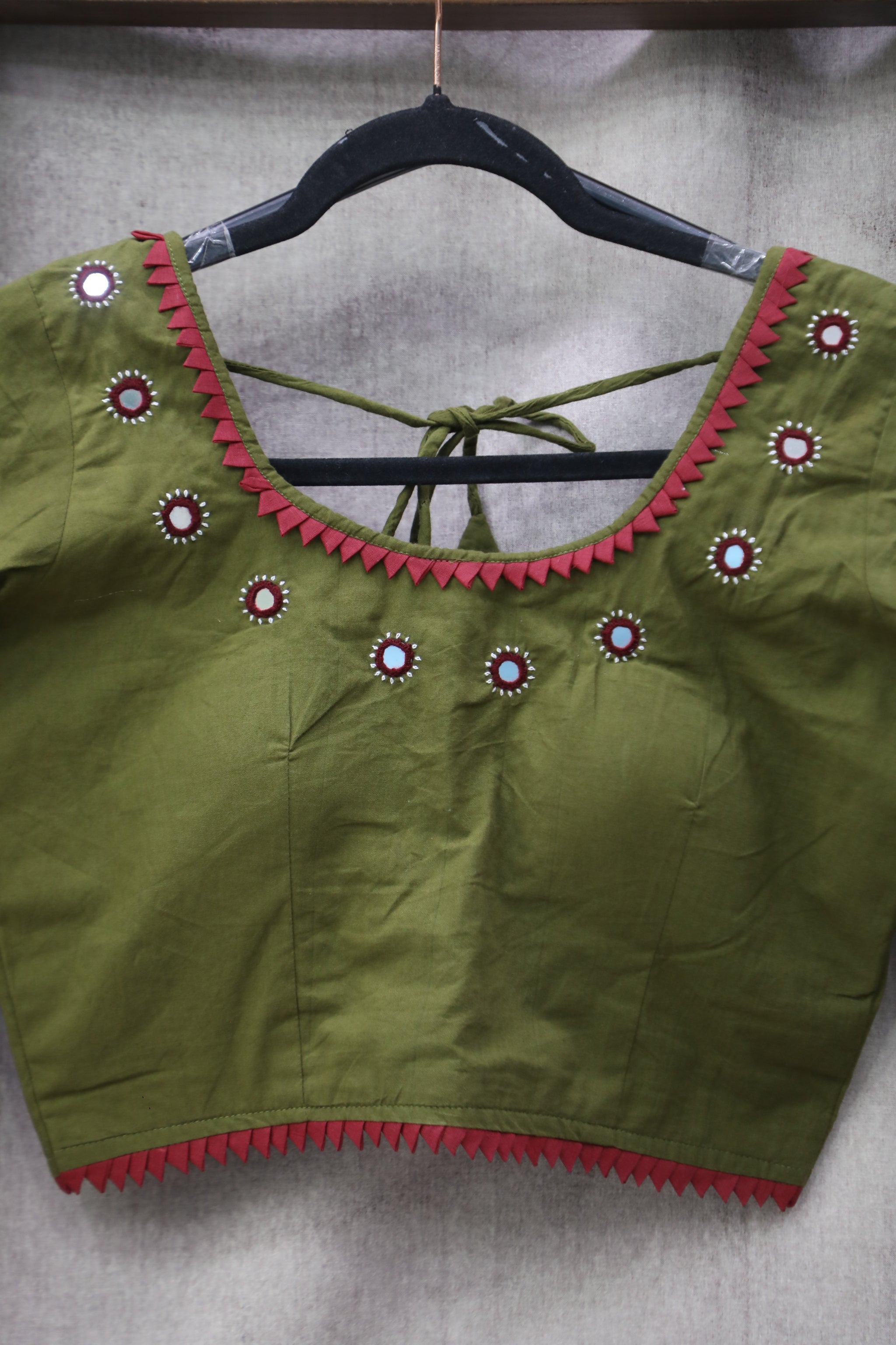 Mehndi green handblock printed cotton ajrakh blouse. Padded blouse with cotton lining, deep back with dori and back open. Adorned with mirror work on front neck line.