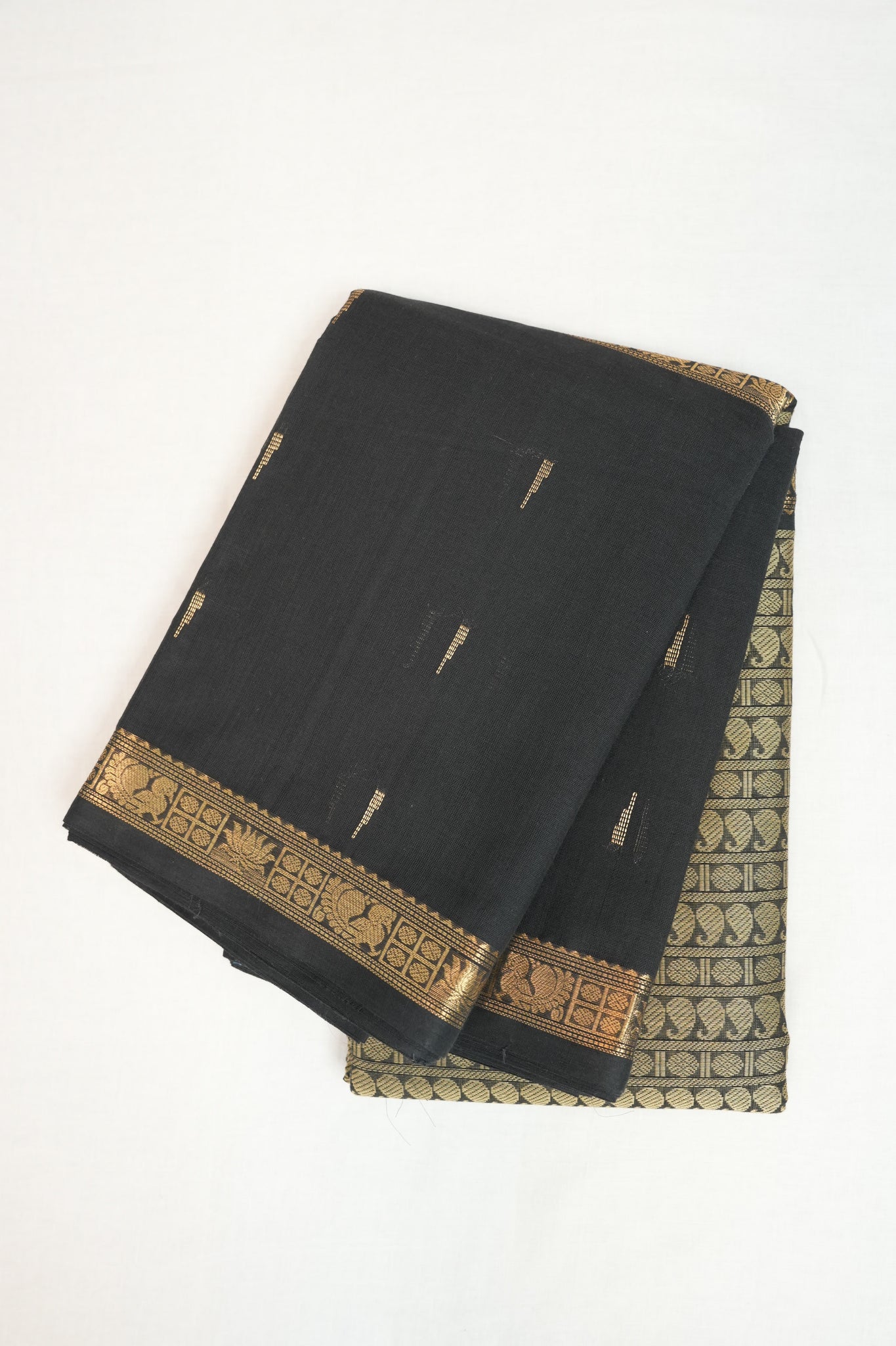 Work - This black saree features a rich gold zari border and pallu, intricately woven with traditional motifs including peacocks and lotus flowers, complemented by subtle patterns on the body.