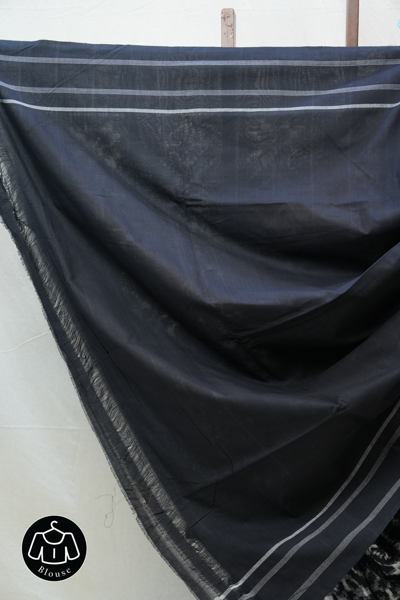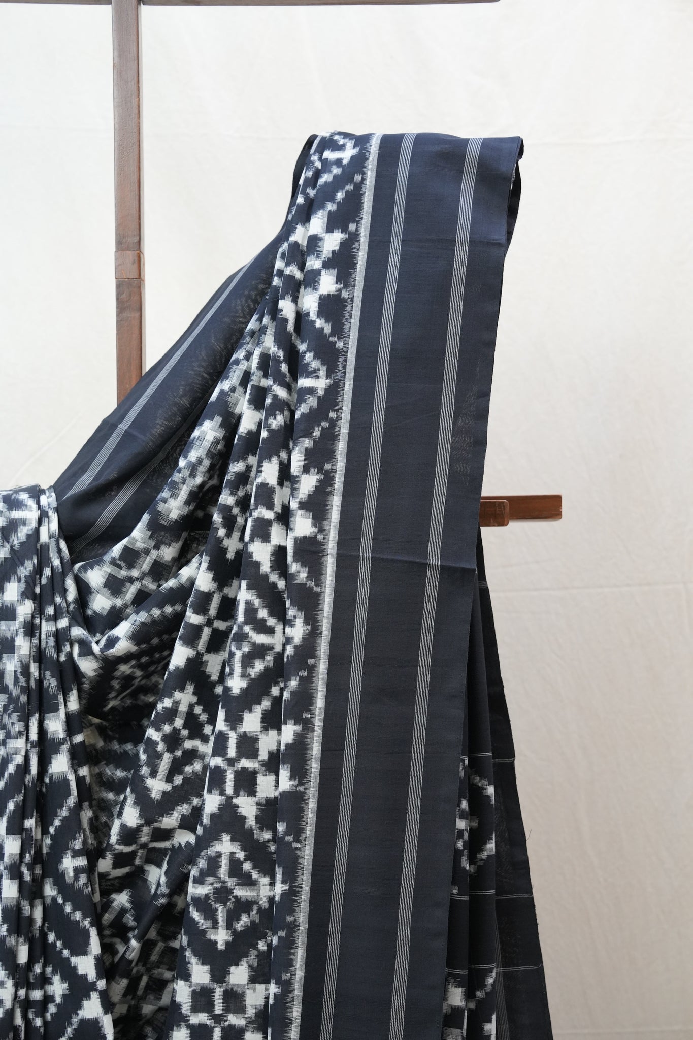 Work - This is a Pochampalli Cotton Ikat saree with black color on the body, complemented by an ikat patterned border and striped pallu.