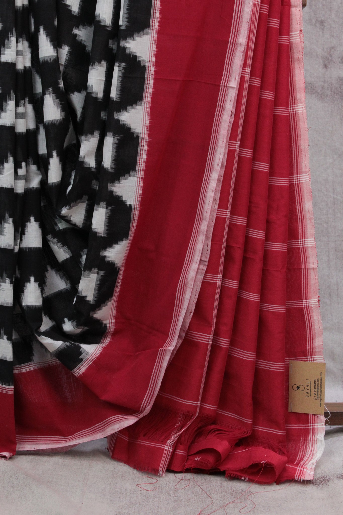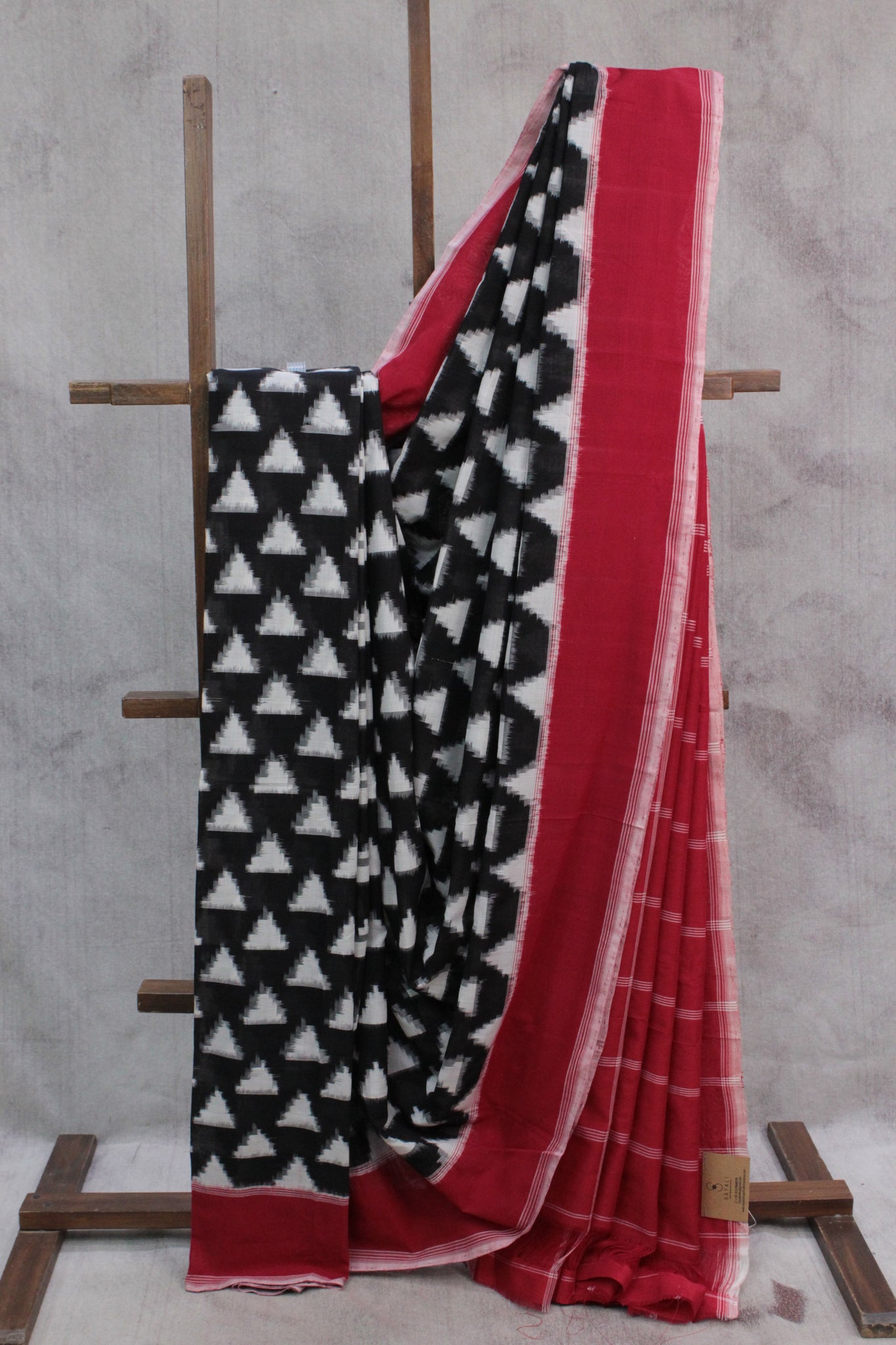 Work - Black Ikat saree with bold white triangle motifs, paired with a deep red border and a pallu featuring subtle checkered lines for a striking traditional look.