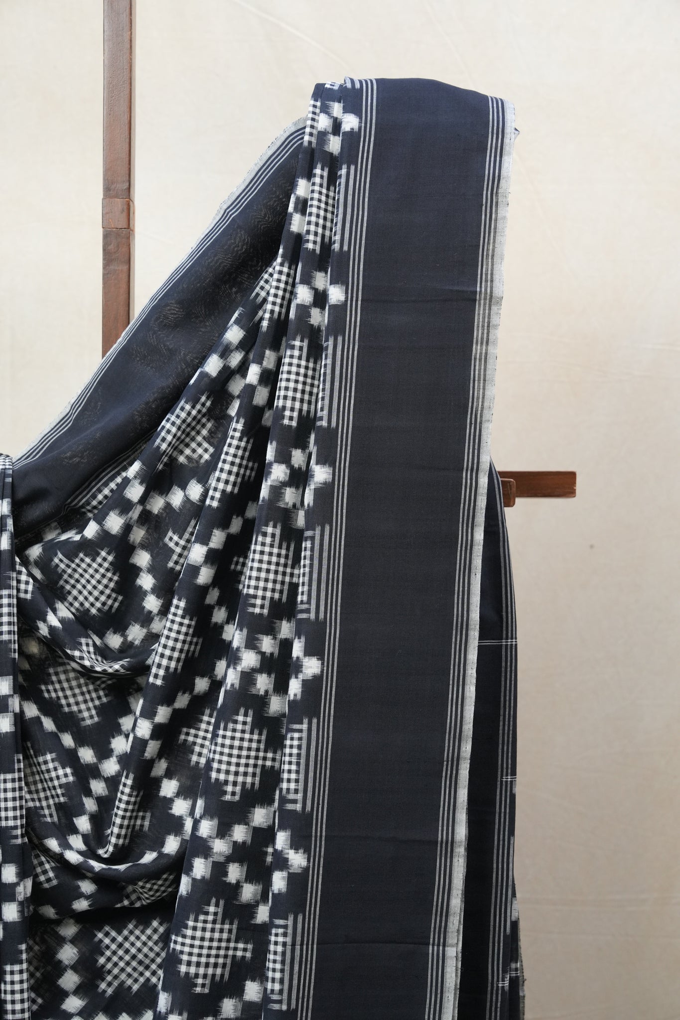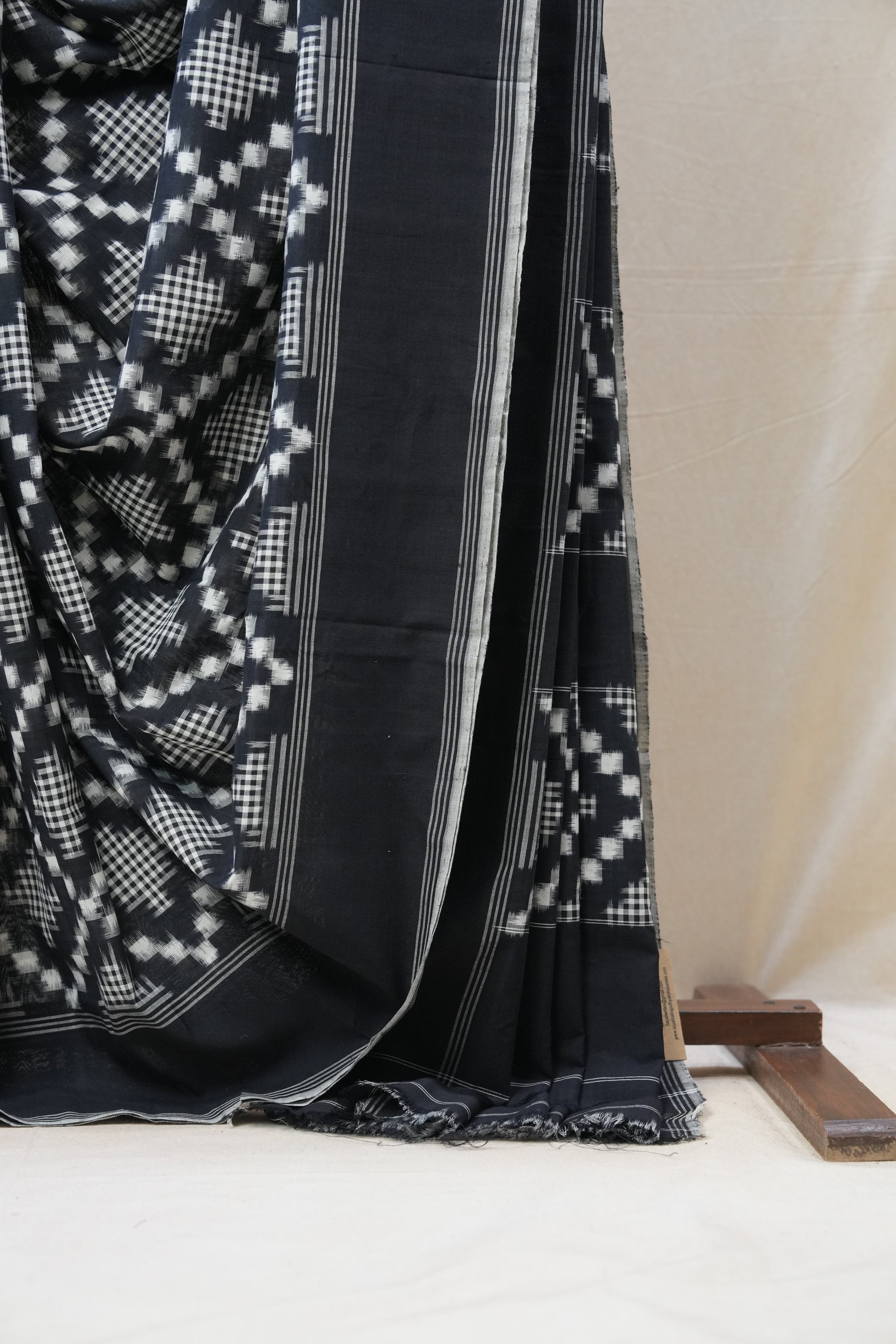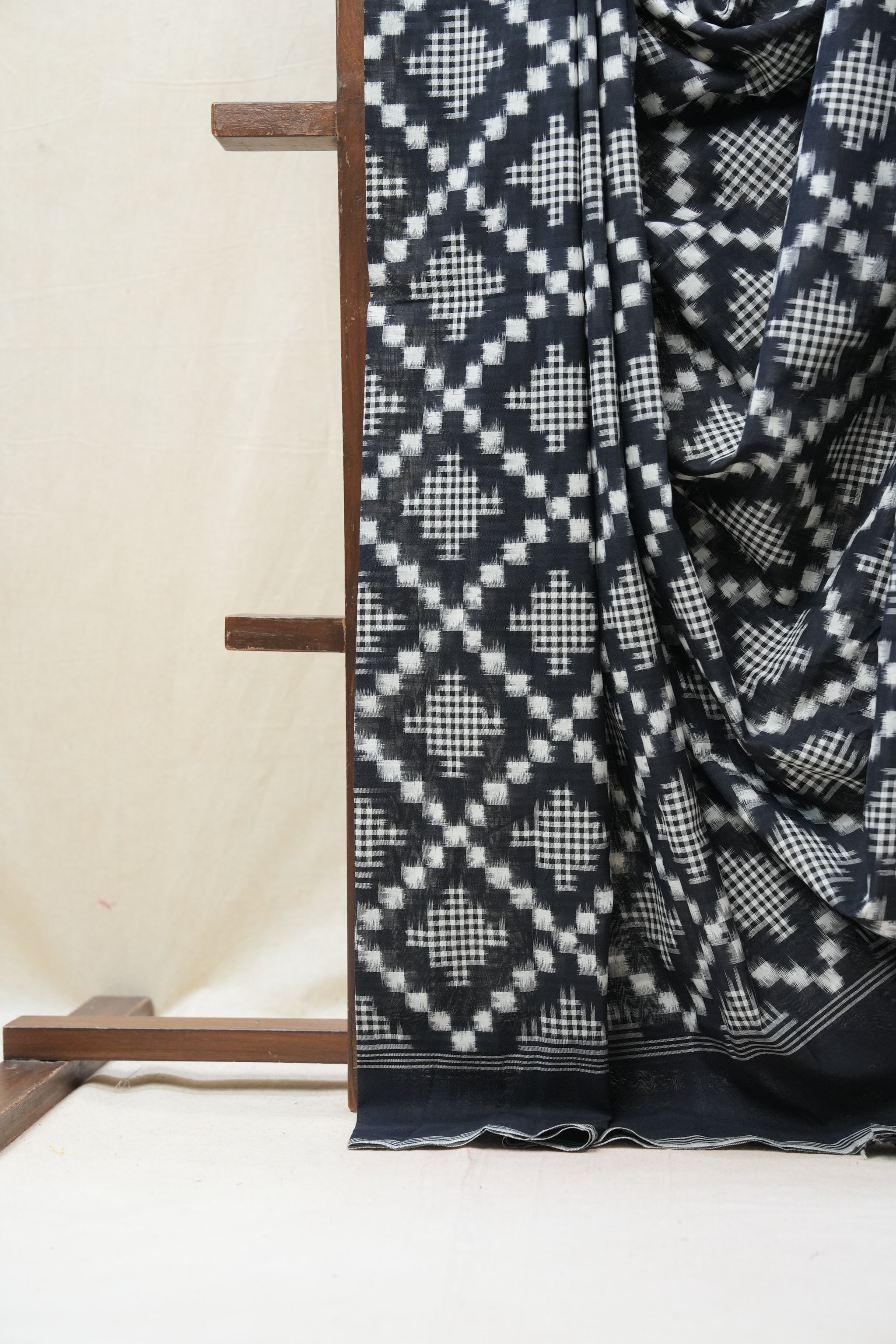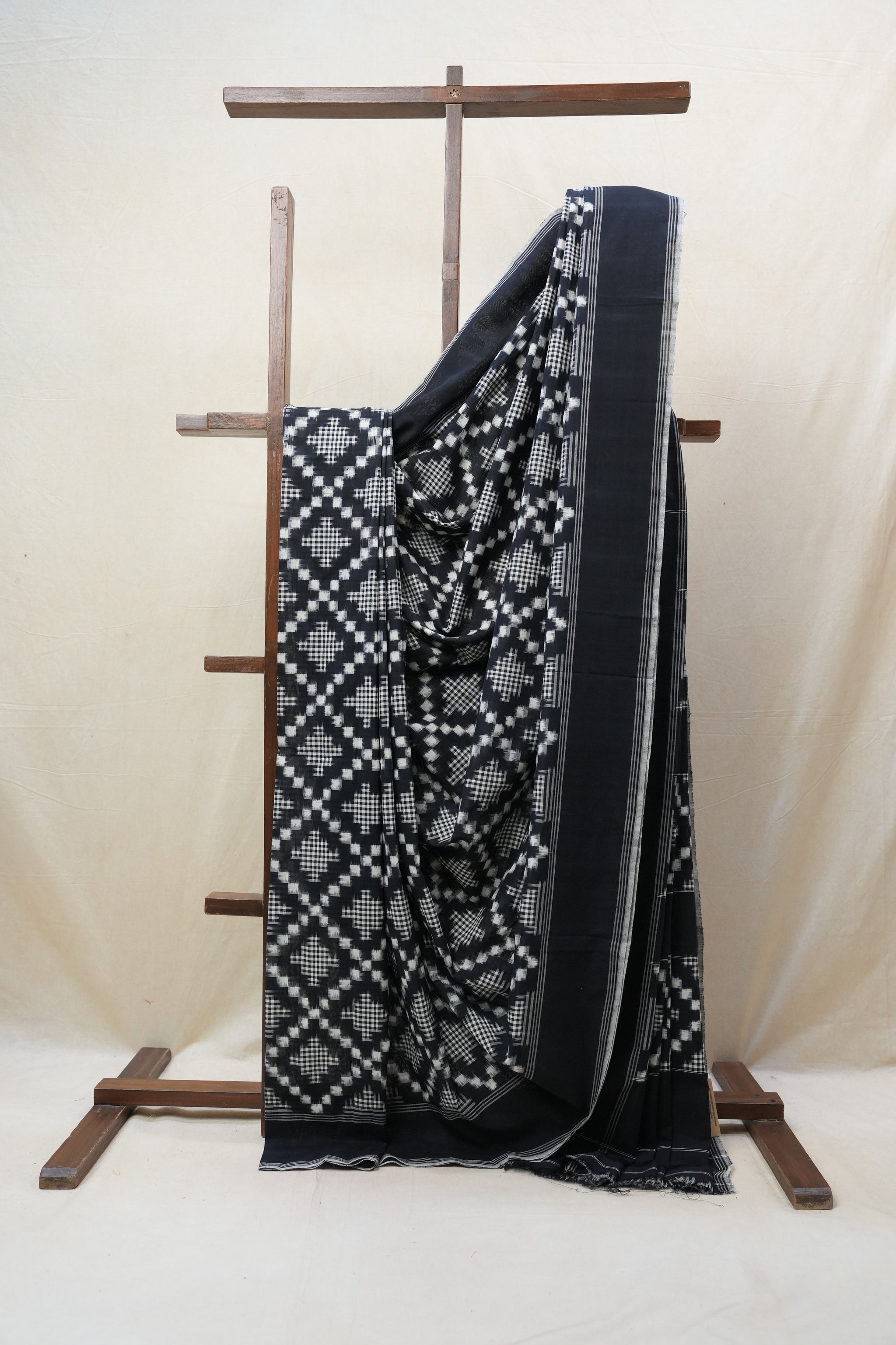 Work - This is a Pochampalli Cotton Ikat saree with black color body, complemented by an ikat patterned border and pallu.
