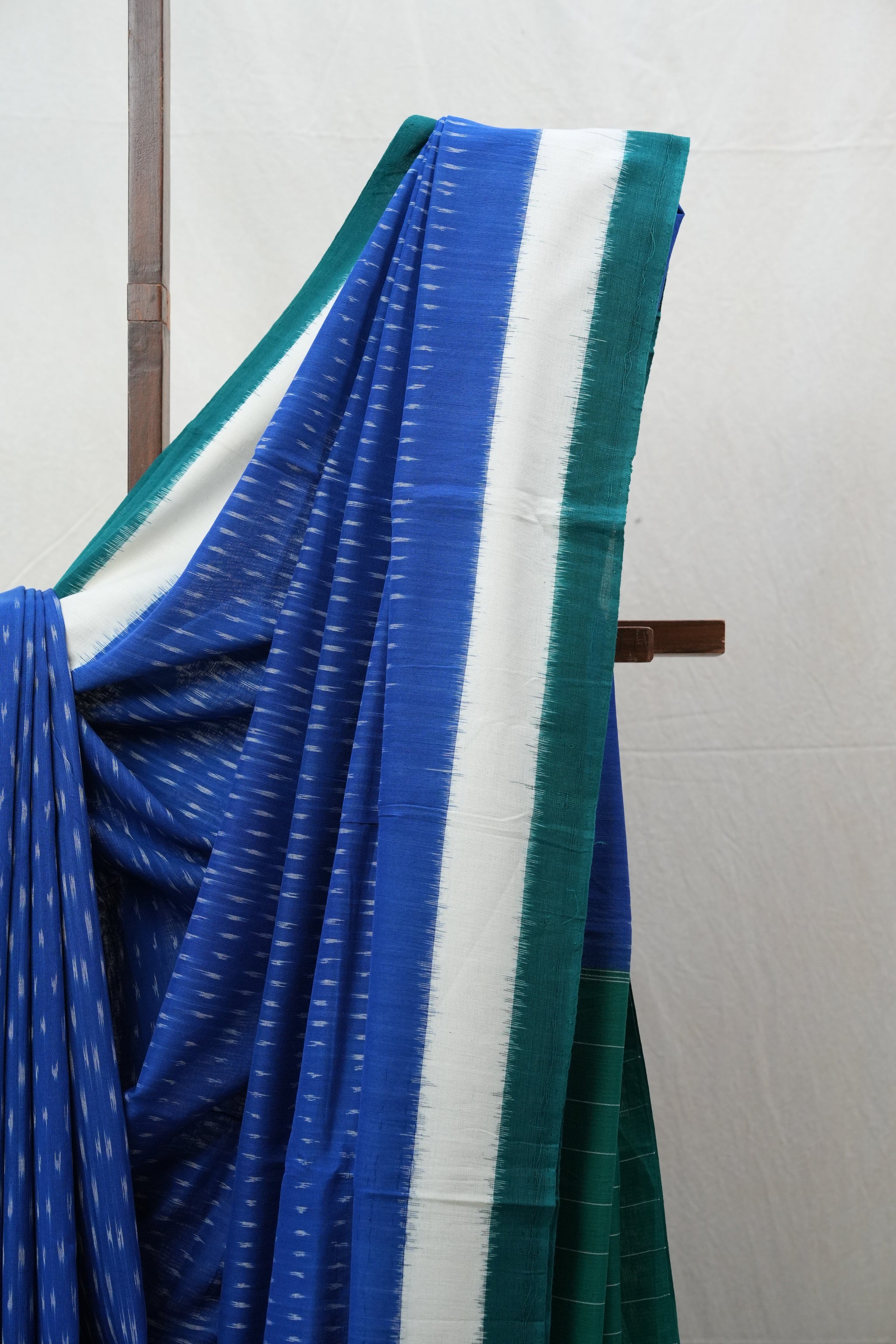 Work - This is a Pochampalli Cotton Ikat saree with blue color on the body, complemented by an ikat patterned border and striped pallu.