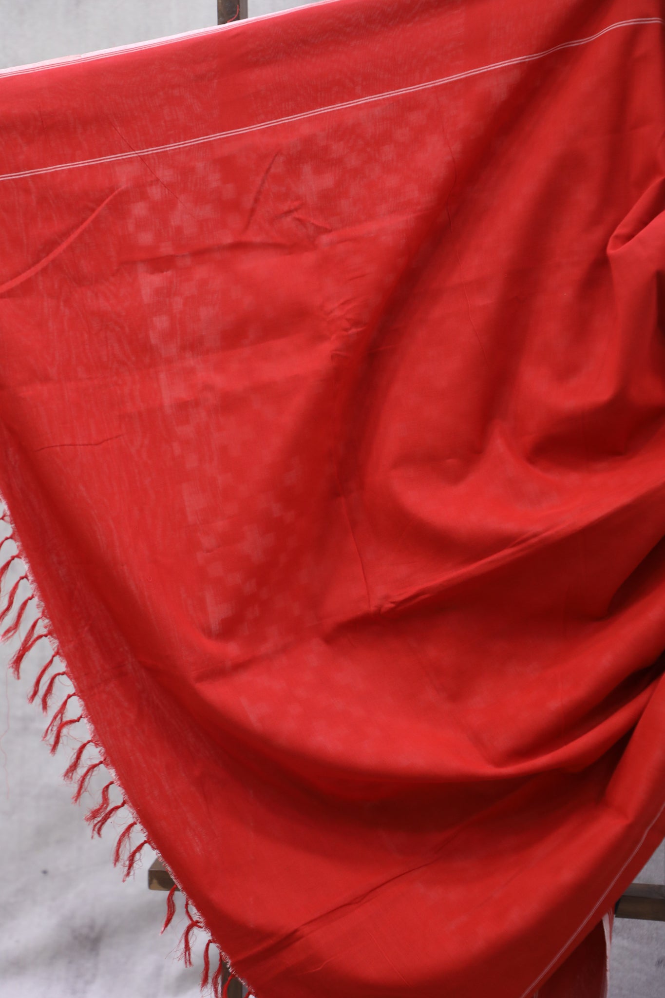Work - Traditional ikat weaving with geometric cross motifs on the body and bold red pallu with similar detailing.