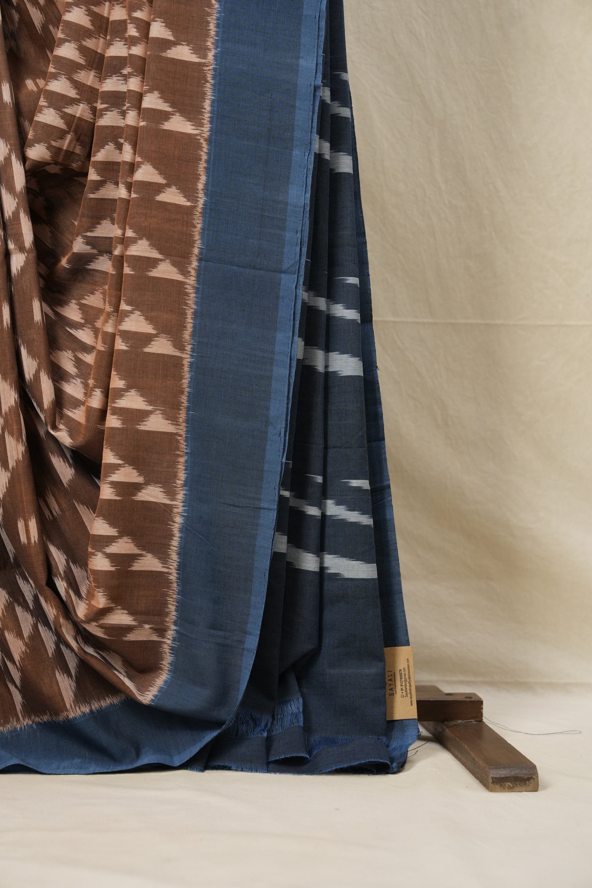 Work - This is a Pochampalli Cotton Ikat saree with brown color body, complemented by an ikat patterned border and pallu.