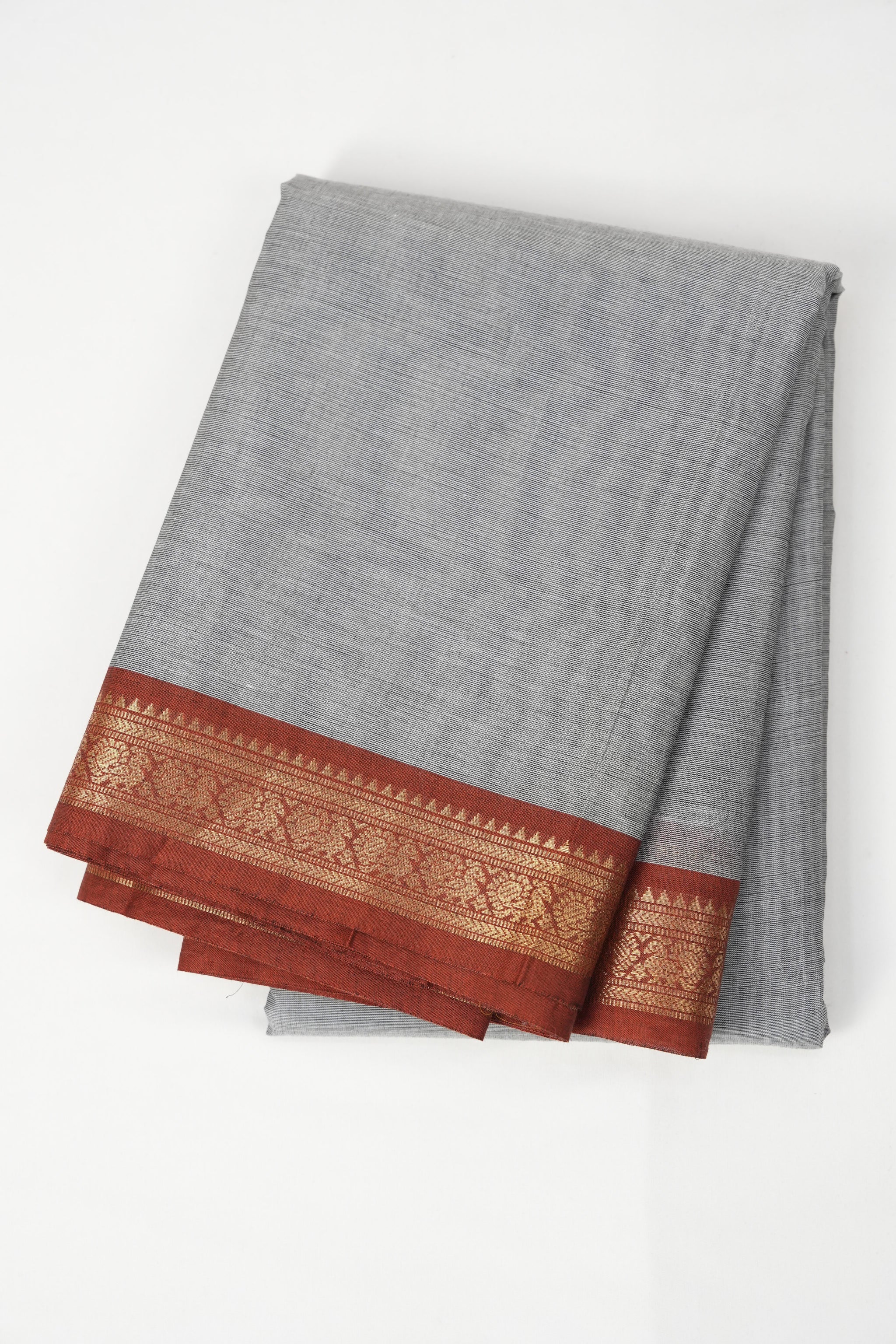 Work -The saree is in a grey color with plain body and contrast brick red border with small gold zari and temple. The border is highlighted with woven patterns.