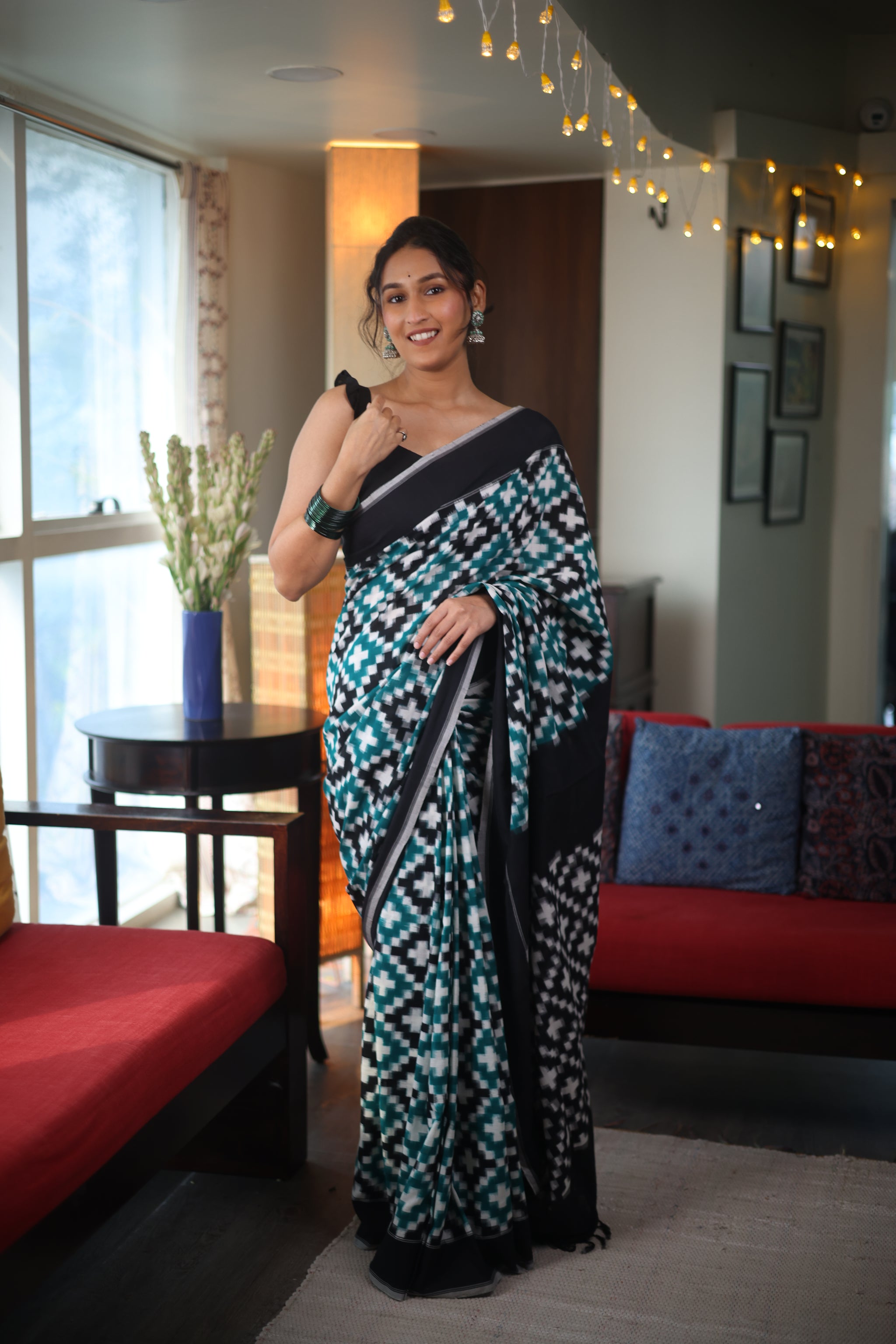 Green-Black Pochampalli Cotton Ikat Saree - SRGBPCIS347