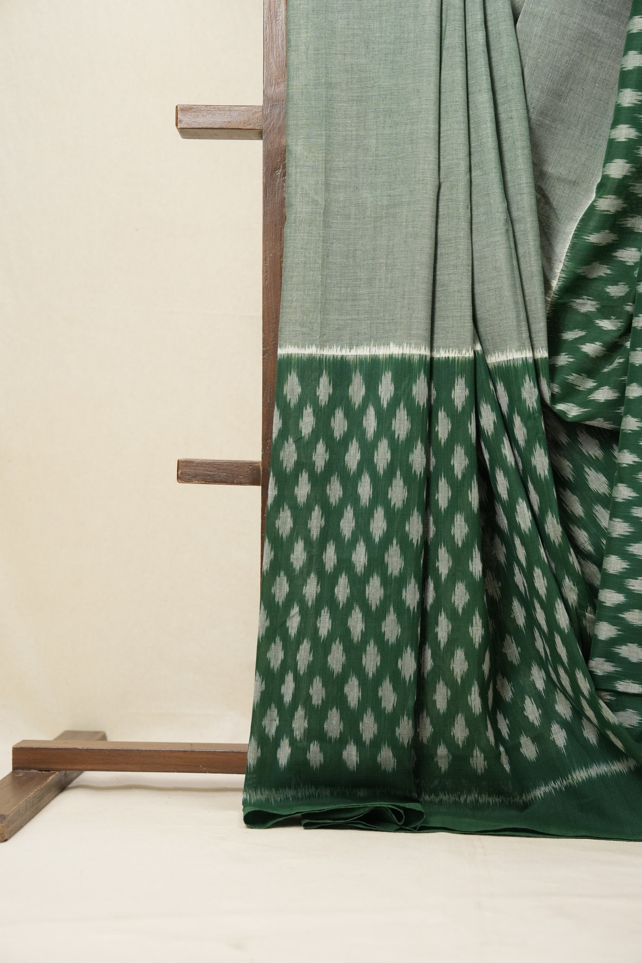Work - This is a Pochampalli Cotton Ikat saree with green color body, complemented by an ikat patterned border and pallu.