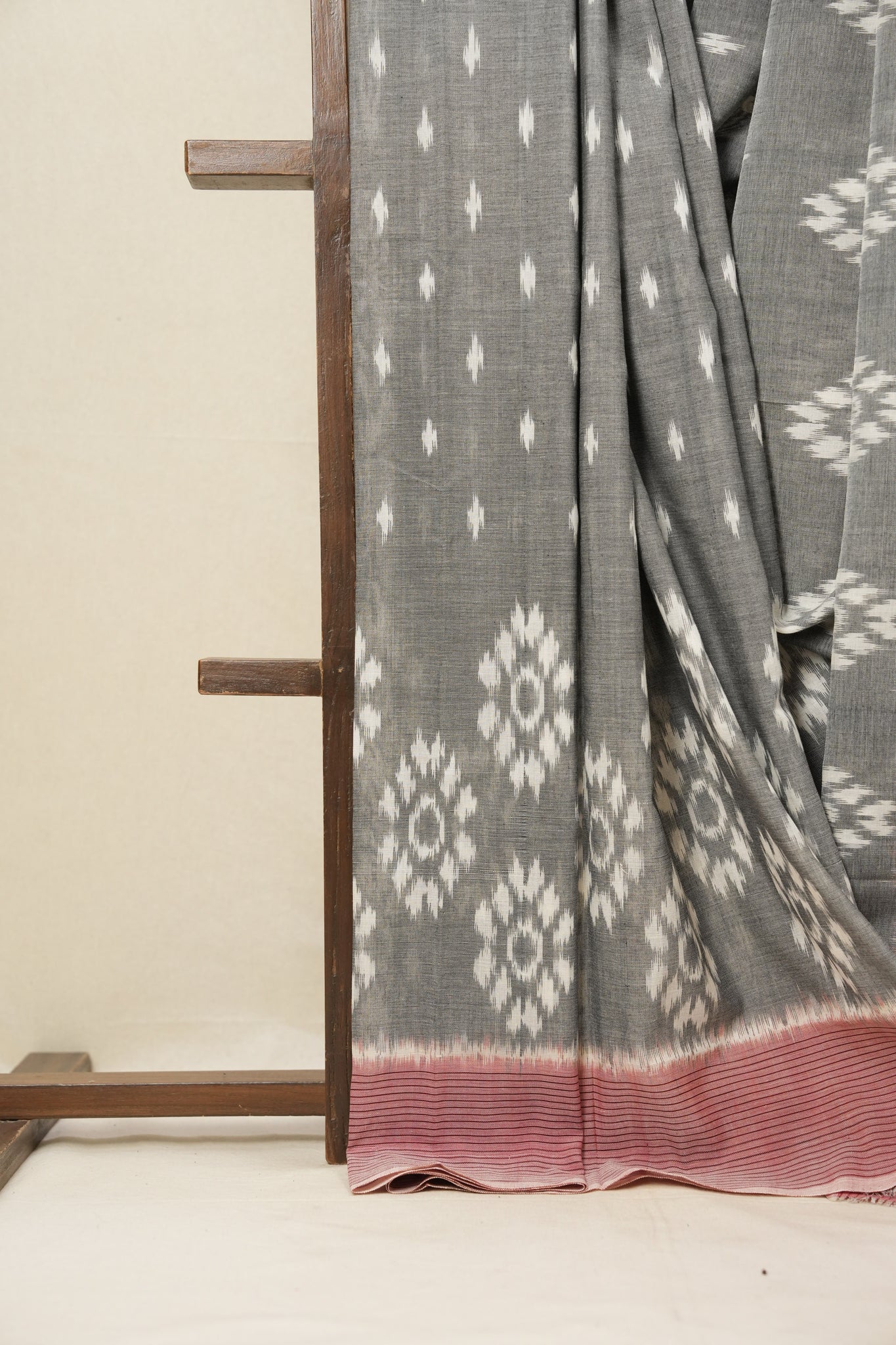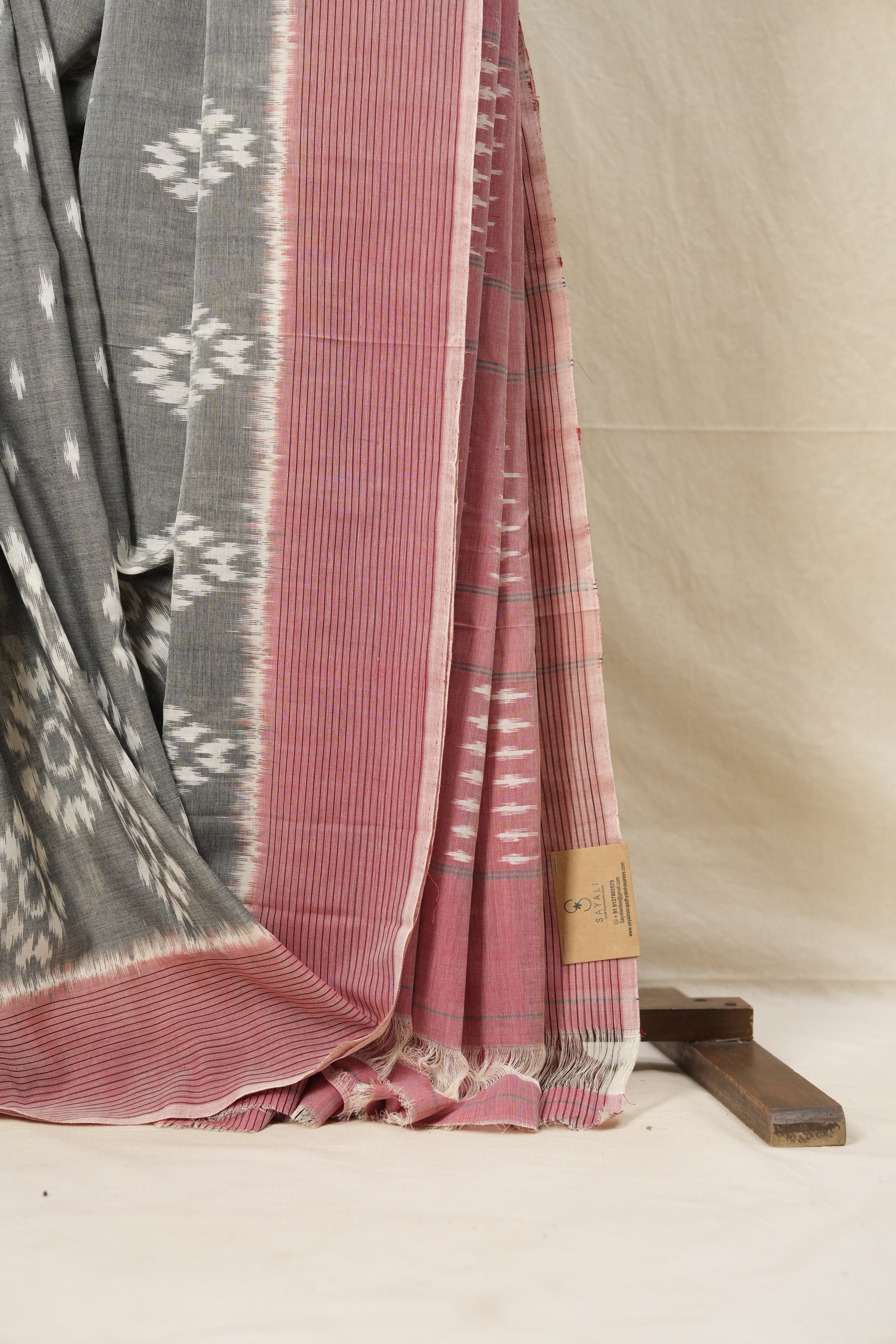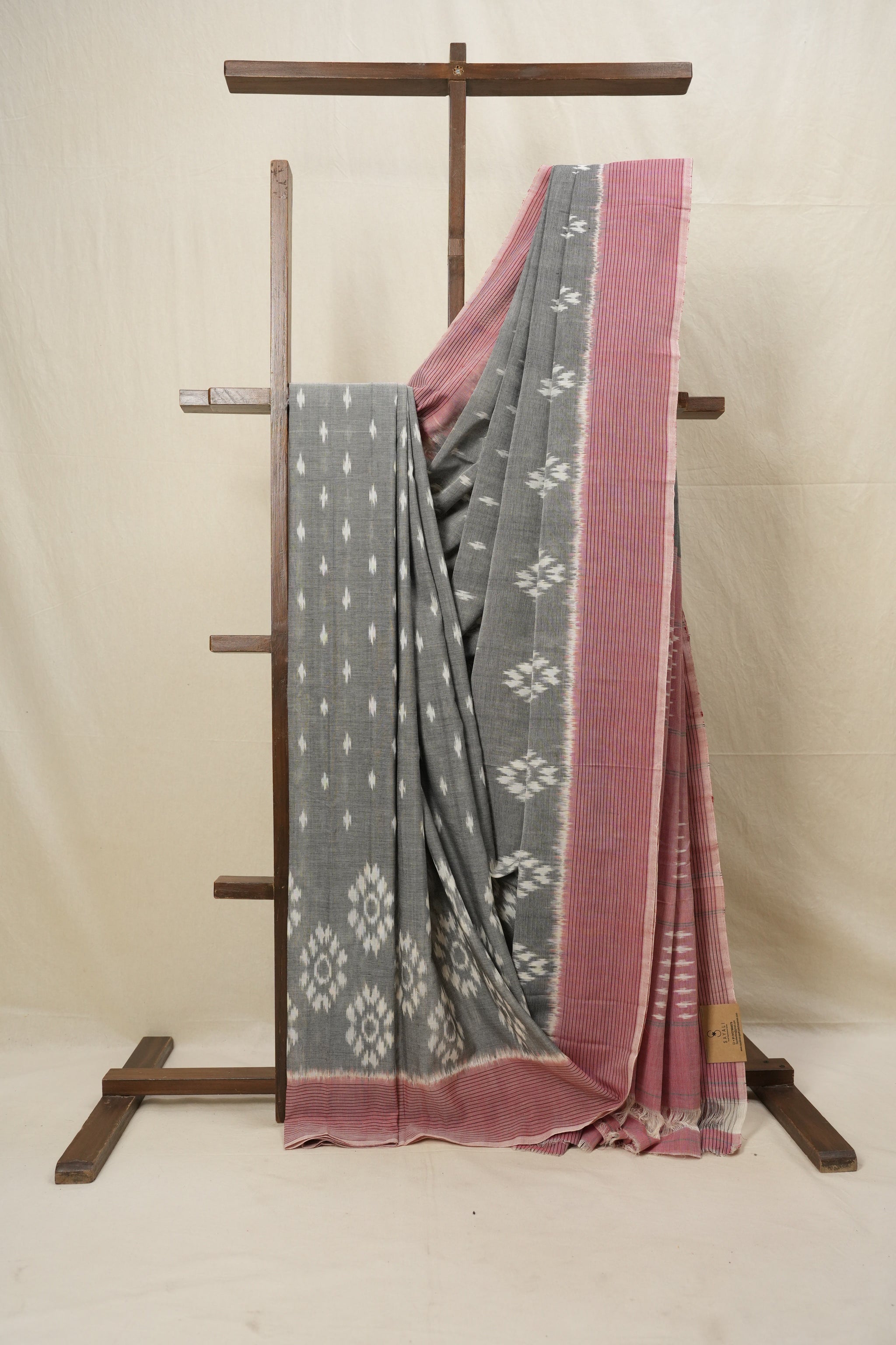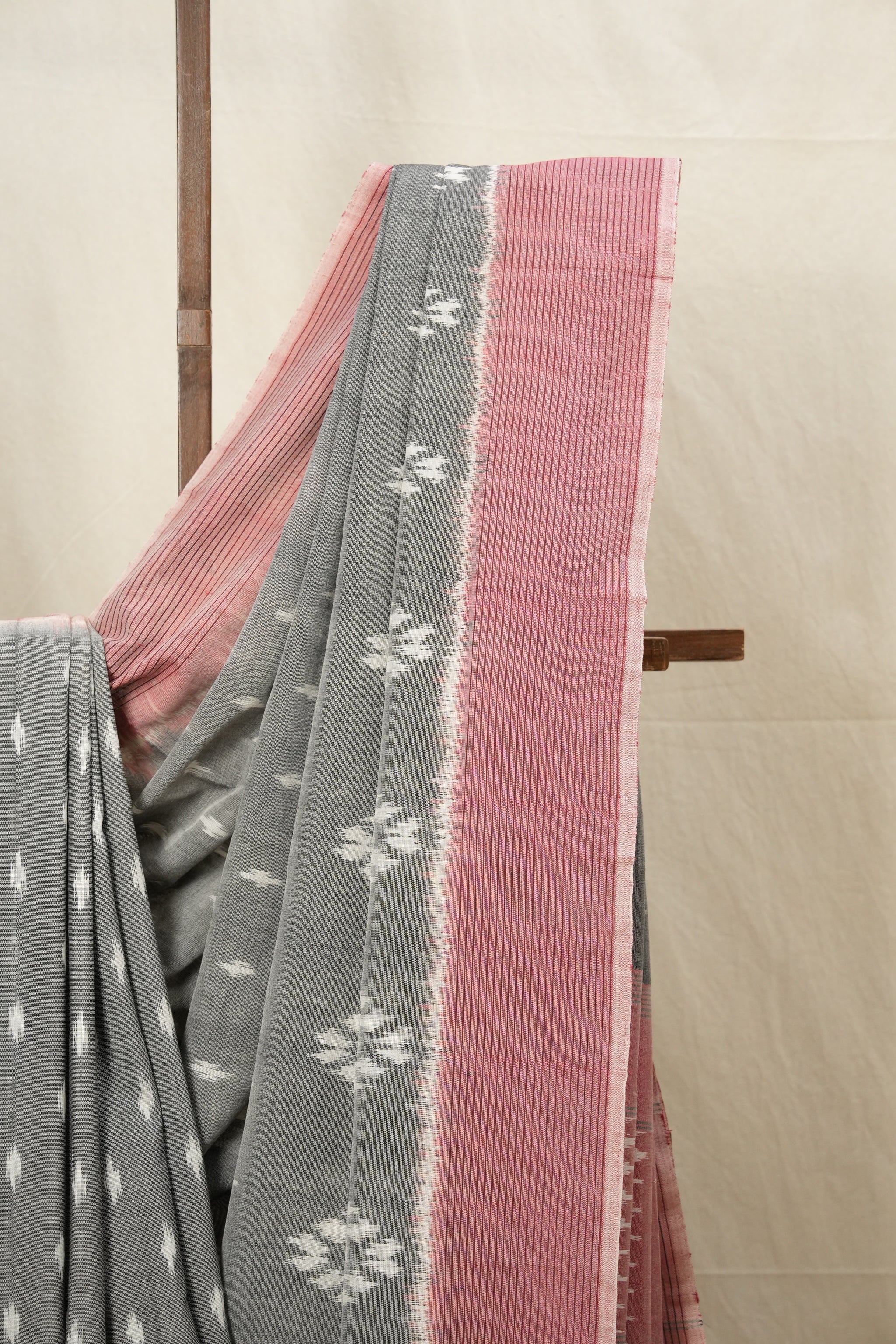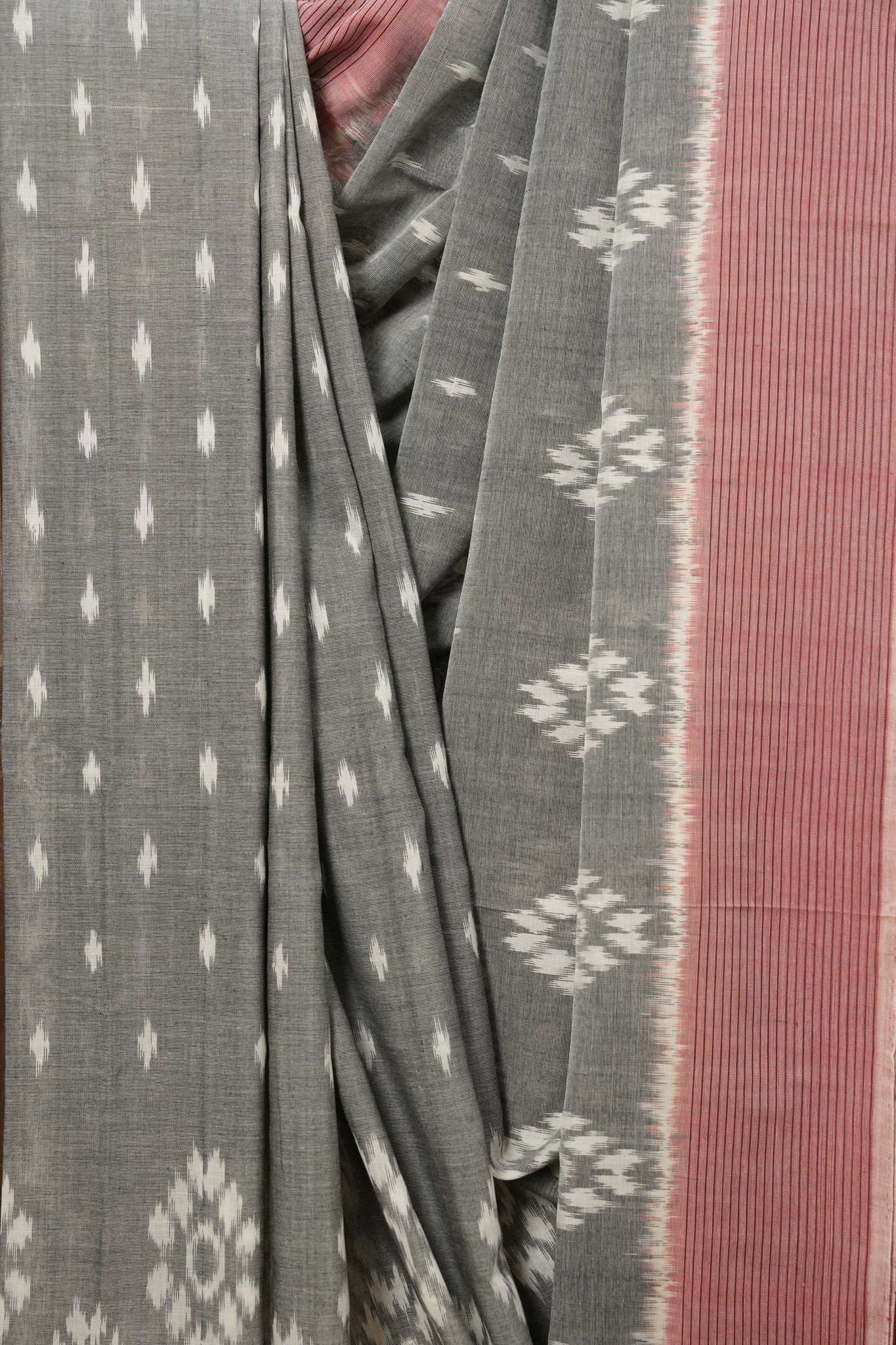 Work - This is a Pochampalli Cotton Ikat saree with grey and white color body, complemented by an ikat patterned border and pallu.