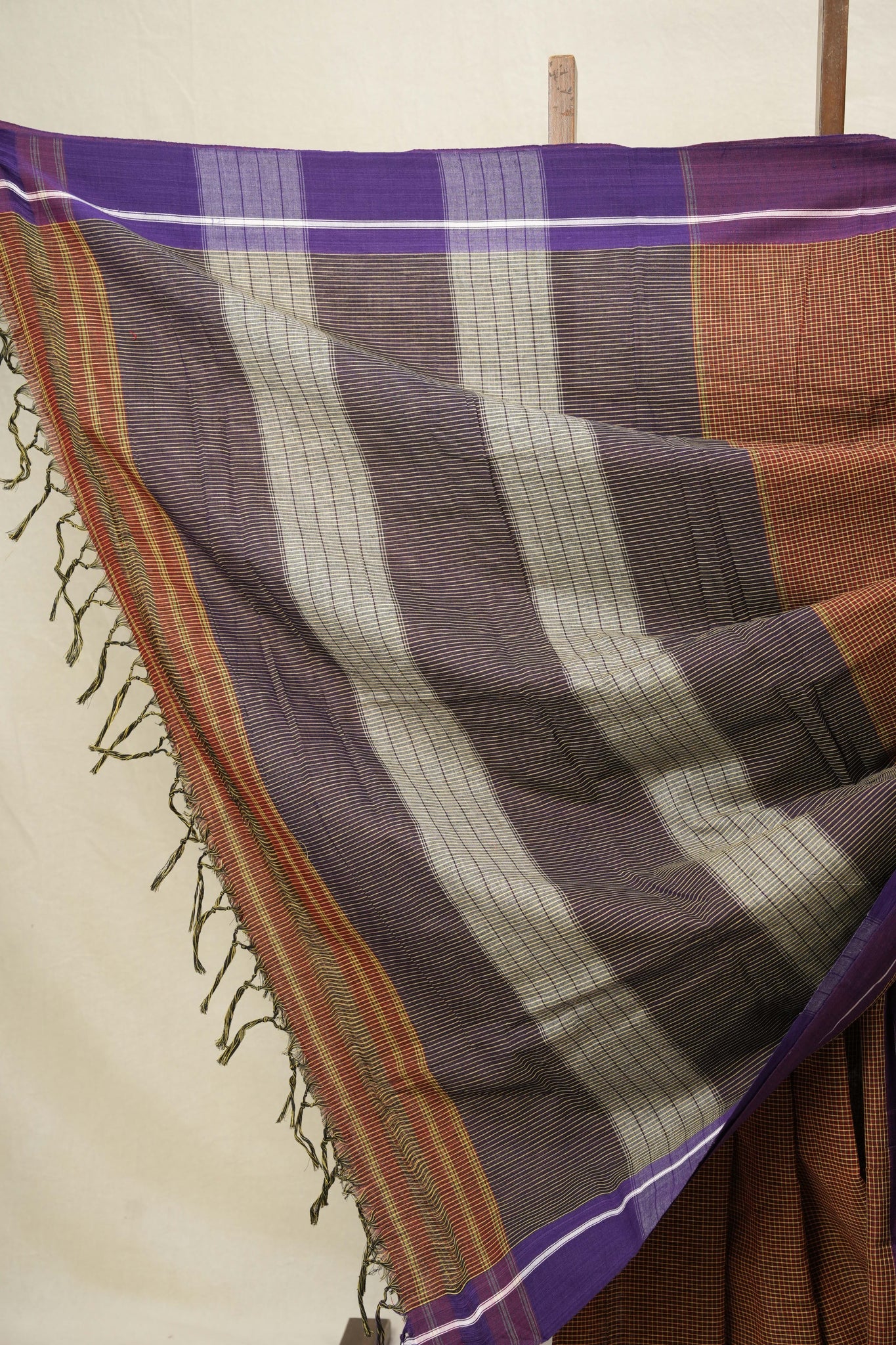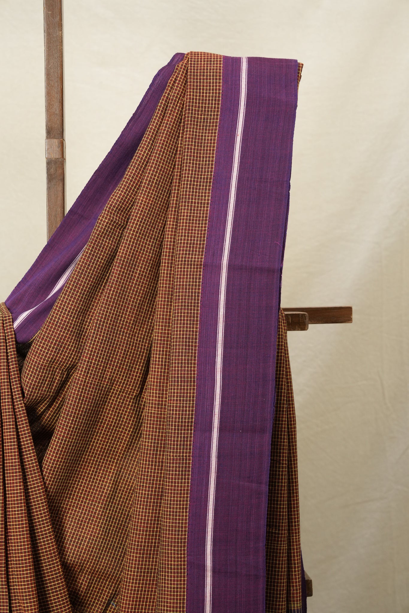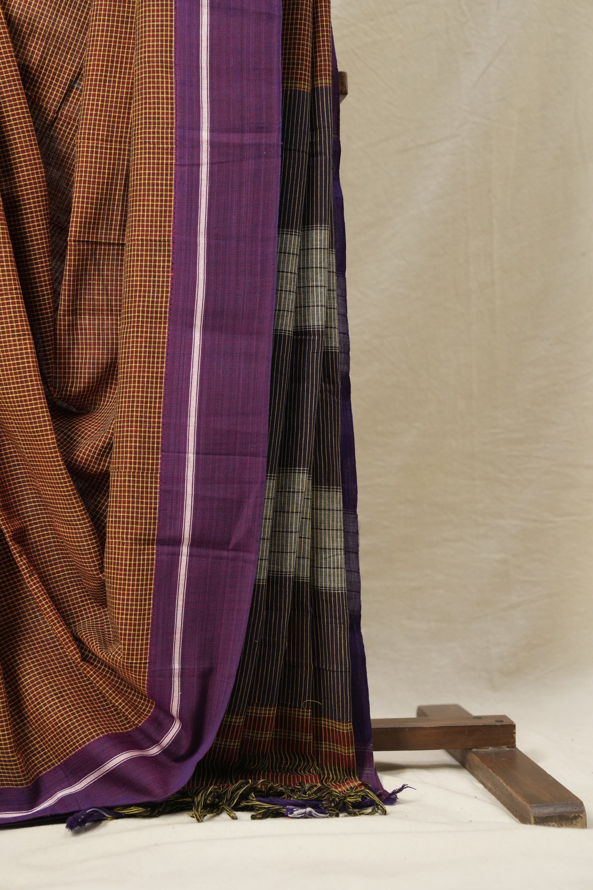 Work - The patteda anchu saree features a maroon checkered body with an purple striped border, and a pallu section with broad stripes.