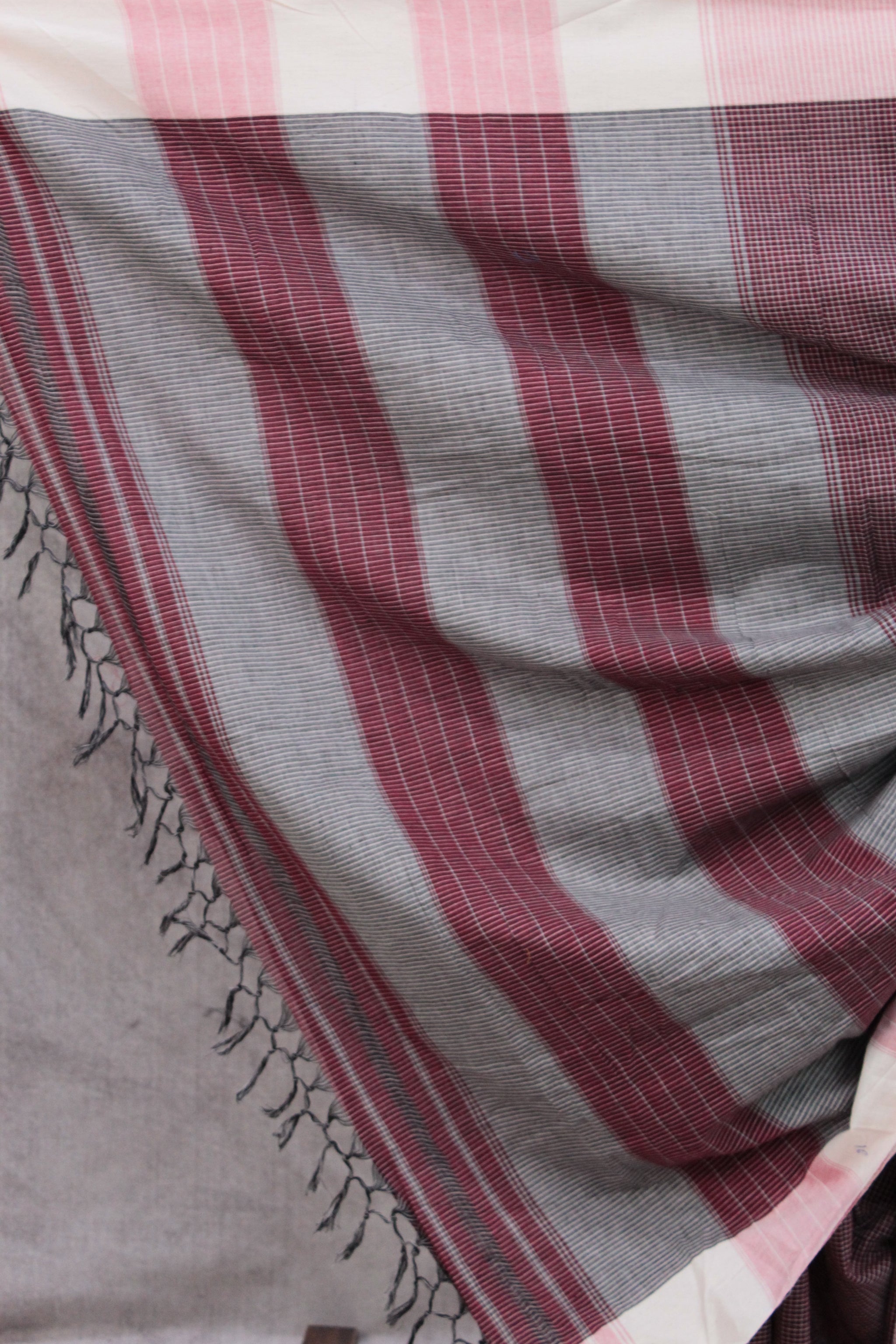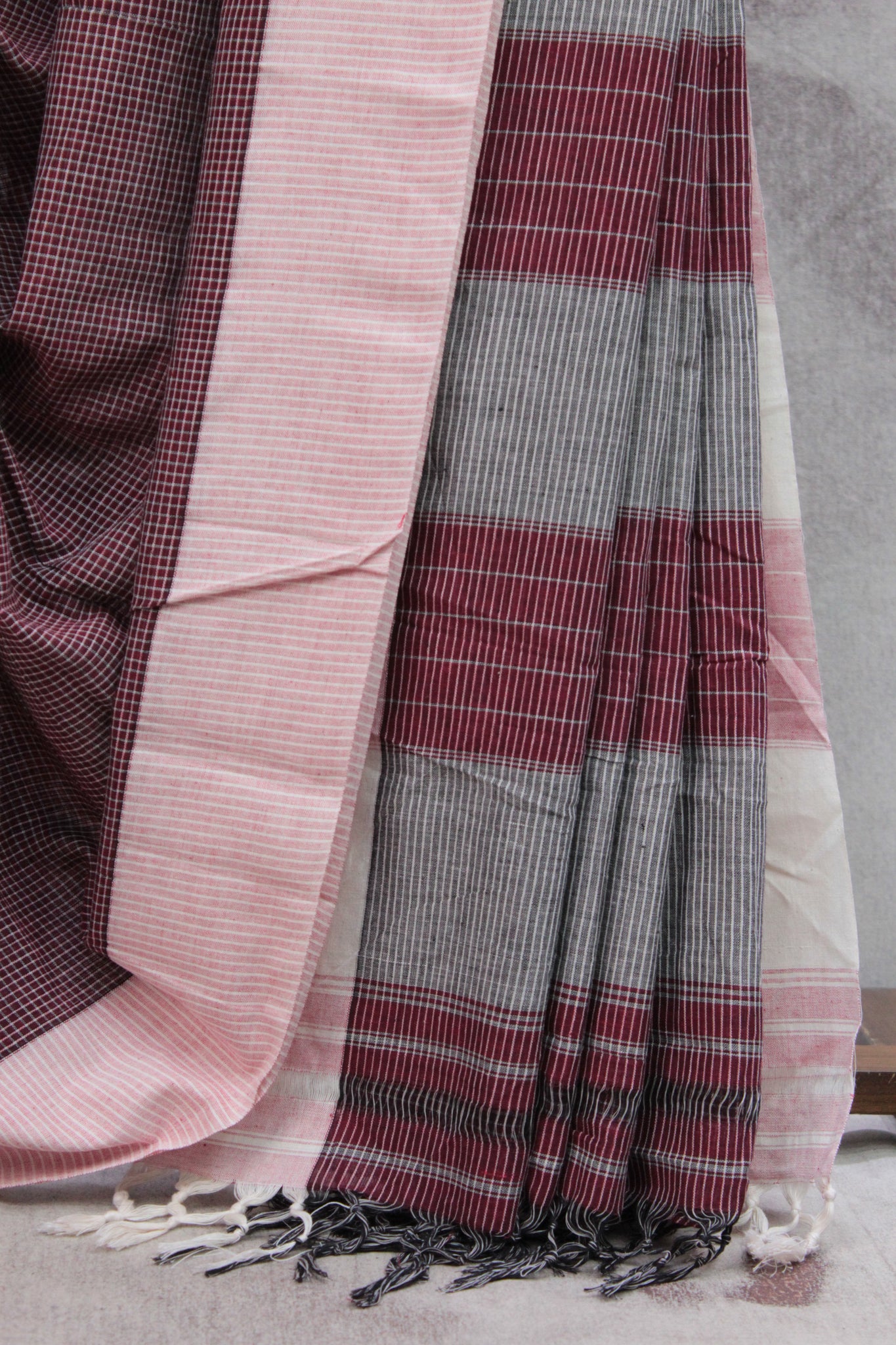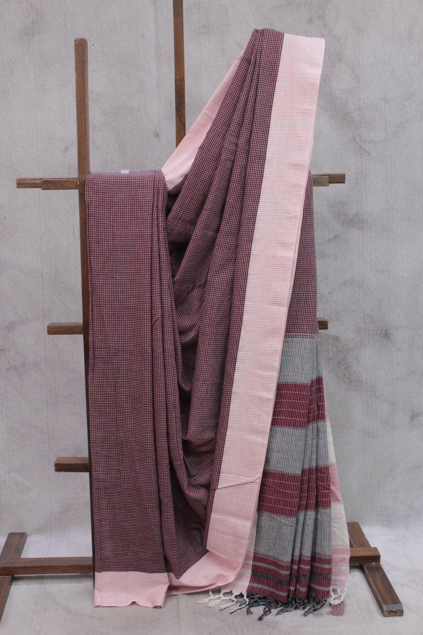 Work - The patteda anchu saree features a maroon body with small checks, a light pink border, and a pallu with grey and light pink stripes.