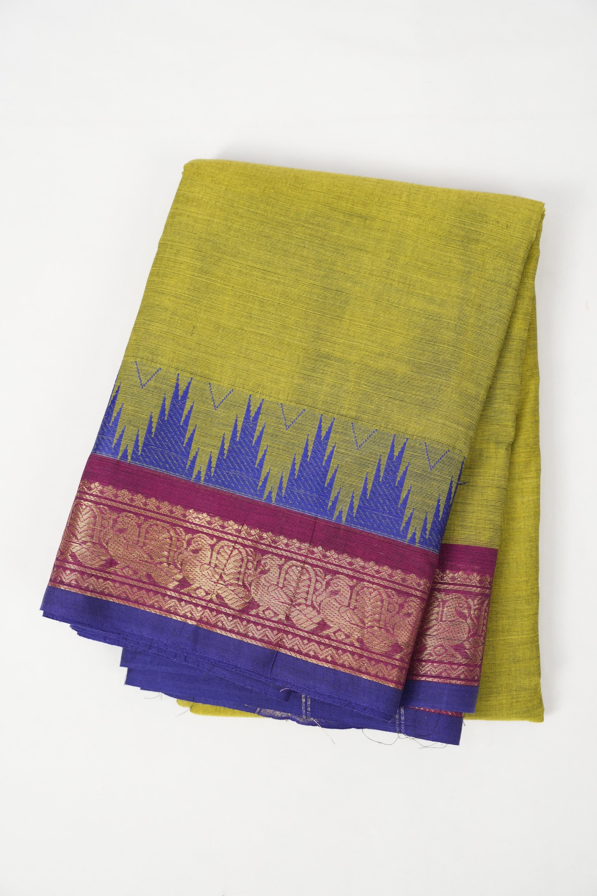 Work -The saree is in a mehandi green color with plain body and contrast big temple border with gold zari. The border is highlighted with woven patterns.