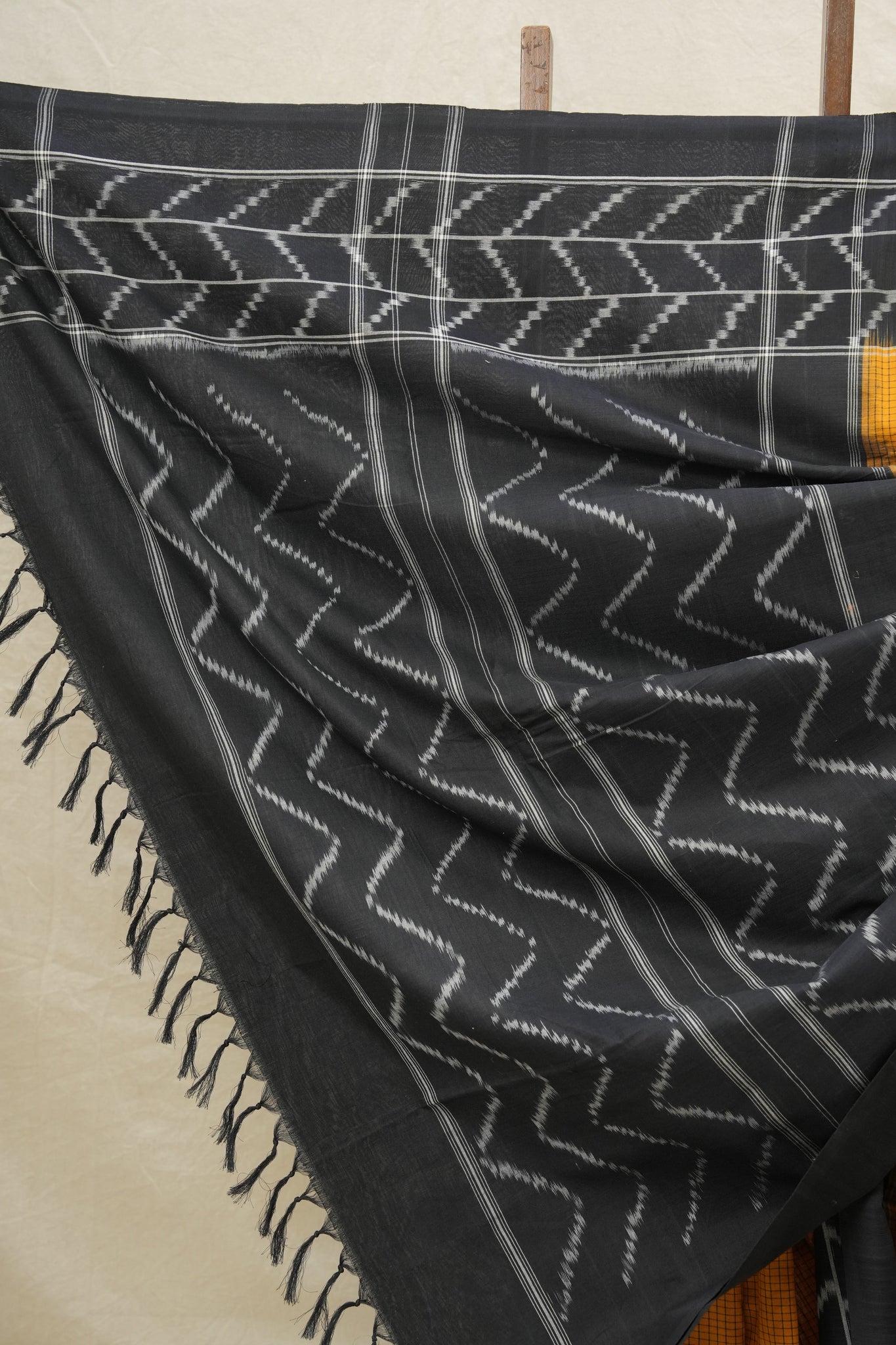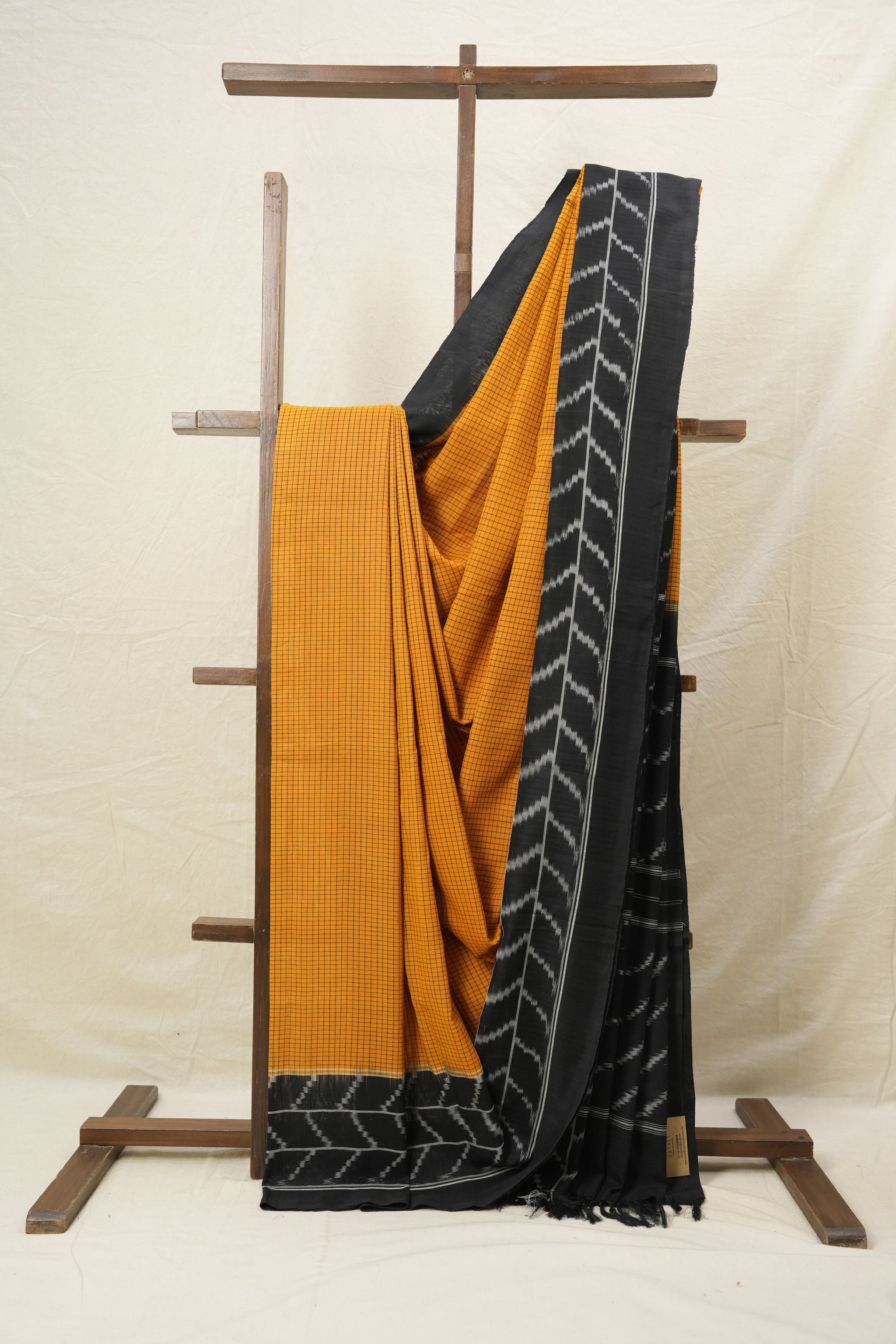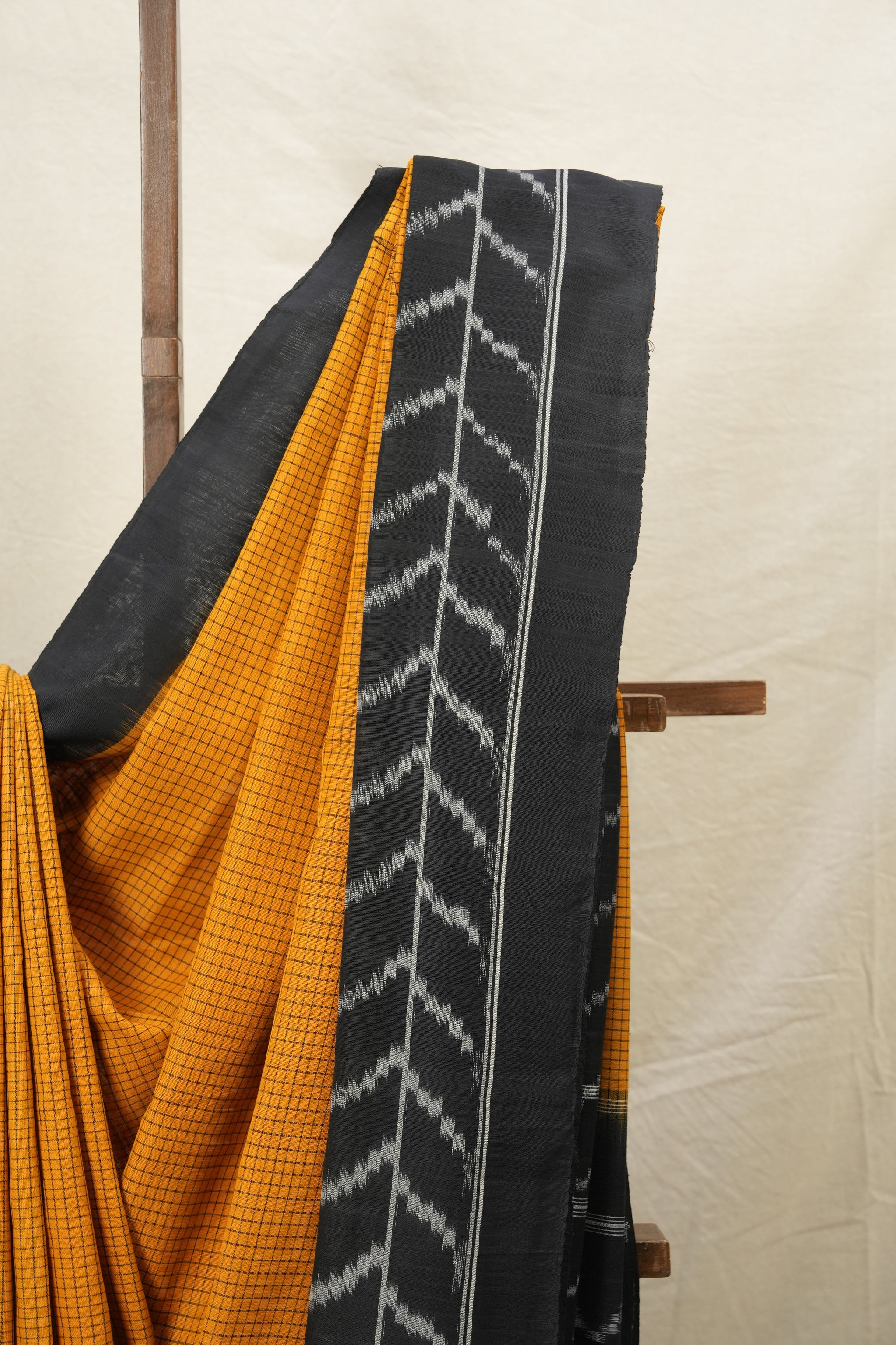 Work - This is a Pochampalli Cotton Ikat saree with yellow color checkered body, complemented by an ikat patterned border and pallu.