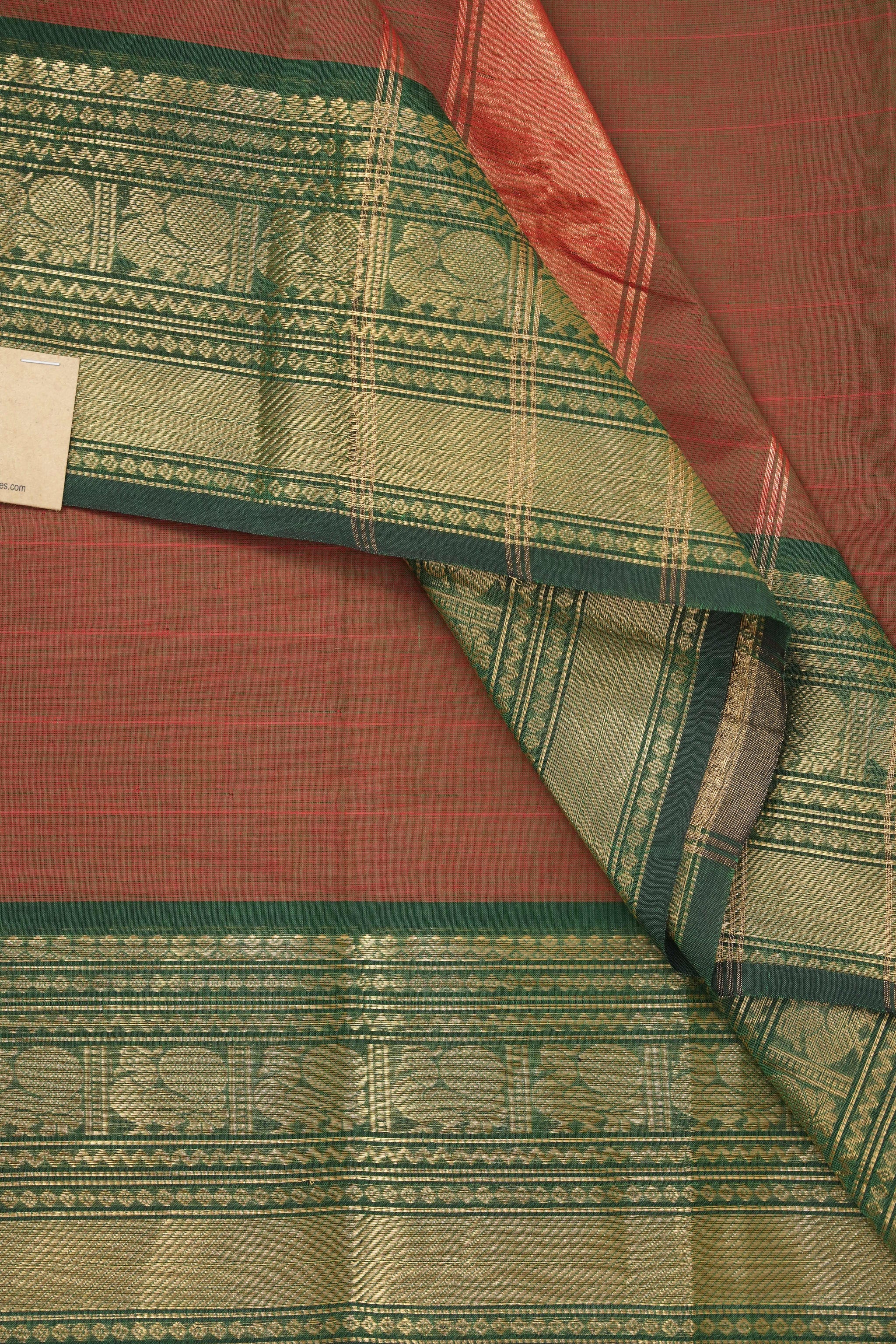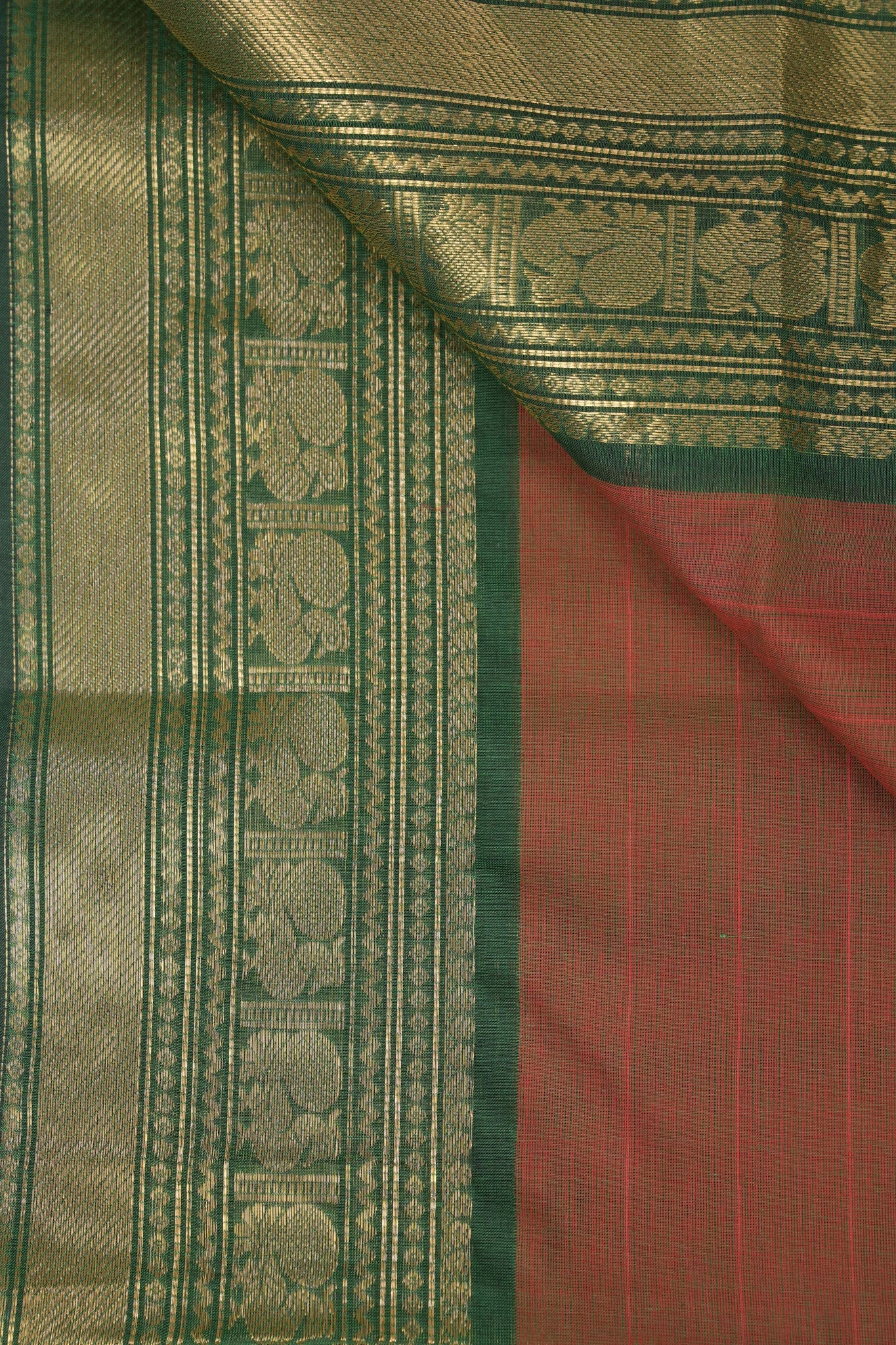 Work -The saree is in a two tone maroon color with horizontal stripes in body and contrast green border with gold zari . The border is highlighted with woven patterns.